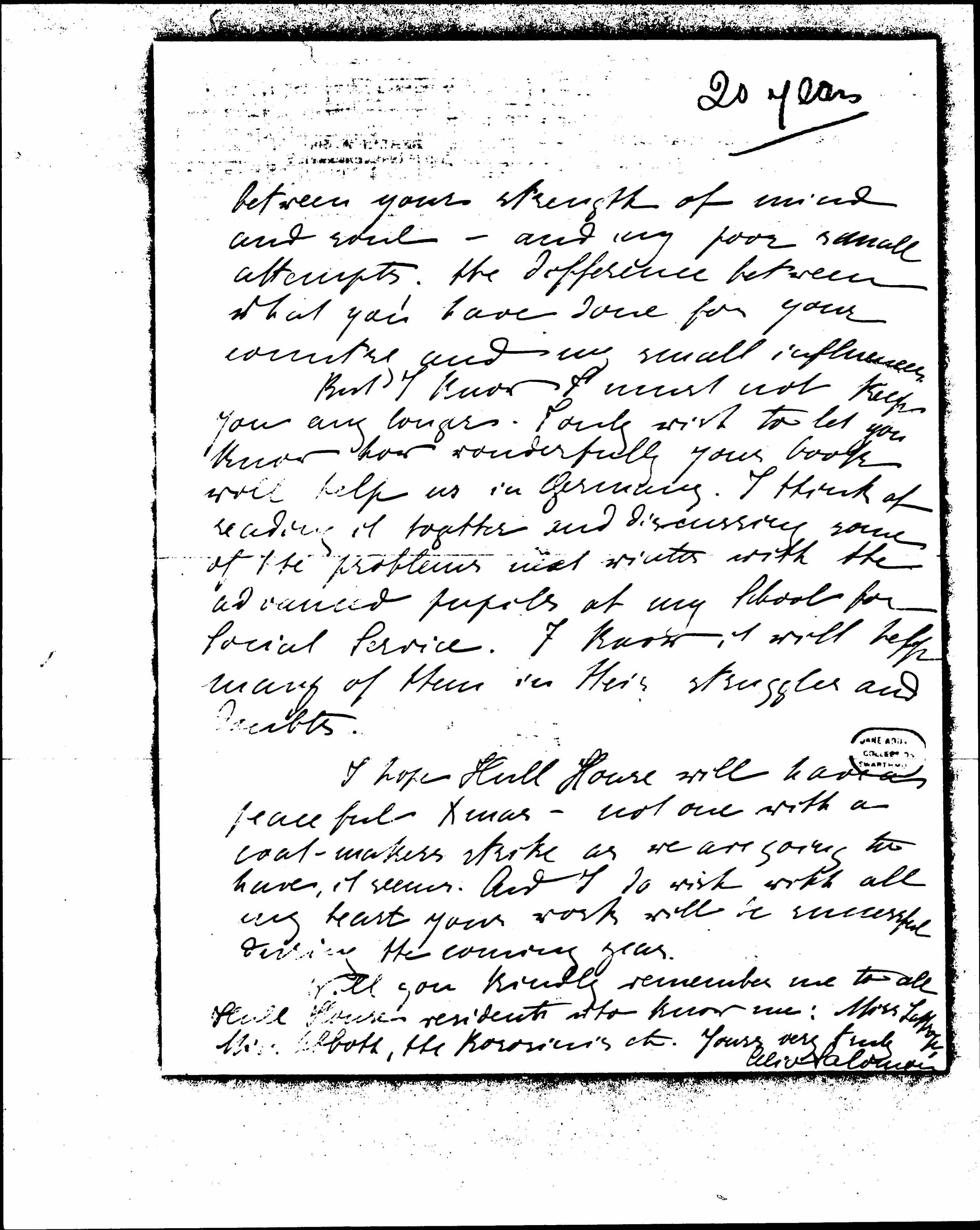 I suppose you will not remember my name and that we met some years ago when the International Council of Women held their meeting at Toronto and when we all came to Chicago. And I will not take much of your time, but I feel bound to express how deeply your book "Twenty Years in Hull House" has moved me and how very very deeply grateful I am to you for it. It is a book of power -- and it truly gives strength to know how you have fought with all the inner as much as with the outward difficulties, which all of us who try to help and to better the social conditions have to meet.