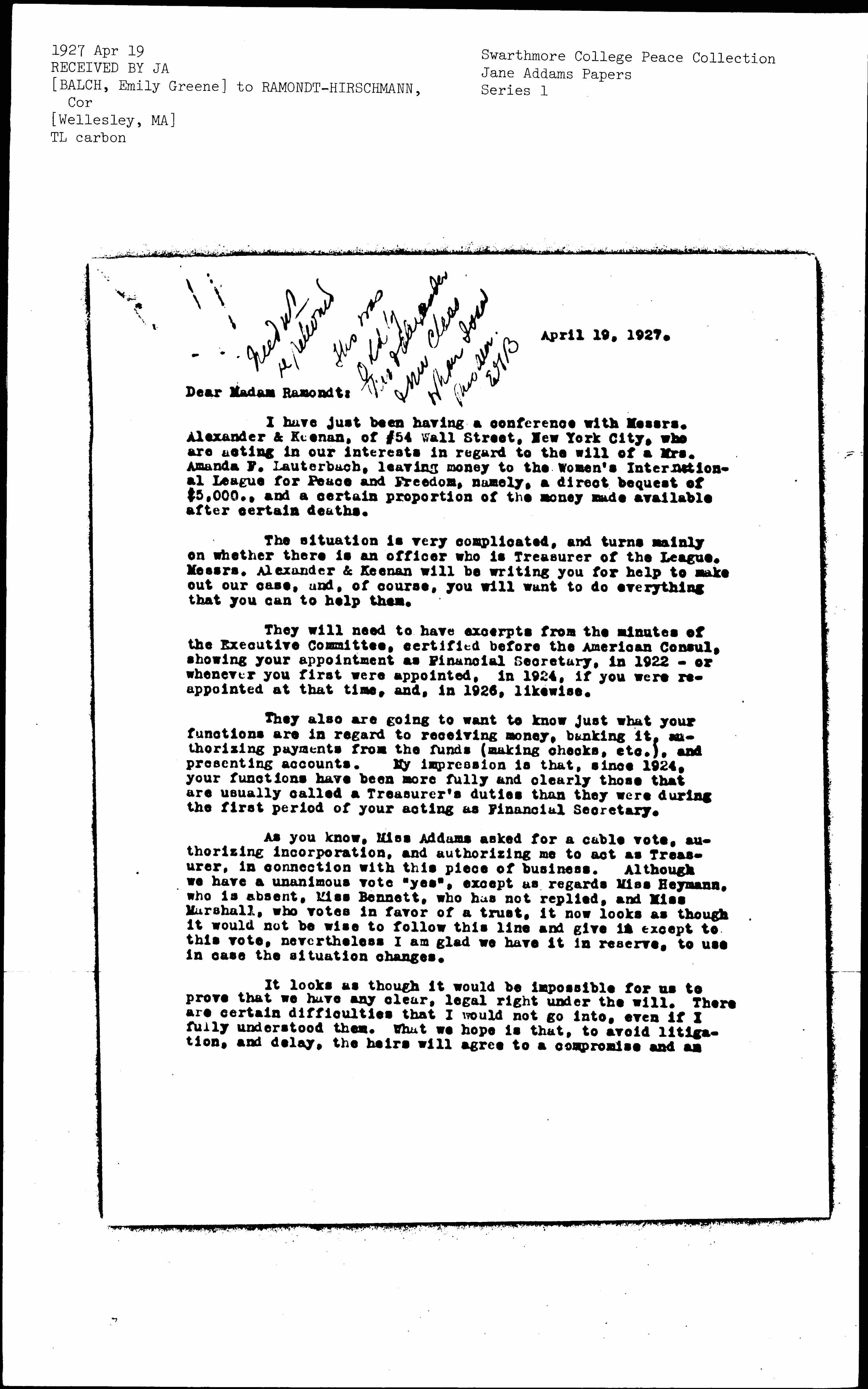 I have just been having a conference with Messrs. Alexander & Keenan, of #54 Wall Street, New York City, who are acting in our interests in regard to the will of a Mrs. Amanda F. Lauterbach, leaving money to the Women's International League for Peace and Freedom, namely, a direct bequest of $5,000, and a certain proportion of the money made available after certain deaths.