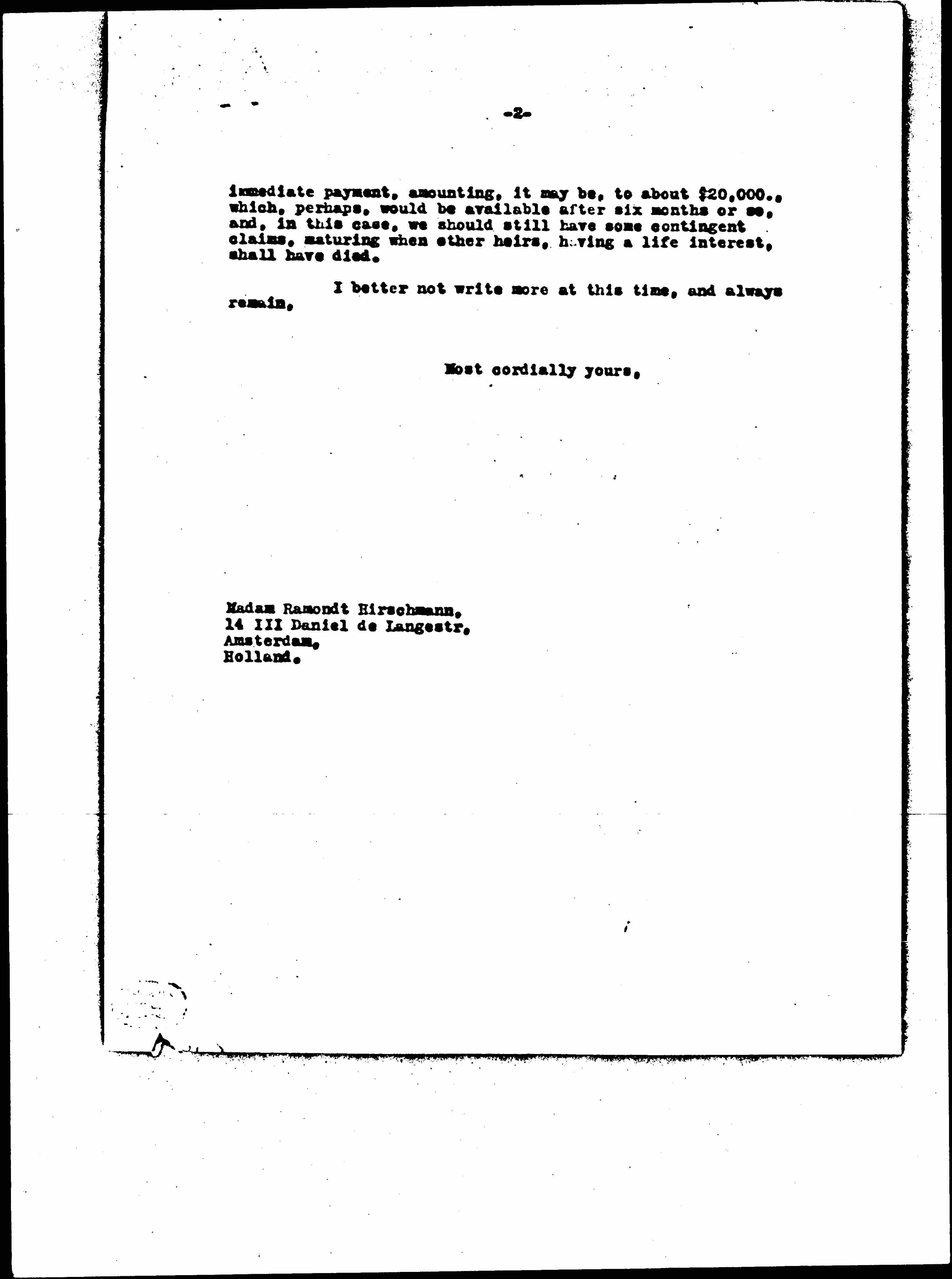 It looks as though it would be impossible for us to prove that we have any clear, legal right under the will. There are certain difficulties that I would not go into, even if I fully understood them. What we hope is that, to avoid litigation, and delay, the heirs will agree to a compromise and an [page 2] immediate payment, amounting, it may be, to about $20,000, which, perhaps, would be available after six months or so, and, in this case, we should still have some contingent claims, maturing when other heirs, having a life interest, shall have died.