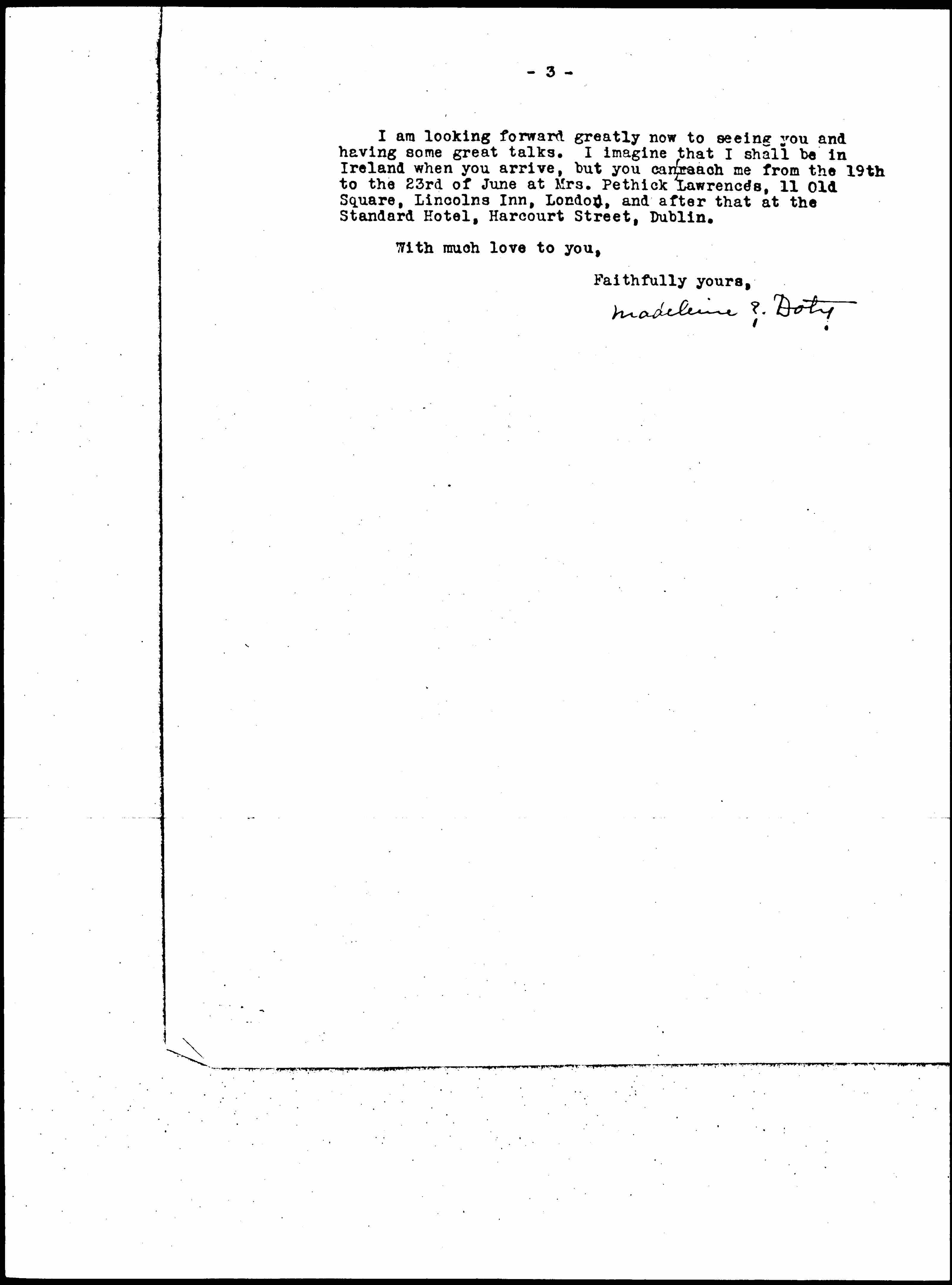 I am looking forward greatly now to seeing you and having some great talks. I imagine that I shall be in Ireland when you arrive, but you [can reach] me from the 19th to the 23rd of June at Mrs. Pethick Lawrence's, 11 Old Square, Lincolns Inn, London, and after that at the Standard Hotel, Harcourt Street, Dublin.