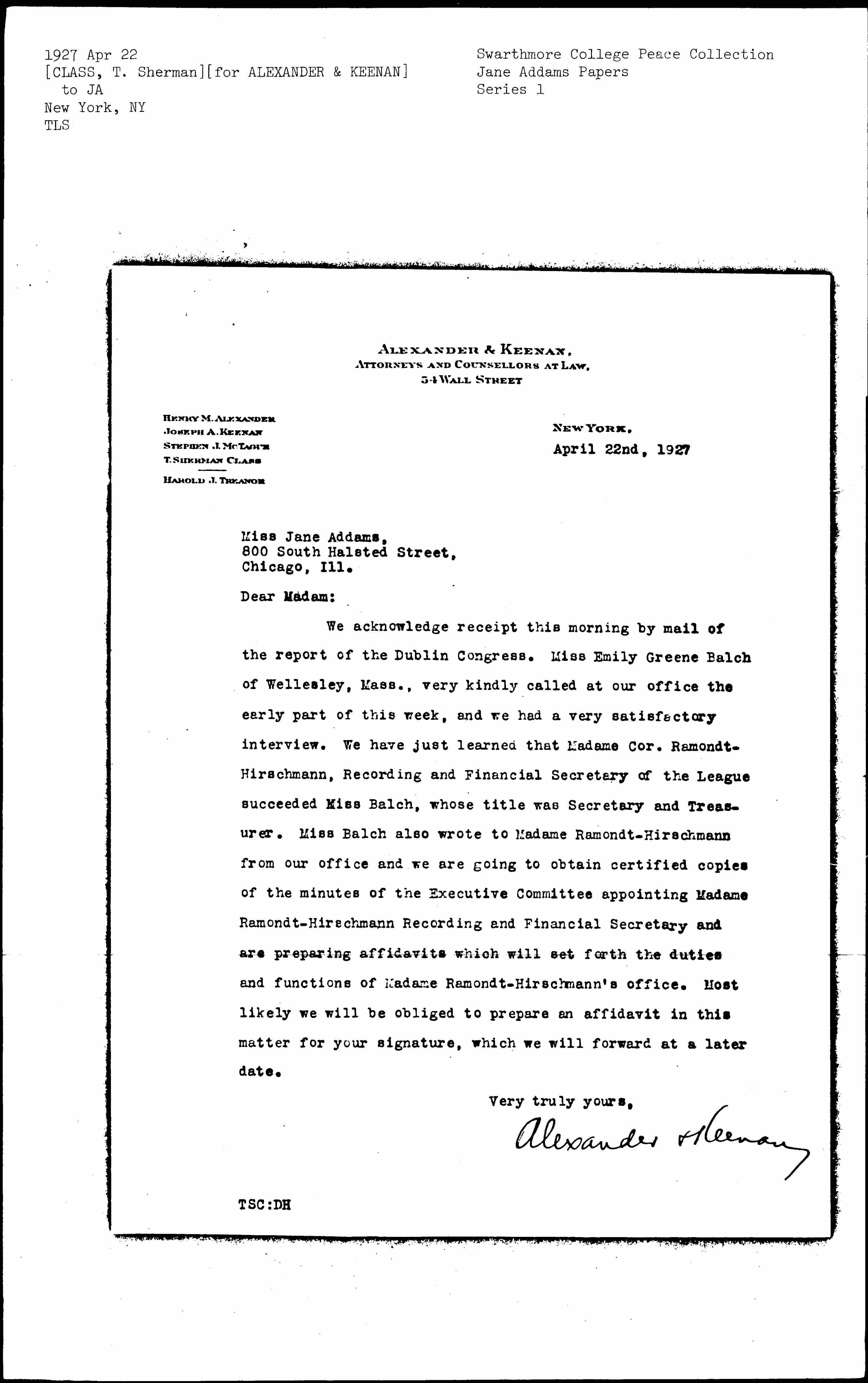 We acknowledge receipt this morning by mail of the report of the Dublin Congress. Miss Emily Greene Balch of Wellesley, Mass., very kindly called at our office the early part of this week, and we had a very satisfactory interview. We have just learned that Madame Cor. Ramondt-Hirschmann, Recording and Financial Secretary of the League succeeded Miss Balch, whose title was Secretary and Treasurer. Miss Balch also wrote to Madame Ramondt-Hirschmann from our office and we are going to obtain certified copies of the minutes of the Executive Committee appointing Madame Ramondt-Hirschmann Recording and Financial Secretary and are preparing affidavits which will set forth the duties and functions of Madame Ramondt-Hirschmann's office. Most likely we will be obliged to prepare an affidavit in this matter for your signature, which we will forward at a later date.