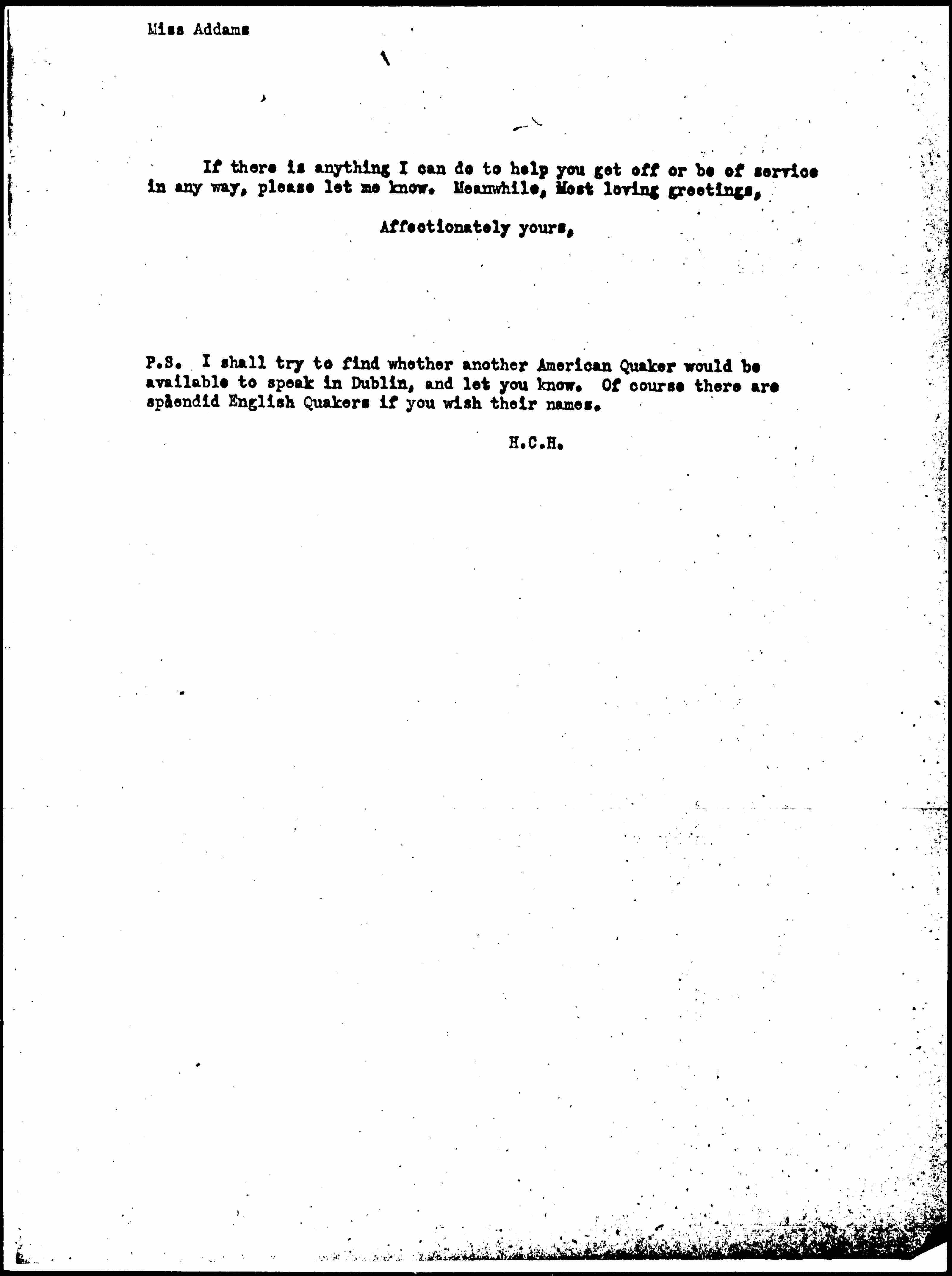 P.S. I shall try to find whether another American Quaker would be available to speak in Dublin, and let you know. Of course there are splendid English Quakers if you wish their names.