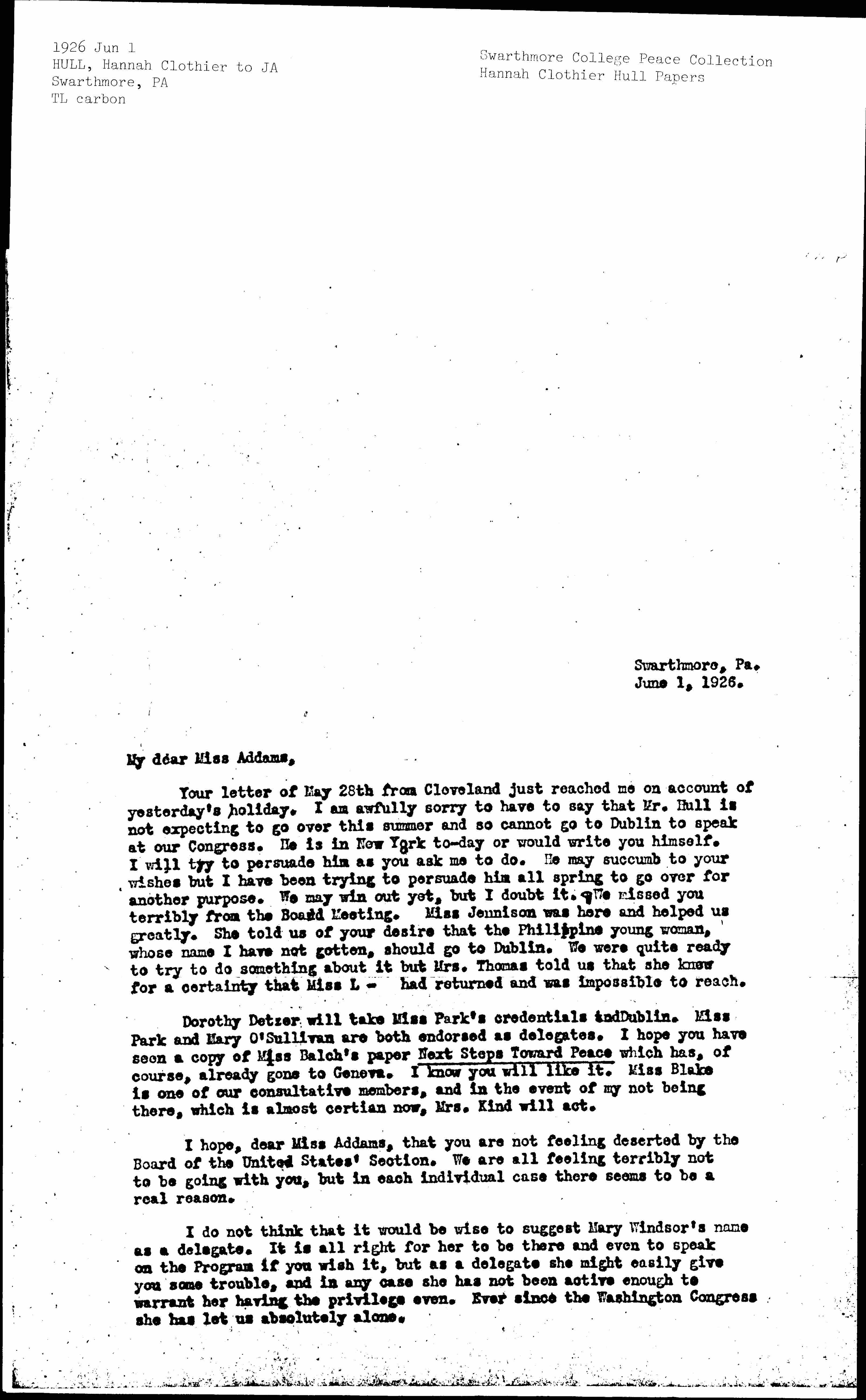 Your letter of May 28th from Cleveland just reached me on account of yesterday's holiday. I am awfully sorry to have to say that Mr. Hull is not expecting to go over this summer and so cannot go to Dublin to speak at our Congress. He is in New York [today] or would write you himself. I will try to persuade him as you ask me to do. He may succumb to your wishes but I have been trying to persuade him all spring to go over for another purpose. We may win out yet, but I doubt it. We missed you terribly from the Board Meeting. Miss Jennison was here and helped us greatly. She told us of your desire that the Philippine young woman, whose name I have not gotten, should go to Dublin. We were quite ready to try to do something about it but Mrs. Thomas told us that she knew for a certainty that Miss L. had returned and was impossible to reach.