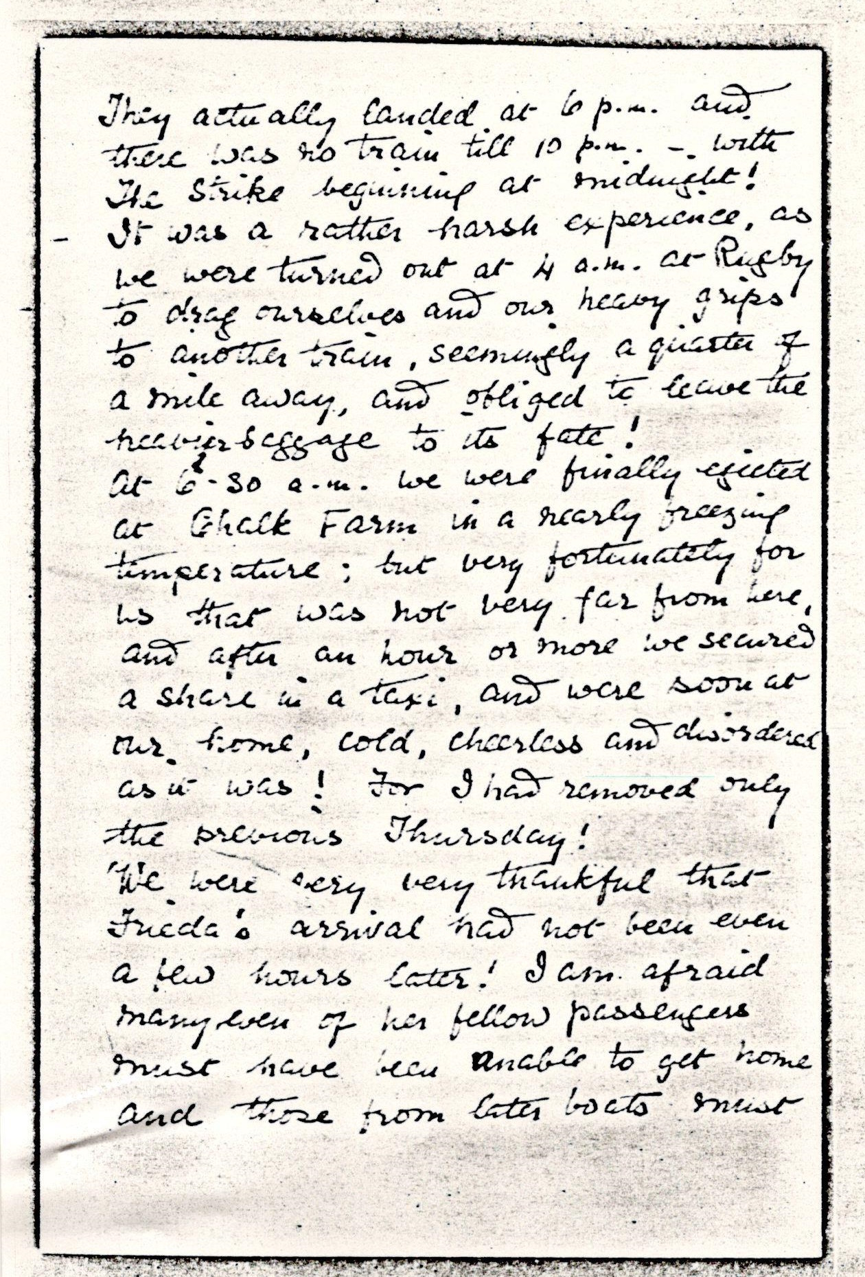 We were very very thankful that Frieda's arrival had not been even a few hours later! I am afraid many even of her fellow passengers must have been unable to get home and those from later boats must [page 4] have been quite stranded.It is difficult to form a fair judgment of what The Strike accomplished!