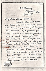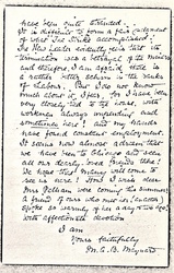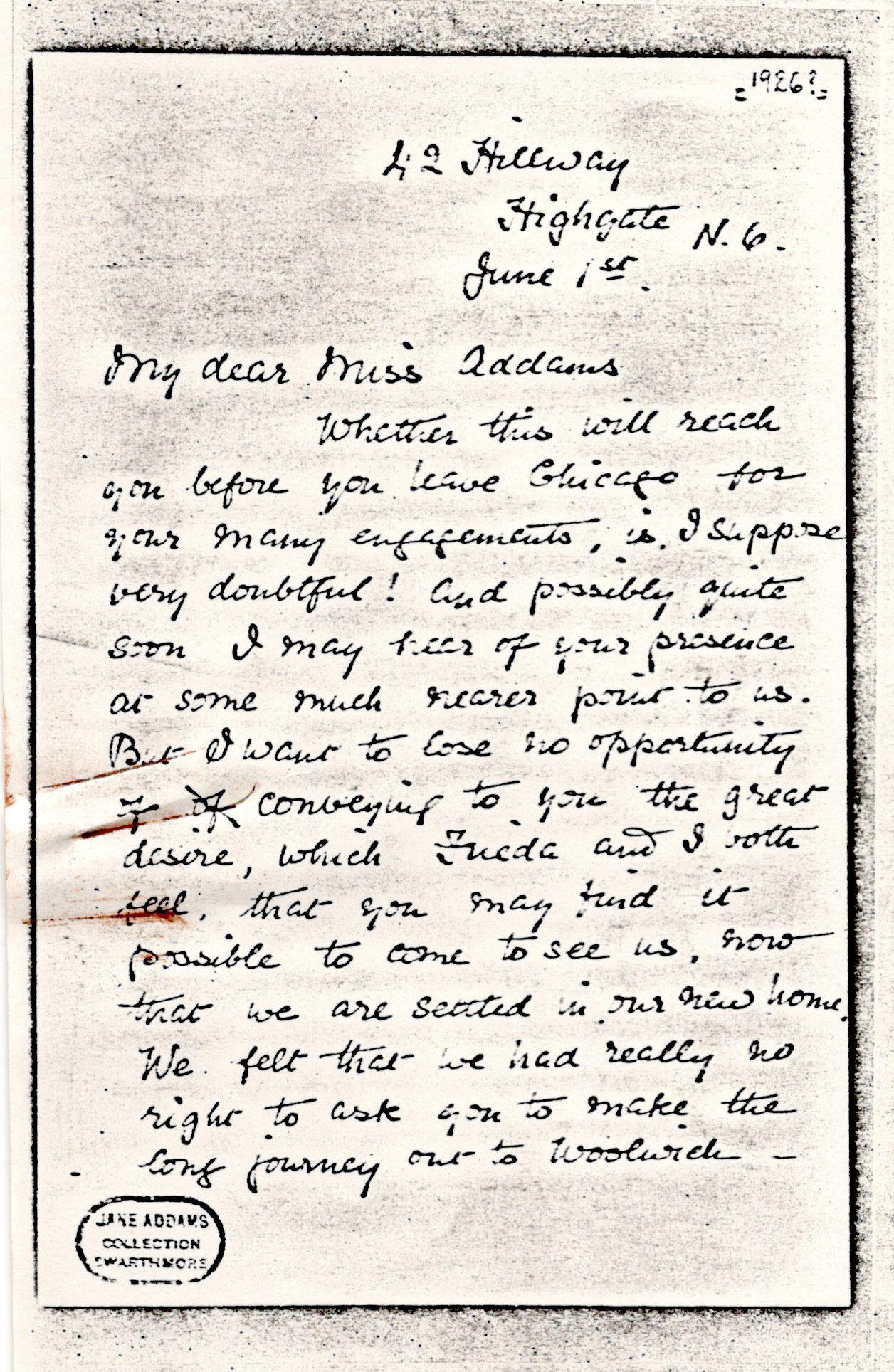 Whether this will reach you before you leave Chicago for your many engagements, is I suppose very doubtful! And possibly quite soon I may hear of your presence at some much nearer point to us. But I want to lose no opportunity of conveying to you the great desire, which Frieda and I both feel, that you may find it possible to come to see us, now that we are seated in our new home. We felt that we had really no right to ask you to make the long journey out to Woolwich -- [page 2] even though, I think, Woolwich itself would have interested you.