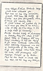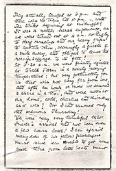 Frieda landed safely at Liverpool on Monday May 3rd, which I had spent there in suspense and very tiring wandering to and fro trying to get some authentic information. What actually happened was that, in anticipation of the Strike, the ship was docked some miles down the river, and passengers and baggage brought up by tender. But no one could or would tell me that, all the long day through! [page 3] They actually landed at 6 p.m. and there was no train till 10 p.m. -- with The Strike beginning at midnight! It was a rather harsh experience, as we were turned out at 4 a.m. at Rugby to drag ourselves and our heavy grips to another train, seemingly a quarter of a mile away, and obliged to leave the heavier baggage to its fate!