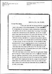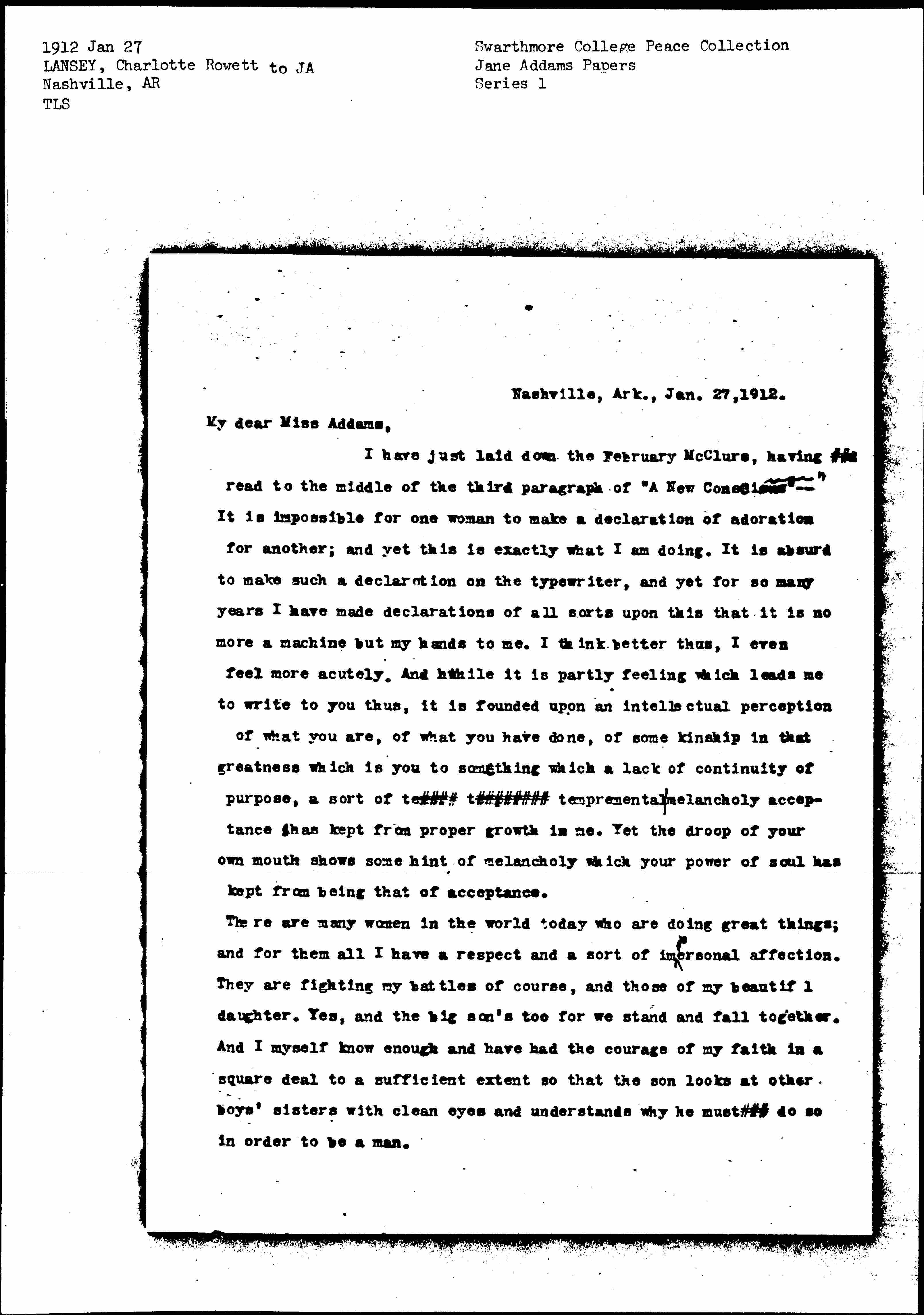 I have just laid down the February McClure, having [illegible] read to the middle of the third paragraph of "A New Conscience" -- It is impossible for one woman to make a declaration of adoration for another; and yet this is exactly what I am doing. It is absurd to make such a declaration on the typewriter, and yet for so many years I have made declarations of all sorts upon this that it is no more a machine but my hands to me. I think better thus, I even feel more acutely. And while it is partly feeling which leads me to write to you thus, it is founded upon an intellectual perception of what you are, of what you have done, of some kinship in that greatness which is you to something which a lack of continuity of purpose, a sort of [illegible] temperamental melancholy acceptance has kept from proper growth in me. Yet the droop of your own mouth shows some hint of melancholy which your power of soul has kept from being that of acceptance.