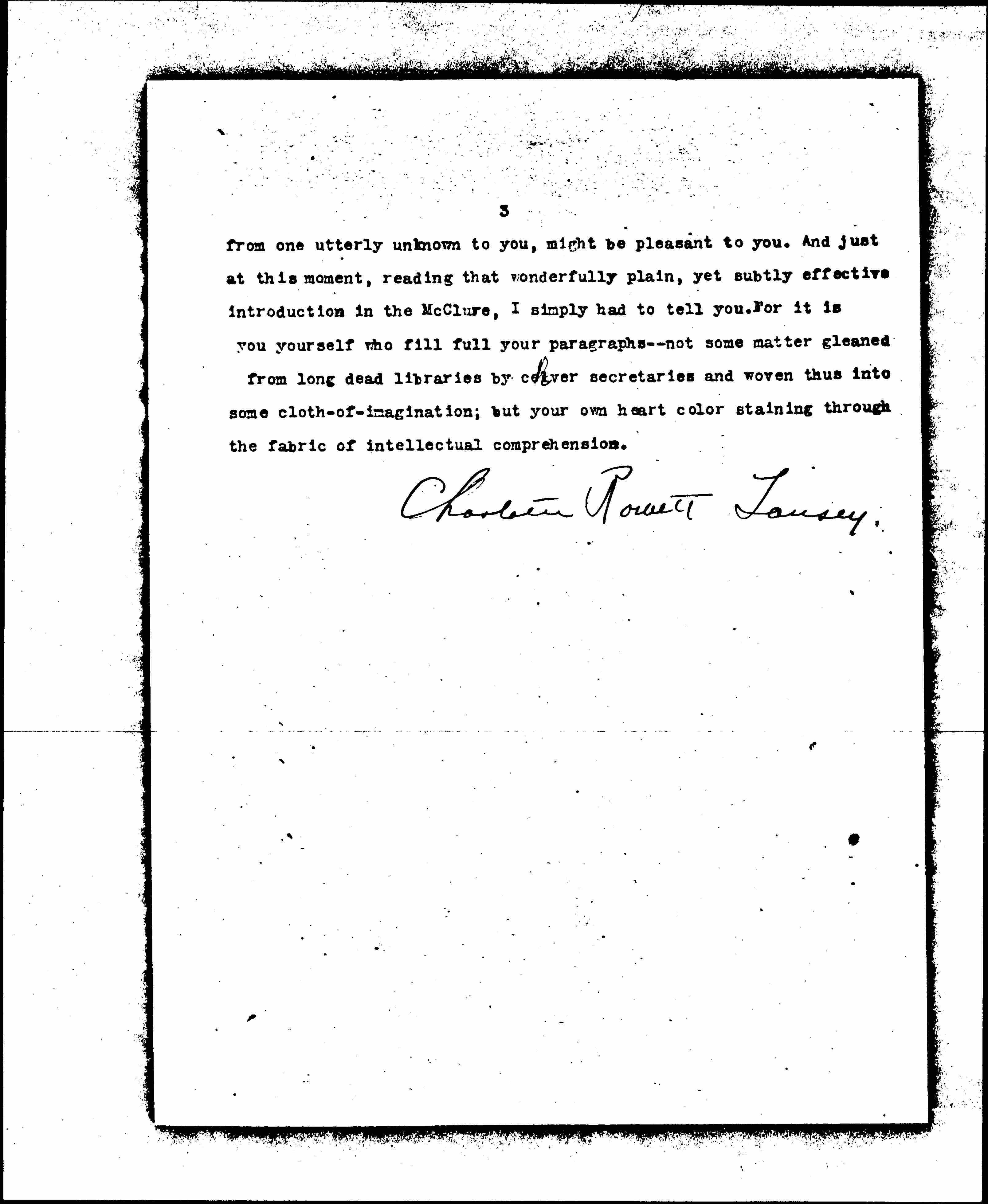 This is quite all. It is a thing which calls for no reply and wants none. But once in a while some girl in my own business has been fond of me, and told me that she leaned on me and loved me and I was very glad and knew why I had done certain things instead of certain others, because I think one isn't allowed to spoil such confidence even unconsciously. So I thought, it being so with little me, it might even be so with you -- that maybe a heart full of love even [page 3] from one utterly unknown to you, might be pleasant to you. And just at this moment, reading that wonderfully plain, yet subtly effective introduction in the McClure, I simply had to tell you. For it is you yourself who fill full your paragraphs -- not some matter gleaned from long dead libraries by clever secretaries and woven thus into some cloth-of-imagination; but your own heart color staining through the fabric of intellectual comprehension.