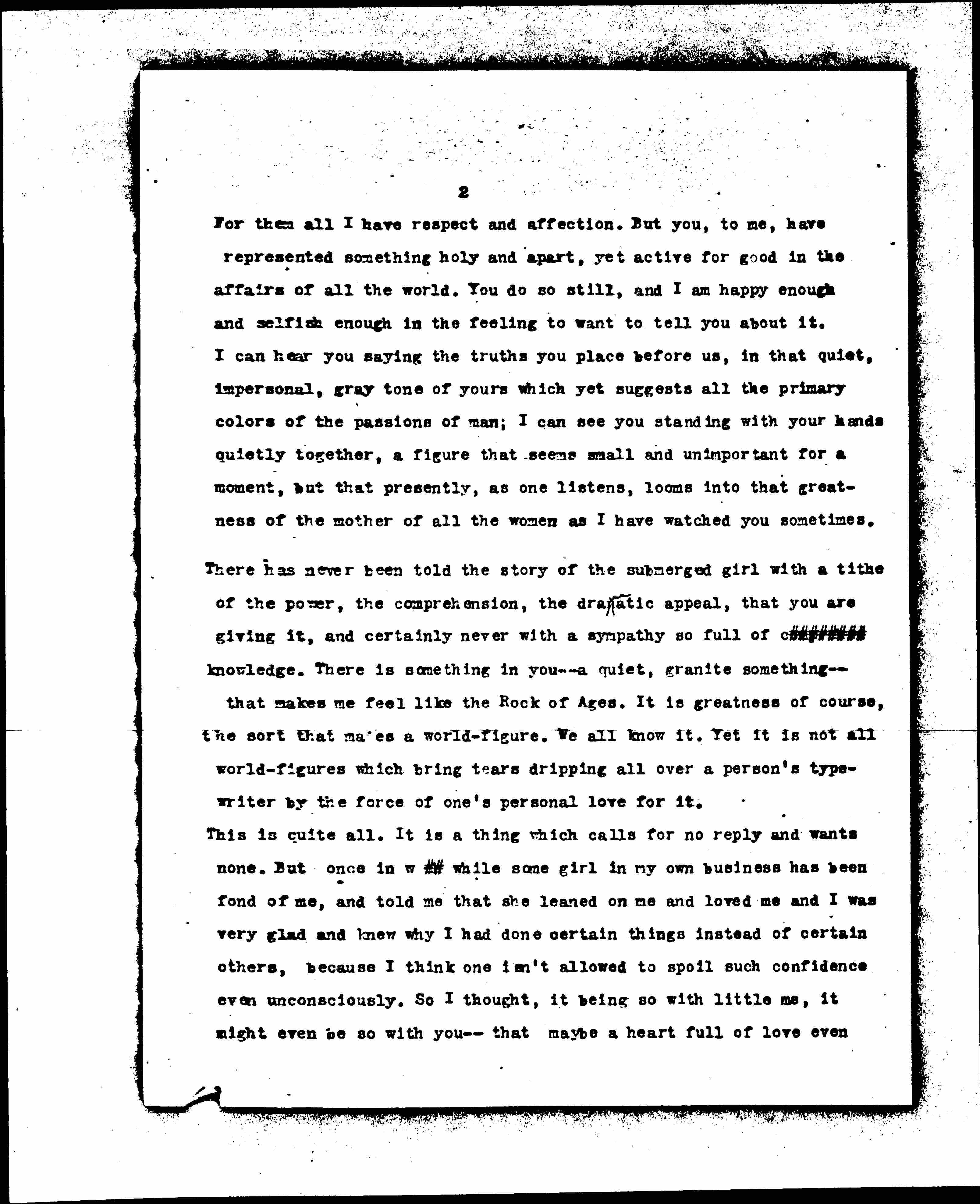 There has never been told the story of the submerged girl with a tithe of the power, the comprehension, the dramatic appeal, that you are giving it, and certainly never with a sympathy so full of [illegible] knowledge. There is something in you -- a quiet, granite something -- that makes me feel like the Rock of Ages. It is greatness of course, the sort that makes a world-figure. We all know it. Yet it is not all world-figures which bring tears dripping all over a person's typewriter by the force of one's personal love for it.
