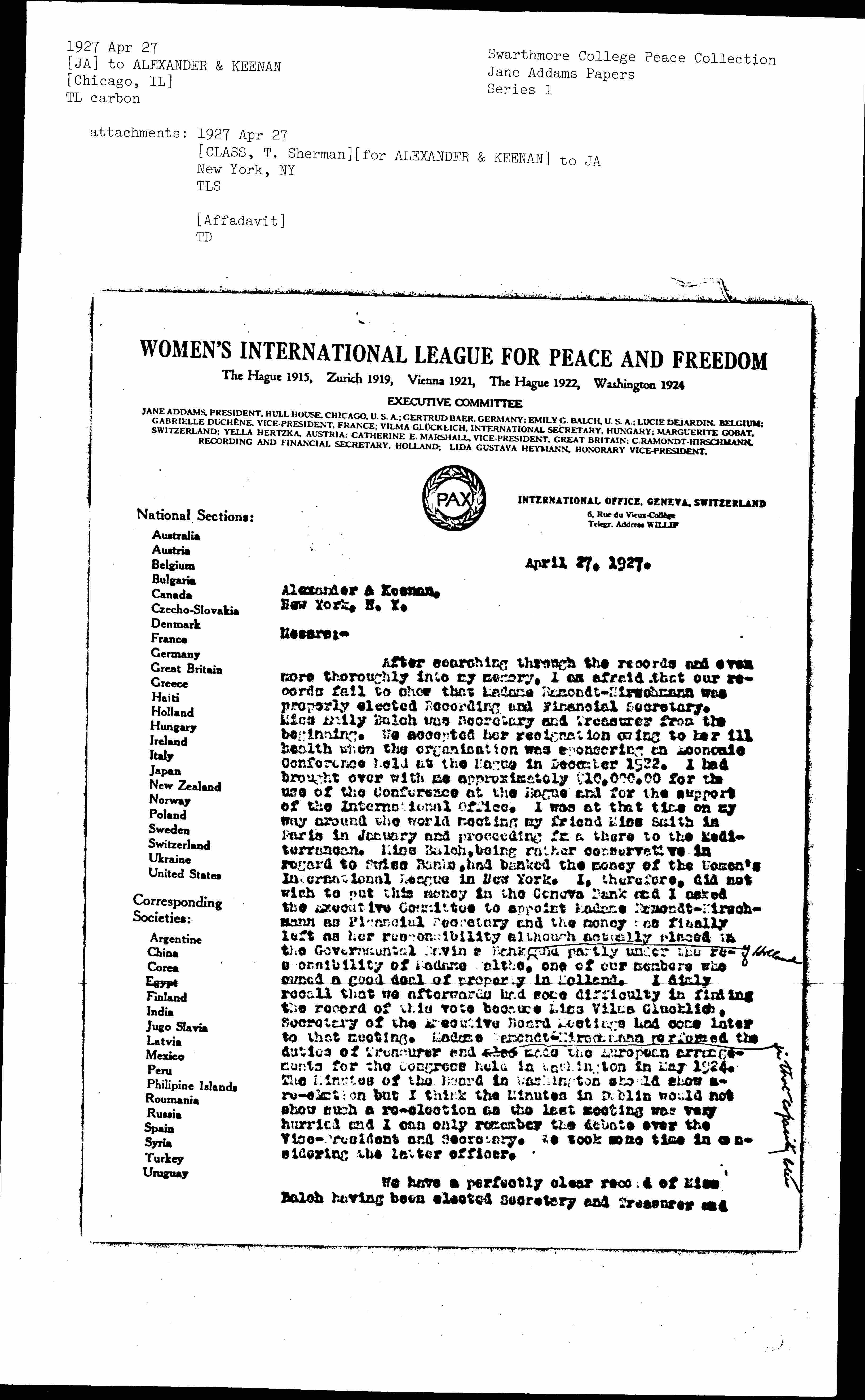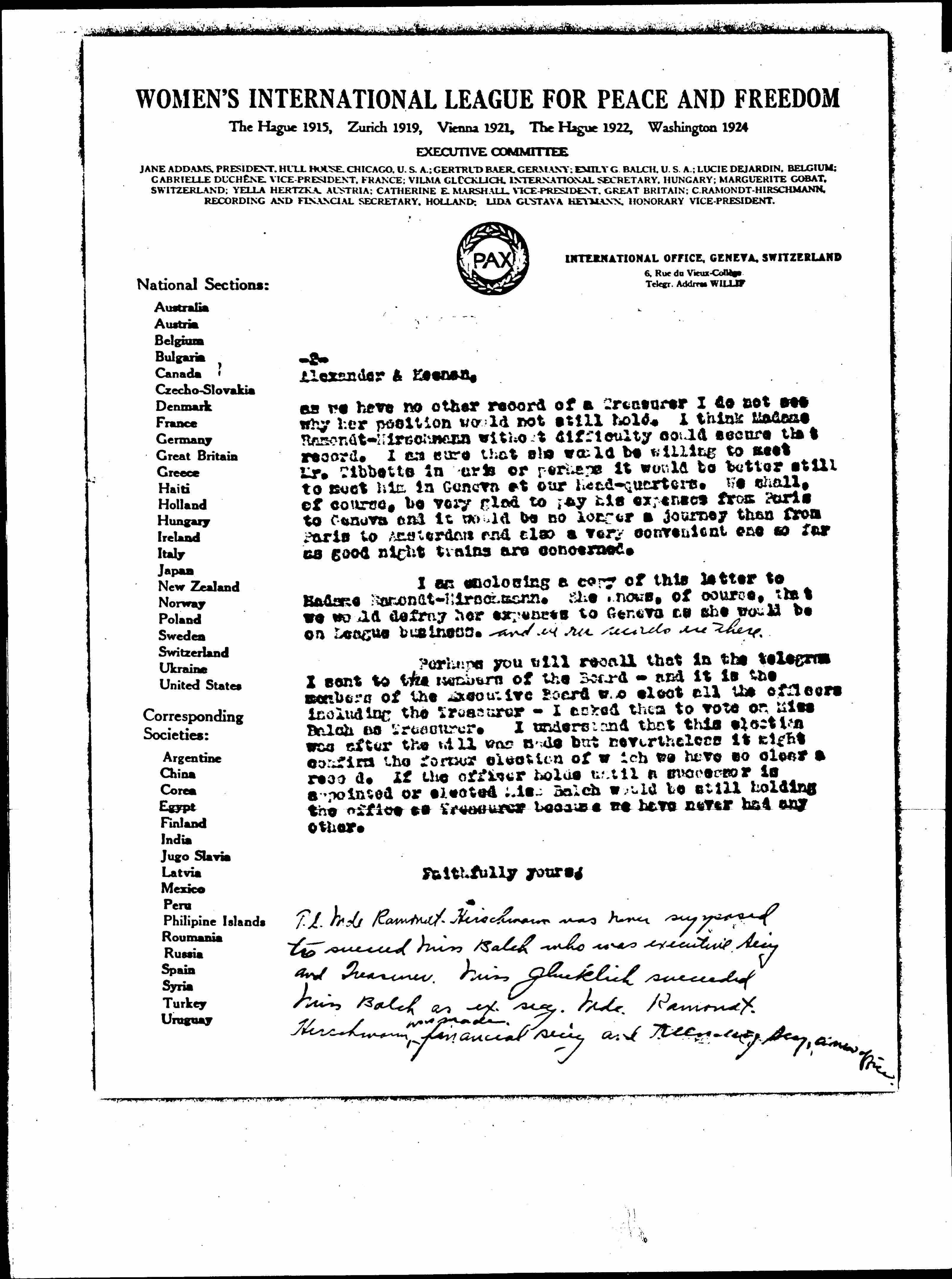 After searching through the records and even more thoroughly into my memory, I am afraid that our records fail to show that Madame Ramondt-Hirschmann was properly elected Recording and Financial Secretary. Miss Emily Balch was Secretary and Treasurer from the beginning. We accepted her resignation owing to her ill health when the [organization] was sponsoring an Economic Conference held at The Hague in December 1922. I had brought over with me approximately $10,000.00 for the use of the Conference at The Hague and for the support of the International Office. I was at that time on my way around the world meeting my friend Miss Smith in Paris in January and proceeding from there to the Mediterranean. Miss Balch, being rather conservative in regard to Swiss Banks, had banked the money of the Women's International League in New York. I, therefore, did not wish to put this money in the Geneva Bank and I asked the Executive Committee to appoint Madame Ramondt-Hirschmann as Financial Secretary and the money was finally left as her responsibility although actually placed in the Governmental Savings Bank ↑of Holland↓ and partly under the responsibility of Madame Palthe, one of our members who owned a good deal of property in Holland. I dimly recall that we afterwards had some difficulty in finding the record of this vote because Miss Vilma Glücklich, Secretary of the Executive Board Meetings had come later to that meeting. Madame Ramondt-Hirschmann performed the duties of Treasurer and also ↑in that capacity later↓ made the European arrangements for the Congress held in Washington in May 1924. The Minutes of the Board in Washington should show a [reelection] but I think the Minutes in Dublin would not show such a [reelection] as the last meeting was very hurried and I can only remember the debate over the Vice-President and Secretary. We took some time in considering the latter officer.