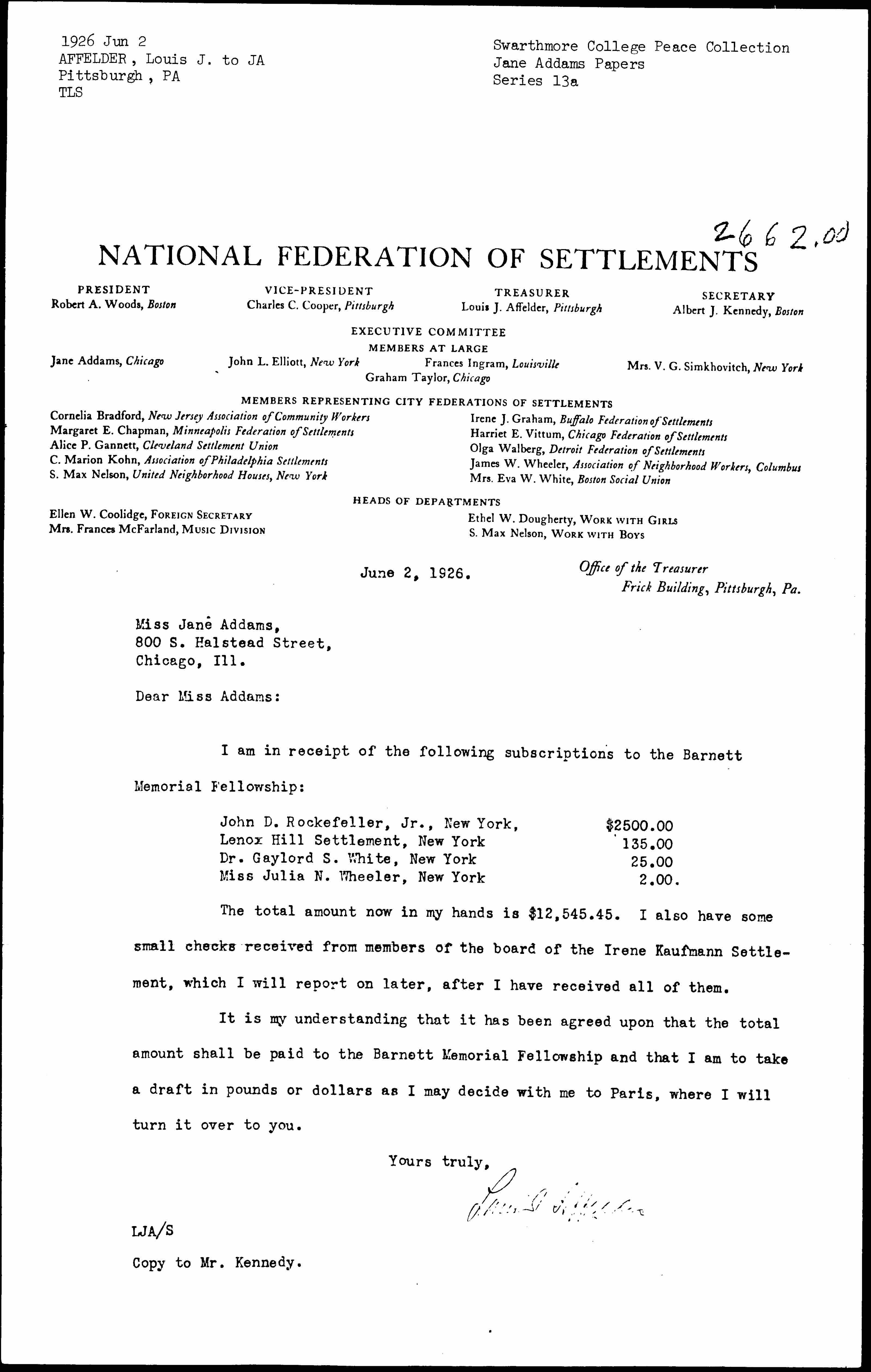 The total amount now in my hands is $12,545.45. I also have some small checks received from members of the board of the Irene Kaufmann Settlement, which I will report on later, after I have received all of them.