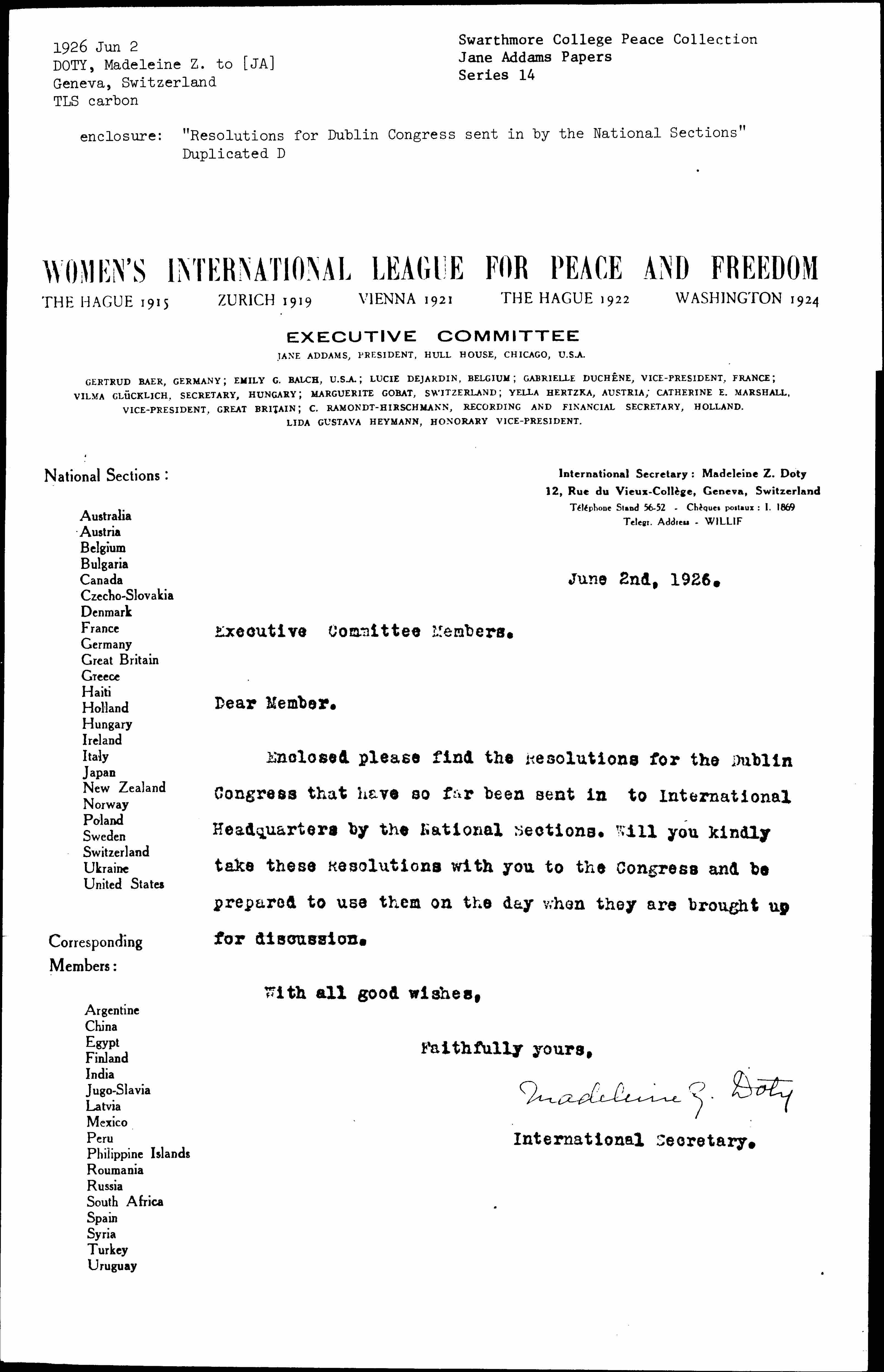 Enclosed please find the Resolutions for the Dublin Congress that have so far been sent in to International Headquarters by the National Sections. Will you kindly take these Resolutions with you to the Congress and be prepared to use them on the day when they are brought up for discussion.