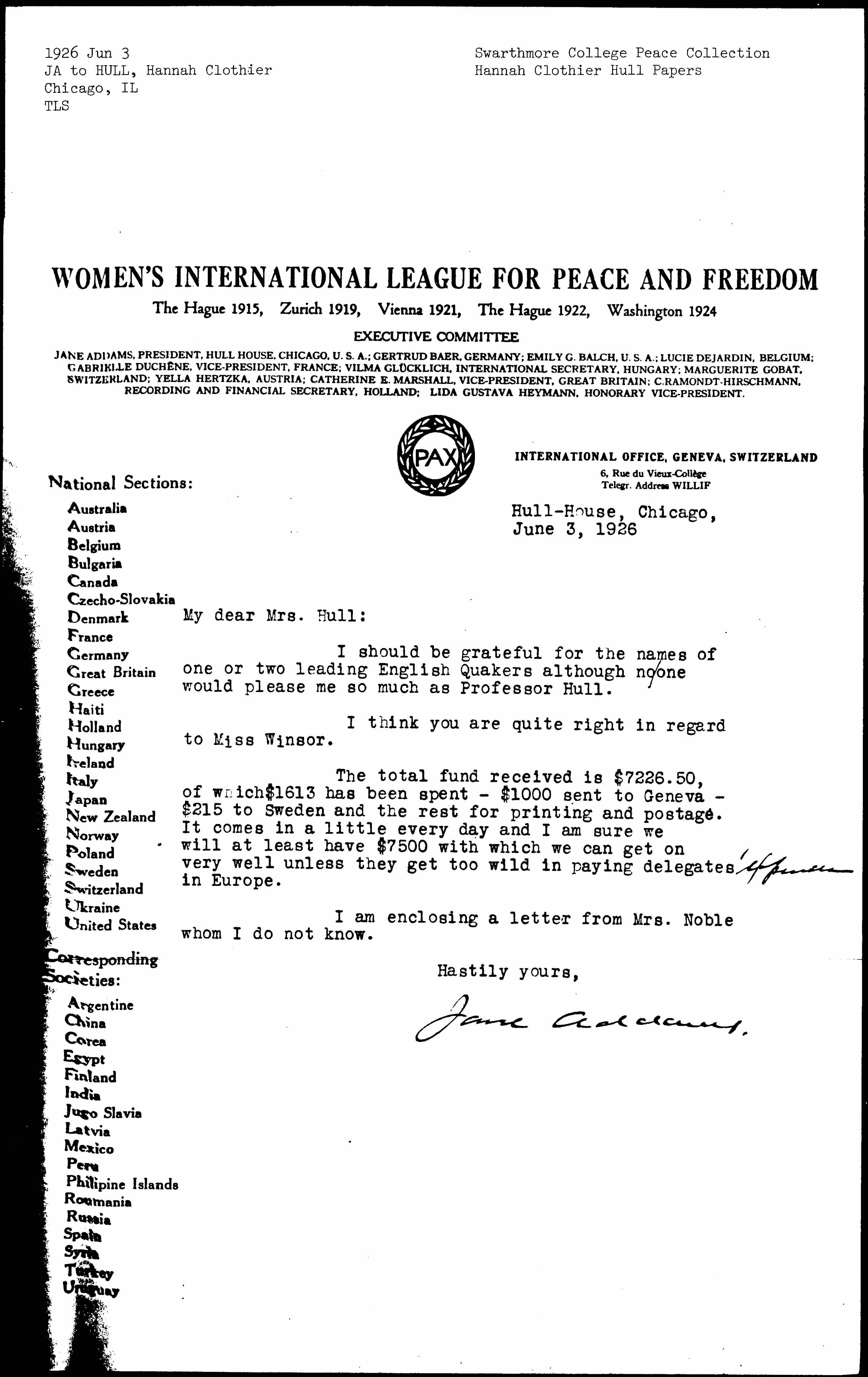 The total fund received is $7226.50, of which $1613 has been spent -- $1000 sent to Geneva -- $215 to Sweden and the rest for printing and postage. It comes in a little every day and I am sure we will at least have $7500 with which we can get on very well unless they get too wild in paying delegates' ↑expenses↓ in Europe.