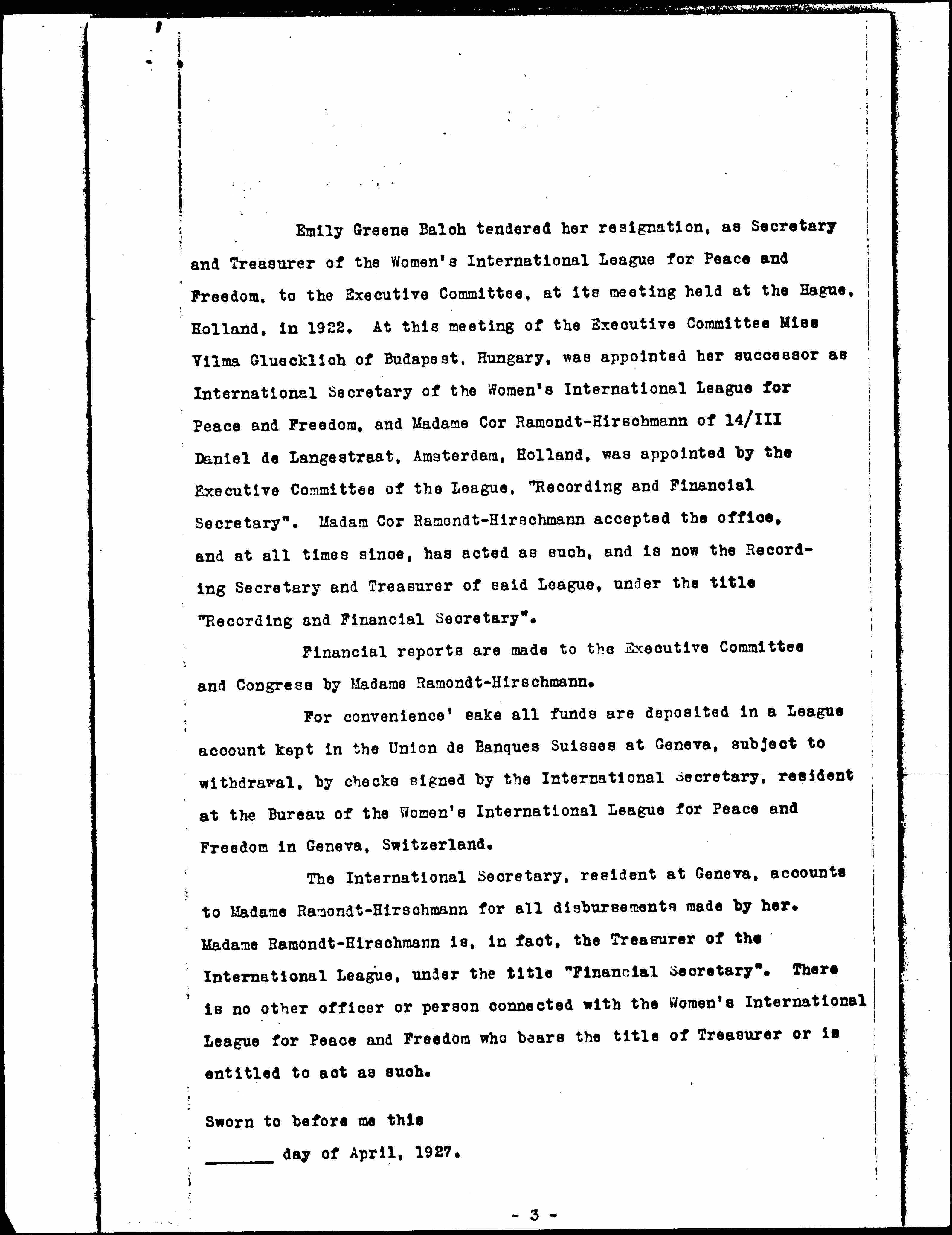 Emily Greene Balch tendered her resignation, as Secretary and Treasurer of the Women's International League for Peace and Freedom, to the Executive Committee, at its meeting held at The Hague, Holland, in 1922. At this meeting of the Executive Committee, Miss Vilma [Glücklich] of Budapest, Hungary, was appointed her successor as International Secretary of the Women's International League for Peace and Freedom, and Madame Cor Ramondt-Hirschmann of 14/III Daniel de Langestraat, Amsterdam, Holland, was appointed by the Executive Committee of the League, "Recording and Financial Secretary." Madame Cor Ramondt-Hirschmann accepted the office, and at all times since, has acted as such, and is now the Recording Secretary and Treasurer of said League, under the title "Recording and Financial Secretary."