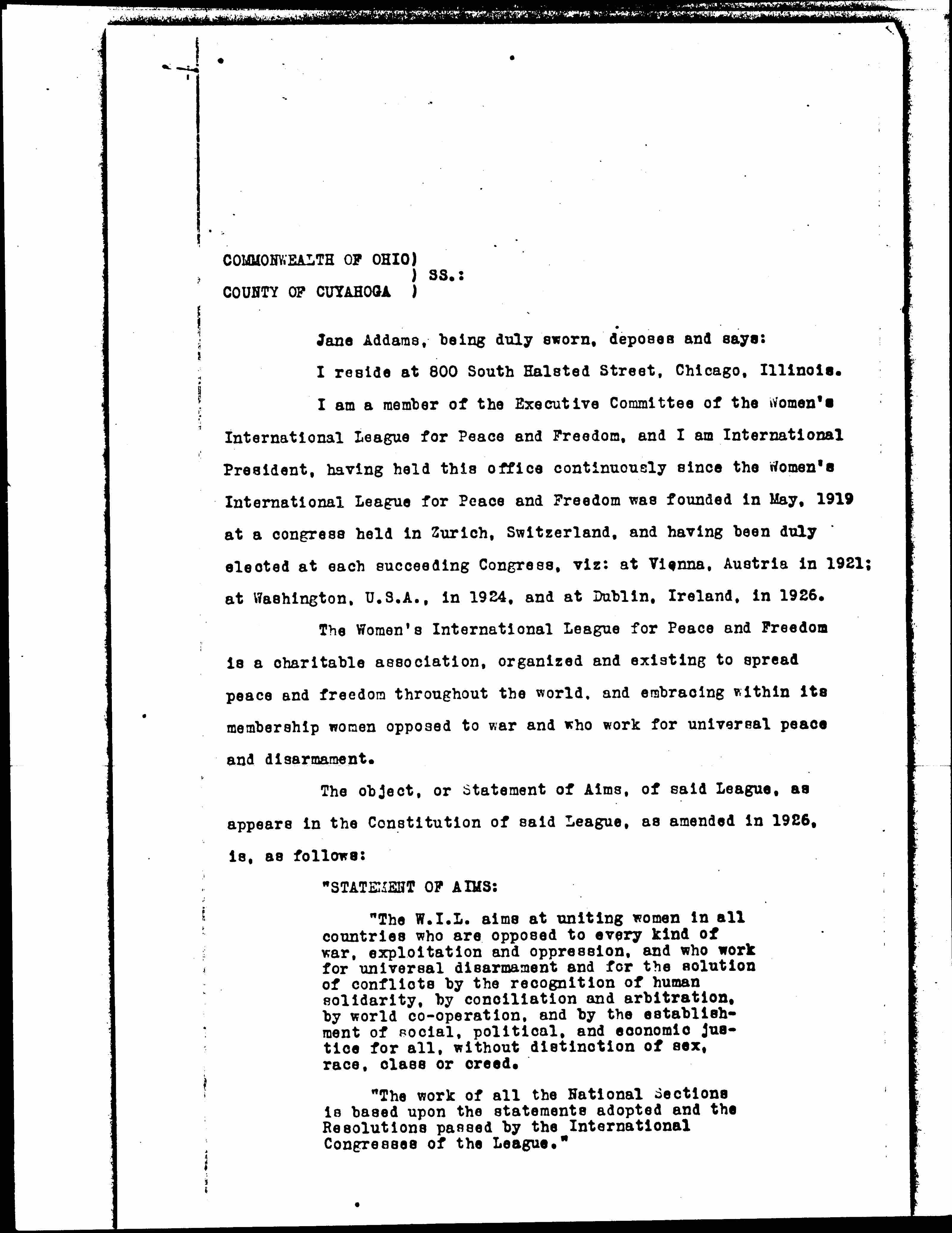 I am a member of the Executive Committee of the Women's International League for Peace and Freedom, and I am International President, having held this office continuously since the Women's International League for Peace and Freedom was founded in May, 1919 at a congress held in Zurich, Switzerland, and having been duly elected at each succeeding Congress, viz: at Vienna, Austria in 1921; at Washington, U.S.A., in 1924; and at Dublin, Ireland, in 1926.