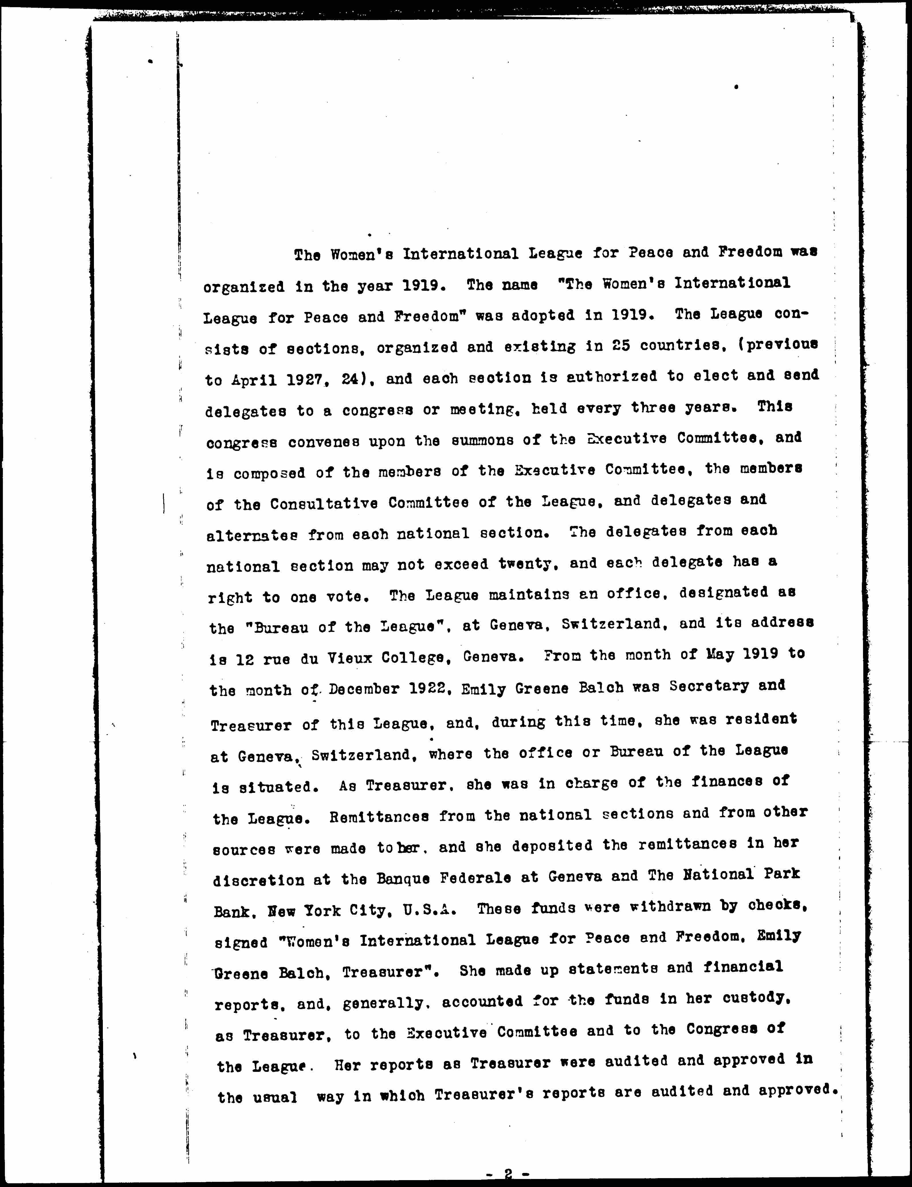 The women's International League for Peace and Freedom was organized in the year 1919. The name "Women's International League for Peace and Freedom" was adopted in 1919. The League consists of sections, organized and existing in 25 countries, (previous to April 1927, 24), and each section is authorized to elect and send delegates to a congress or meeting, held every three years. This congress convenes upon the summons of the Executive Committee, and is composed of the members of the Executive Committee, the members of the Consultative Committee of the League, and delegates and alternates from each national section. The delegates from each national section may not exceed twenty, and each delegate has a right to one vote. The League maintains an office, designated as the "Bureau of the League," at Geneva, Switzerland, and its address is 12 rue du Vieux College, Geneva. From the month of May 1919 to the month of December 1922, Emily Greene Balch was Secretary and Treasurer of this League, and, during this time, she was resident at Geneva, Switzerland, where the office or Bureau of the League is situated. As Treasurer, she was in charge of the finances of the League. Remittances from the national sections and from other sources were made to her, and she deposited the remittances in her discretion at the Banque Federale at Geneva and The National Park Bank, New York City, U.S.A. These funds were withdrawn by checks, signed "Women's International League for Peace and Freedom, Emily Greene Balch, Treasurer." She made up statements and financial reports, and, generally, accounted for the funds in her custody, as Treasurer, to the Executive Committee and to the Congress of the League. Her reports as Treasurer were audited and approved in the usual way in which Treasurer's reports are audited and approved. [page 3]
