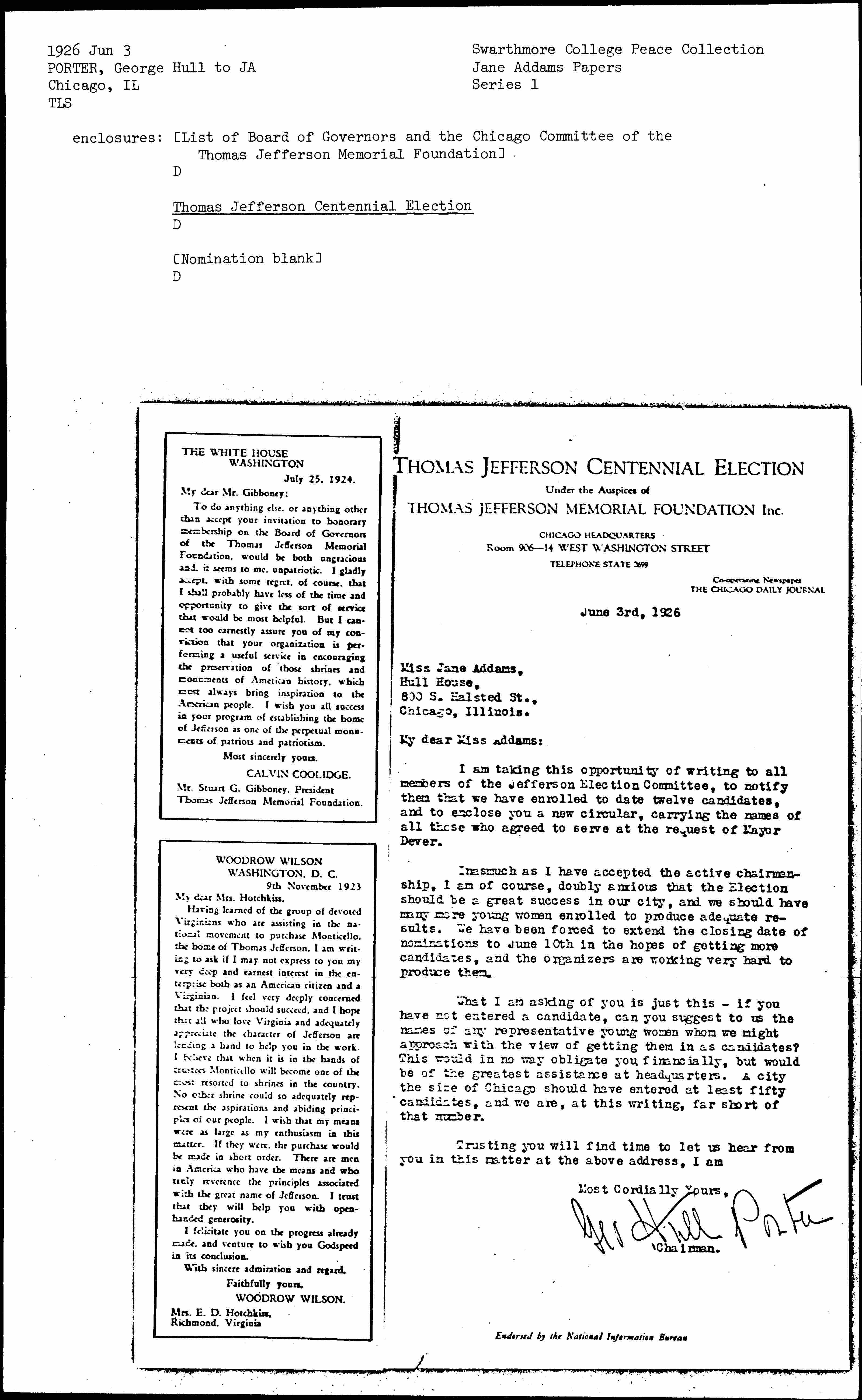 I am taking this opportunity of writing to all members of the Jefferson Election Committee, to notify them that we have enrolled to date twelve candidates, and to enclose you a new circular, carrying the names of all those who agreed to serve at the request of Mayor Dever.