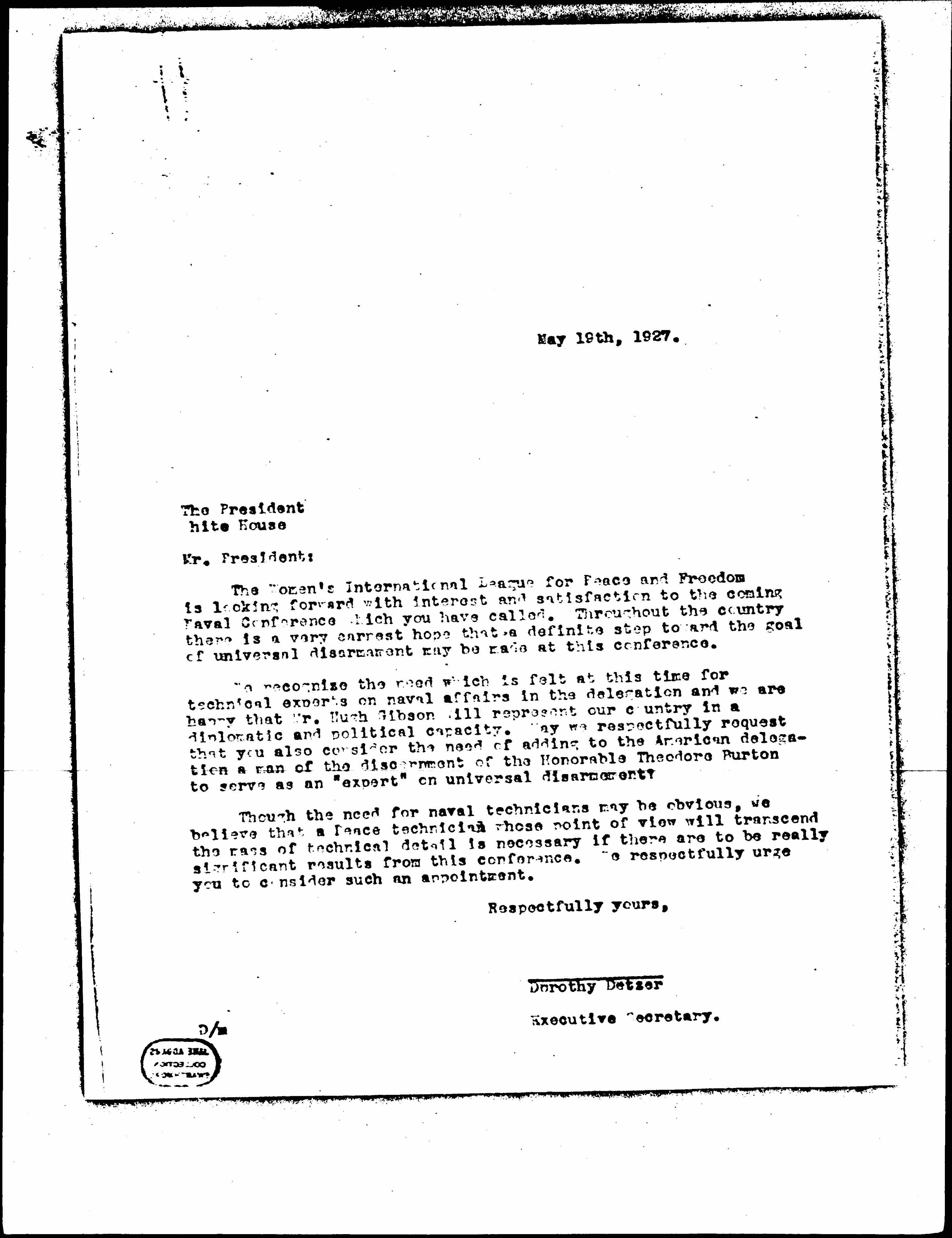 We recognize the need which is felt at this time for technical experts on naval affairs in the delegation and we are happy that Mr. Hugh Gibson will represent our country in a diplomatic and political capacity. May we respectfully request that you also consider the need of adding to the American delegation a man of the discernment of the Honorable Theodore Burton to serve as an "expert" on universal disarmament?