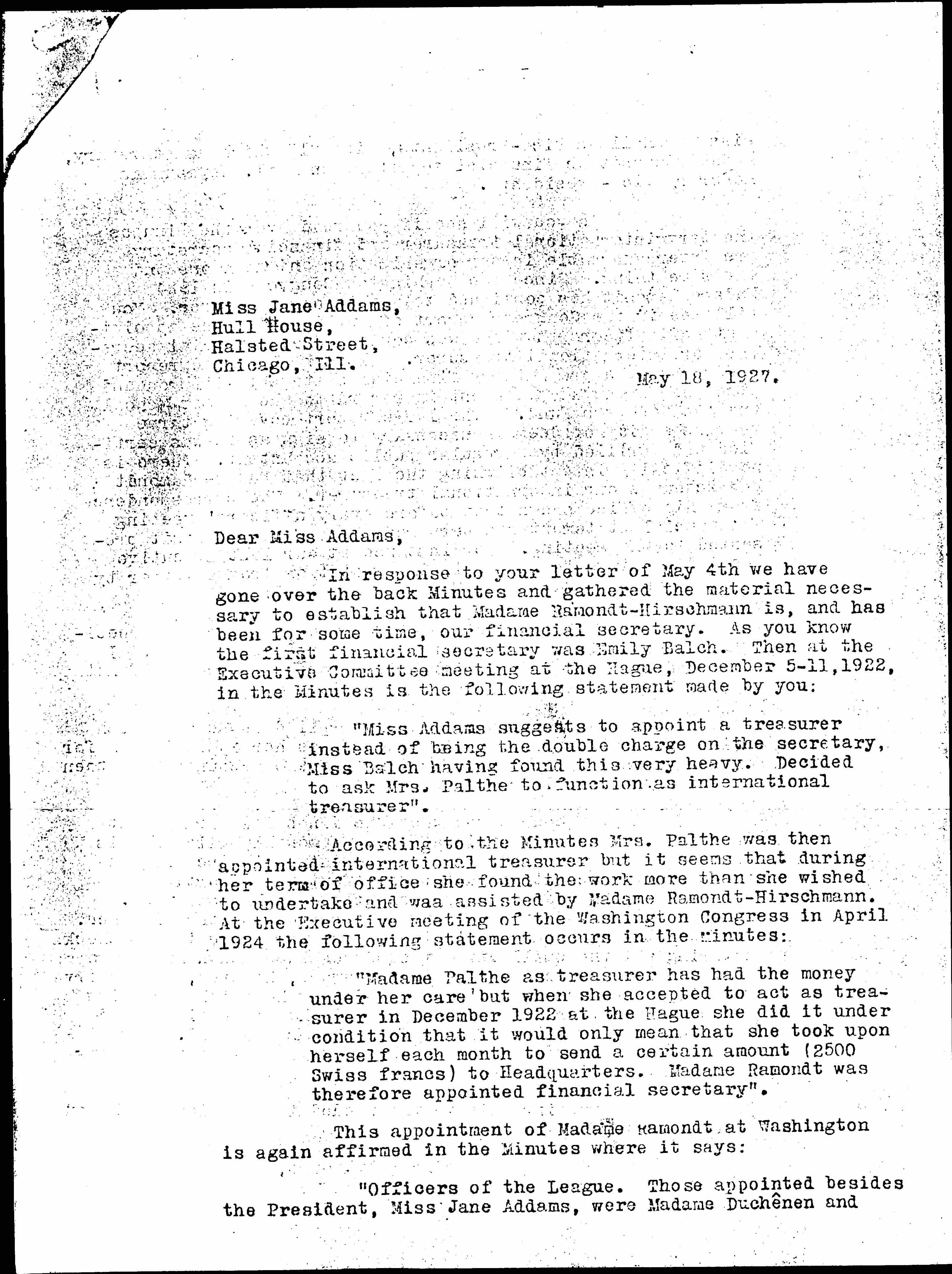 In response to your letter of May 4th we have gone over the back Minutes and gathered the material necessary to establish that Madame Ramondt-Hirschmann is, and has been for some time, our financial secretary. As you know the first financial secretary was Emily Balch. Then at the Executive Committee meeting at The Hague, December 5-11, 1922, in the Minutes is the following statement made by you:
