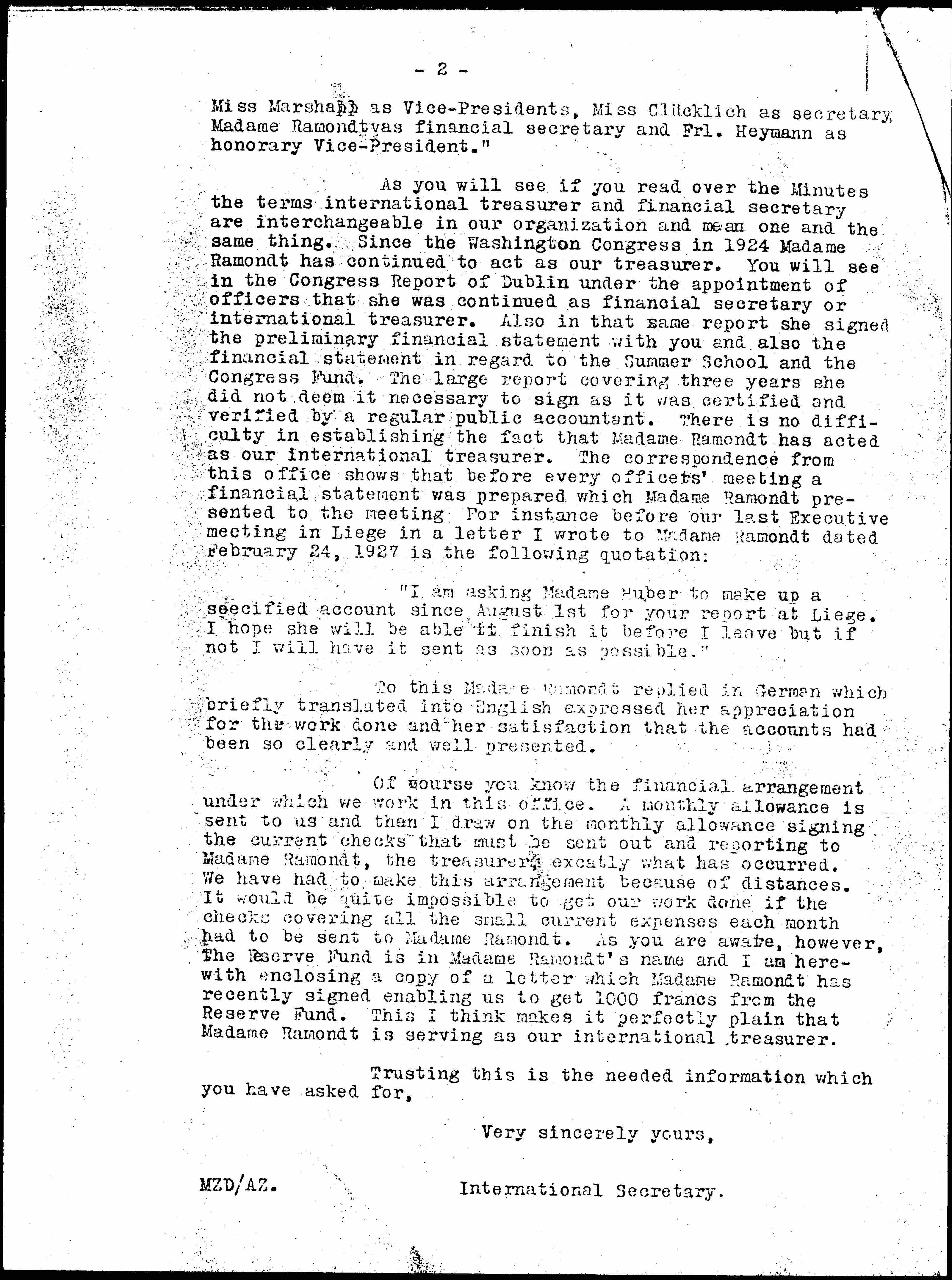 As you will see if you read over the Minutes the terms international treasurer and financial secretary are interchangeable in our organization and mean one and the same thing. Since the Washington Congress in 1924 Madame Ramondt has continued to act as our treasurer. You will see in the Congress Report of Dublin under the appointment of officers that she was continued as financial secretary or international treasurer. Also in that same report she signed the preliminary financial statement with you and also the financial statement in regard to the Summer School and the Congress Fund. The large report covering three years she did not deem it necessary to sign as it was certified and verified by a regular public accountant. There is no difficulty in establishing the fact that Madame Ramondt has acted as our international treasurer. The correspondence from this office shows that before every officers' meeting a financial statement was prepared which Madame Ramondt presented to the meeting. For instance before our last Executive meeting in Liège in a letter I wrote to Madame Ramondt dated February 24, 1927 is the following quotation: