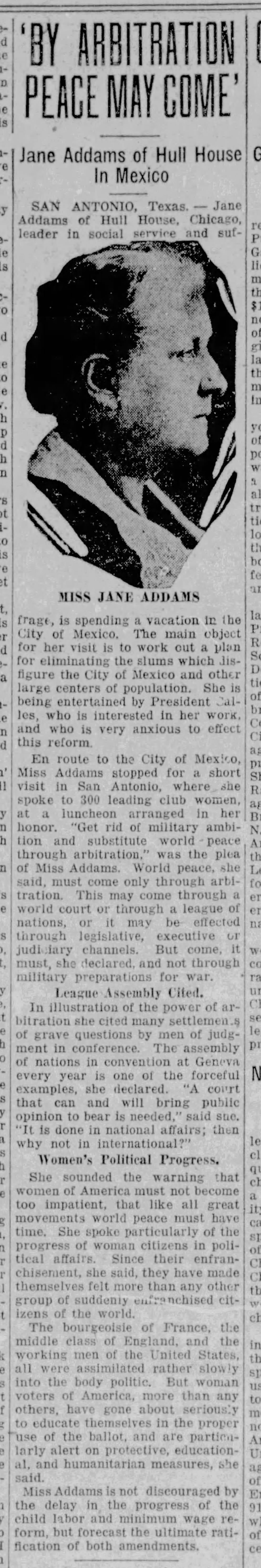 En route to the City of Mexico, Miss Addams stopped for a short visit in San Antonio, where she spoke to 300 leading club women, at a luncheon arranged in her honor. "Get rid of military ambition and substitute world peace through arbitration," was the plea of Miss Addams. World peace, she said, must come only through arbitration. This may come through a world court or through a league of nations, or it may be effected through legislative, executive or judiciary channels. But come, it must, she declared, and not through military preparations for war.