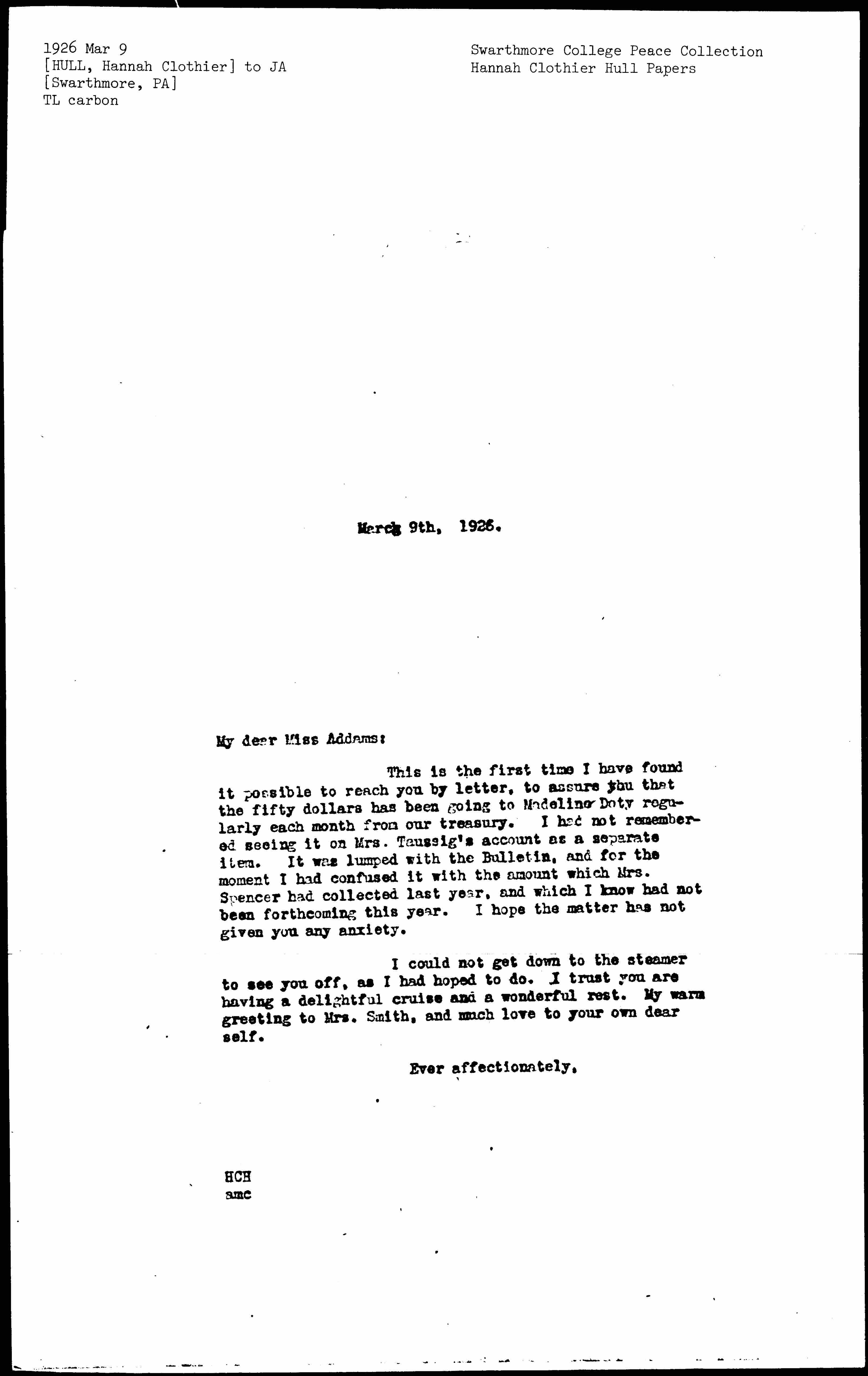 This is the first time I have found it possible to reach you by letter, to assure you that the fifty dollars has been going to [Madeleine] Doty regularly each month from our treasury. I had not remembered seeing it on Mrs. Taussig's account as a separate item. It was lumped with the Bulletin, and for the moment I had confused it with the amount which Mrs. Spencer had collected last year, and which I know had not been forthcoming this year. I hope the matter has not given you any anxiety.