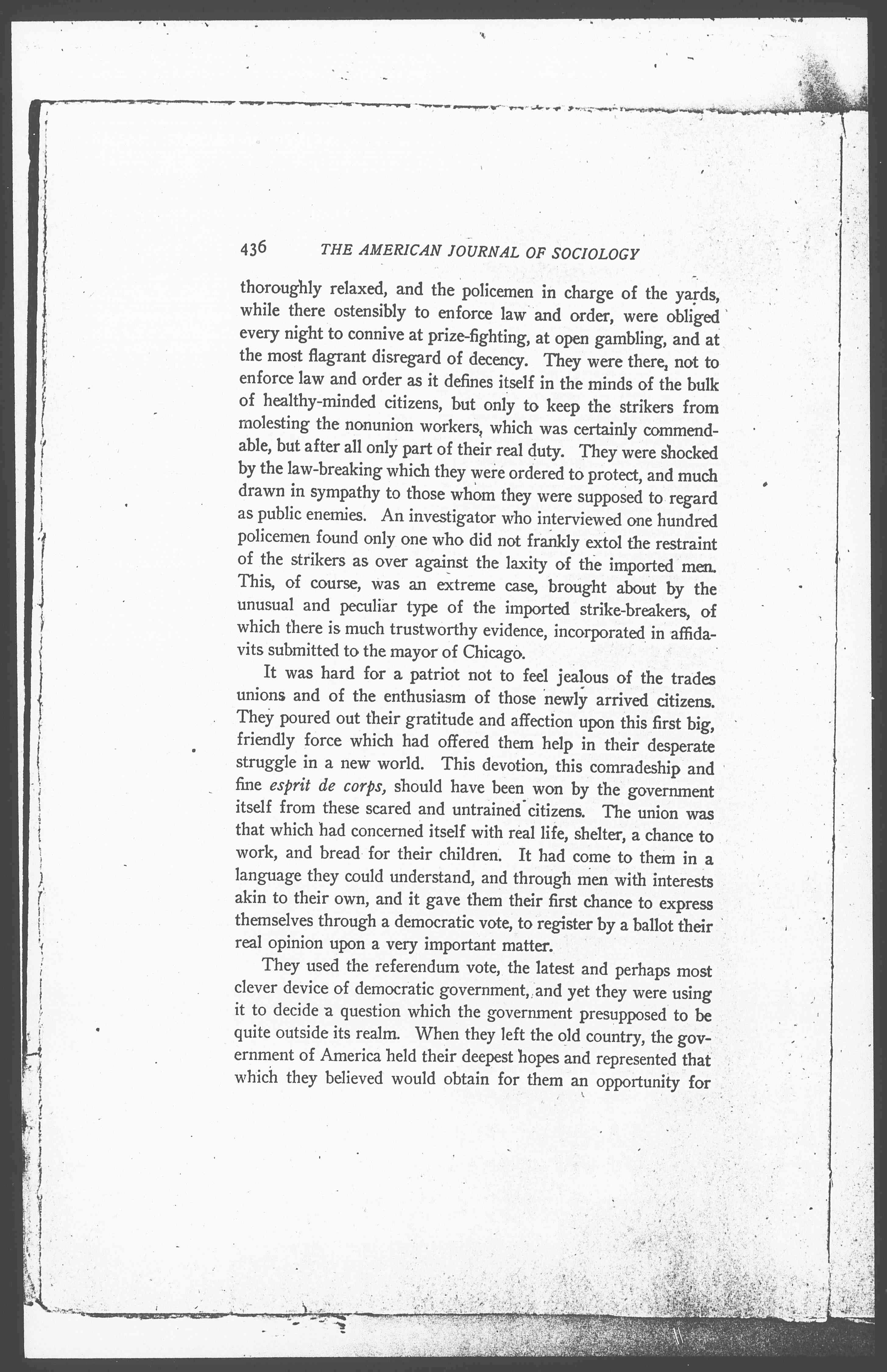 For years the city administrations, one after another, have protected the money interests invested in the Stock Yards, so that none of the sanitary ordinances have ever been properly enforced, until the sickening stench and the scum on the branch of the river known as "Bubbly Creek" at times make that section of the city unendurable. The smoke ordinances are openly ignored; nor did the city meat inspector ever seriously interfere with business, as a recent civil-service investigation has demonstrated; while the water-steals for which the Stock Yards finally became notorious must have been more or less known to certain officials. But all of this merely corrupted a limited number of inspectors, and although their corruption was complete and involved the entire administration, it did not actually touch large numbers of people. During the recent strike, however, twleve hundred policemen were called upon to patrol the yards inside and out -- actual men possessed of human sensibilities. There is no doubt that the police inspector of the district thoroughly represented the alliance of the City Hall and the business interests, and that he did not mean to discover anything which was deorgatory to the packers, nor to embarass them in any way during the conduct of the strike. But these twleve hundred men themselves were called upon to face a very peculiar situation because of the type of men and women who formed the bulk of the strike-breakers, and because in the first weeks of the strike these men and women were kept constantly inside the yards during day and night. In order to hold them there at all, discipline outside the working hours was [page 12] thoroughly relaxed, and the policemen in charge of the yards, while there ostensibly to enforce law and order, were obliged every night to connive at prize-fighting, at open gambling, and at the most flagrant disregard of decency. They were there, not to enforce law and order as it defines itself in the minds of the bulk of healthy-minded citizens, but only to keep the strikers from molesting the nonunion workers, which was certainly commendable, but after all only part of their real duty. They were shocked by the law-breaking which they were ordered to protect, and much drawn in sympathy to those whom they were supposed to regard as public enemies. An investigator who interviewed one hundred policemen found only one who did not frankly extol the restraint of the strikers as over against the laxity of the imported men. This, of course, was an extreme case, broguht about by the unusual and peculiar type of the imported strike-breakers, of which there is much trustworthy evidence, incorporated in affidavits submitted to the mayor of Chicago.
