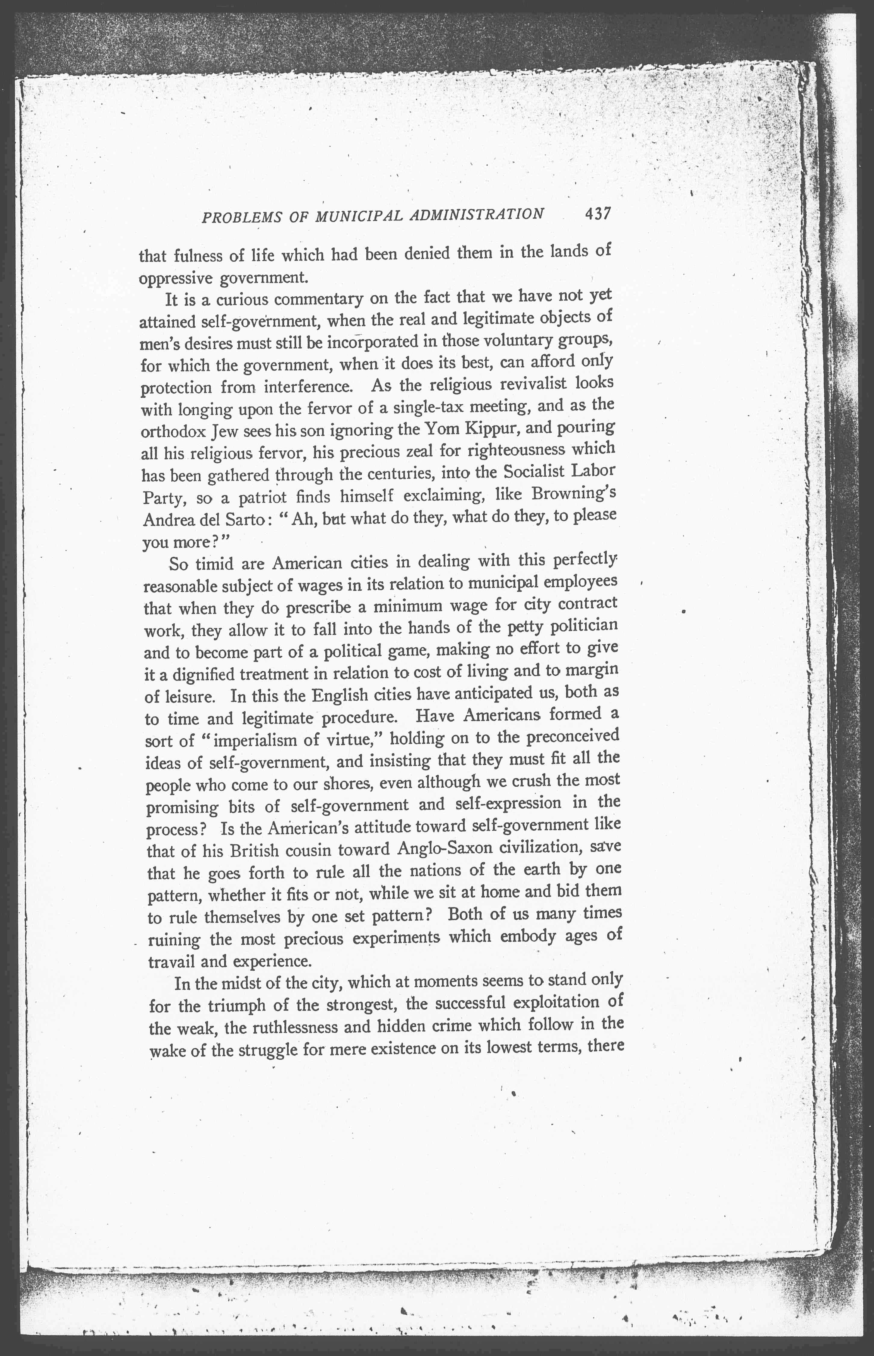 It is a curious commentary on the fact that we have not yet attained self-government, when the real and legitimate objects of men's desires must still be incorporated in those voluntary groups, for which the government, when it does its best, can afford only protection from interference. As the religious revivalist looks with longing upon the fervor of a single-taxing meeting, and as the Orthodox Jew sees his son ignoring the Yom Kippur, and pouring all his religious fervor, his precious zeal for righteousness which has been gathered through the centuries, into the Socialsit Labor Party, so a patriot finds himself exclaiming, like Browning's Andrea del Sarto: "Ah, but what do they, what do they, to please you more?"
