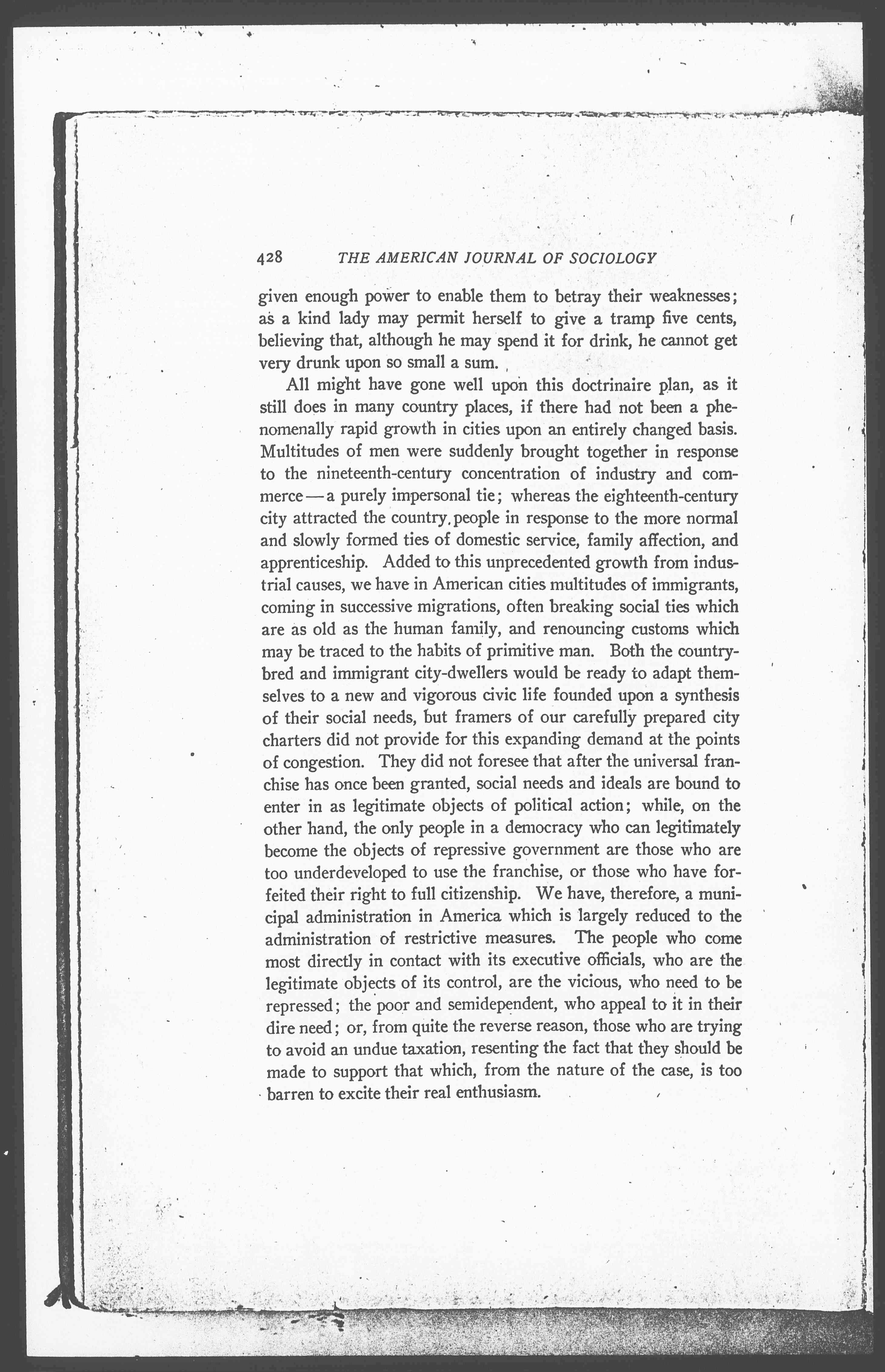 All might have gone well upon this doctrinaire plan, as it still does in many country places, if there had not been a phenomenally rapid growth in cities upon an entirely changed basis. Multitudes of men were suddenly brought together in response to the nineteenth-century concentration of industry and commerce--a purely impersonal tie; whereas the eighteenth-century city attracted the country people in response to the more normal and slowly formed ties of domestic service, family affection, and apprenticeship. Added to this unprecedented growth from industrial causes, we have in American cities multitudes of immigrants, coming in successive migrations, often breaking social ties which are as old as the human family, and renouncing customs which may be traced to the habits of primitive man. Both the country-bred and immigrant city-dwellers would be ready to adapt themselves to a new and vigorous civic life founded upon a synthesis of their social needs, but framers of our carefully prepared city charters did not provide for this expanding demand at the points of congestion. They did not foresee that after the universal franchise has once been granted, social needs and ideals are bound to enter in as legitimate objects of political action; while, on the other hand, the only people in a democracy who can legitimately become the objects of repressive government are those who are too underdeveloped to use the franchise, or those who have forfeited their right to full citizenship. We have, therefore, a municipal administration in America which is largely reduced to the administration of restrictive measures. The people who come most directly in contact with its executive officials, who are the legitimate objects of its control, are the vicious, who need to be repressed; the poor and semidependent, who appeal to it in their dire need; or, from quite the reverse reason, those who are trying to avoid an undue taxation, resenting the fact that they should be made to support that which, from the nature of the case, is too barren to excite their real enthusiasm. [page 5]