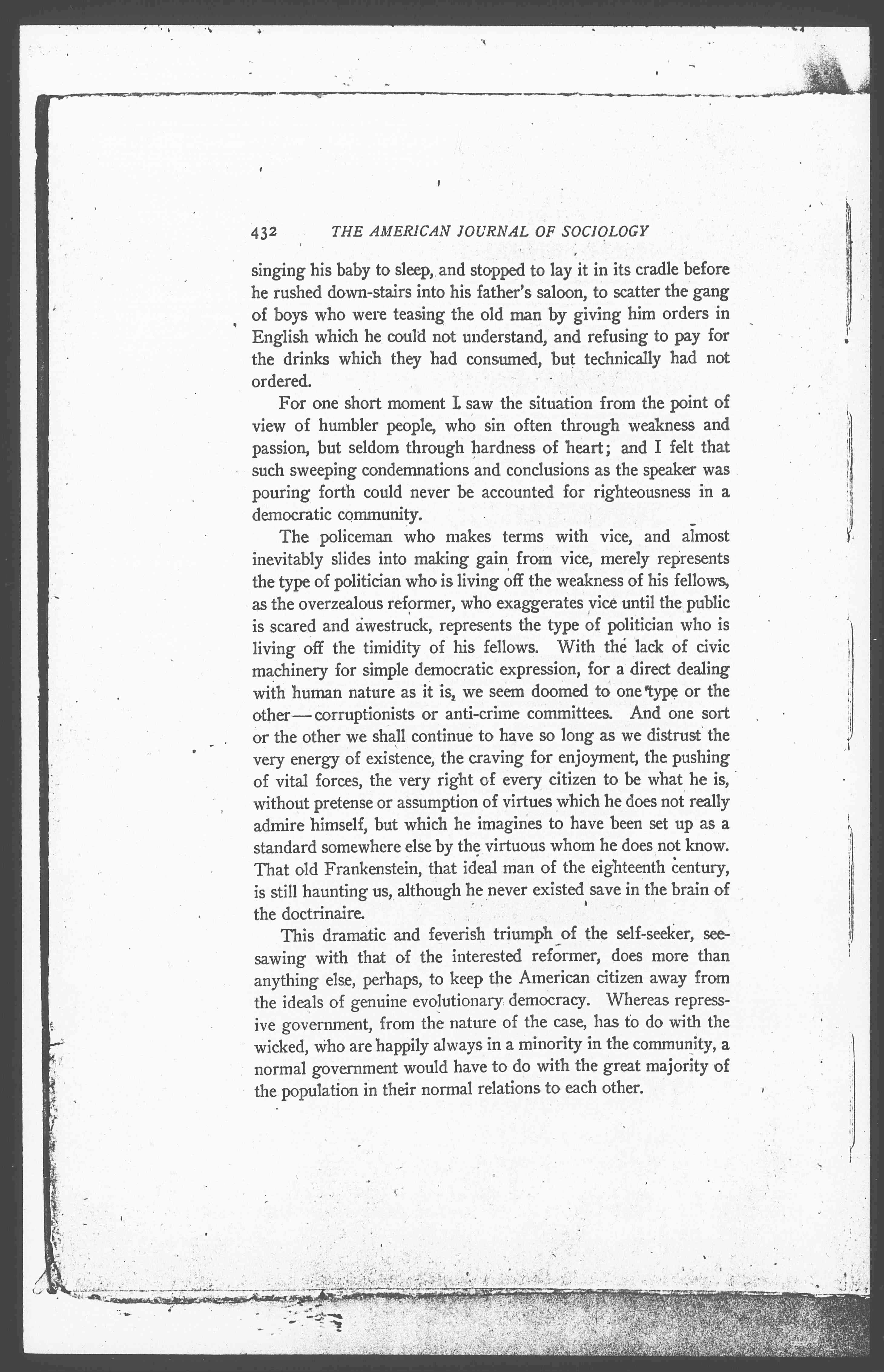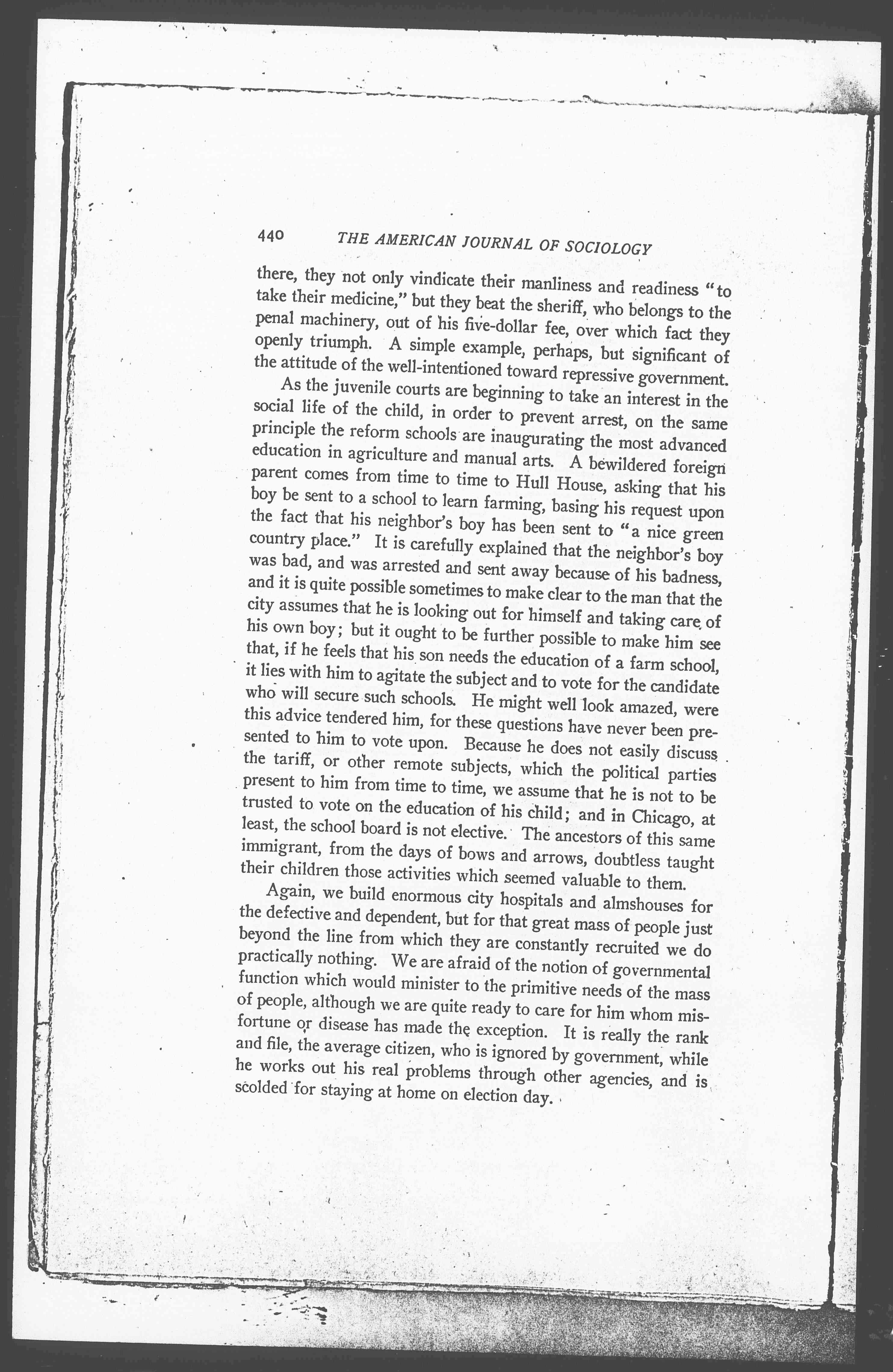 If I may illustrate from a personal experience: Some years ago a famous New York reformer came to Chicago to tell us of his phenomenal success and his trenchant methods of dealing with the city "gambling hells," as he chose to call them. He proceeded to describe the criminals of lower New York in terms and phrases which struck at least one of his auditors as sheer blasphemy against our common human nature. I thought of the criminals whom I knew, of the gambler for whom each Saturday I regularly collected his weekly wage of $24, keeping $18 for his wife and children, and giving him $6 on Monday morning. His despairing statement, "The thing is growing on me, and I can never give it up," was the cry of a man who, through much tribulation, had at least kept the loyal intention. I recalled three girls who had come to me with a paltry sum of money collected from the pawn and sale of their tawdry finery, that one of their number might be spared a death in the almshouse and have that wretched comfort during the closing weeks of her outcast life. I recalled the first murderer whom I had ever known -- a young man who was [page 8] singing his baby to sleep, and stopped to lay it in its cradle before he rushed [downstairs] into his father's saloon, to scatter the gang of boys who were teasing the old man by giving him orders in English which he could not understand, and refusing to pay for the drinks which they had consumed, but technically had not ordered.