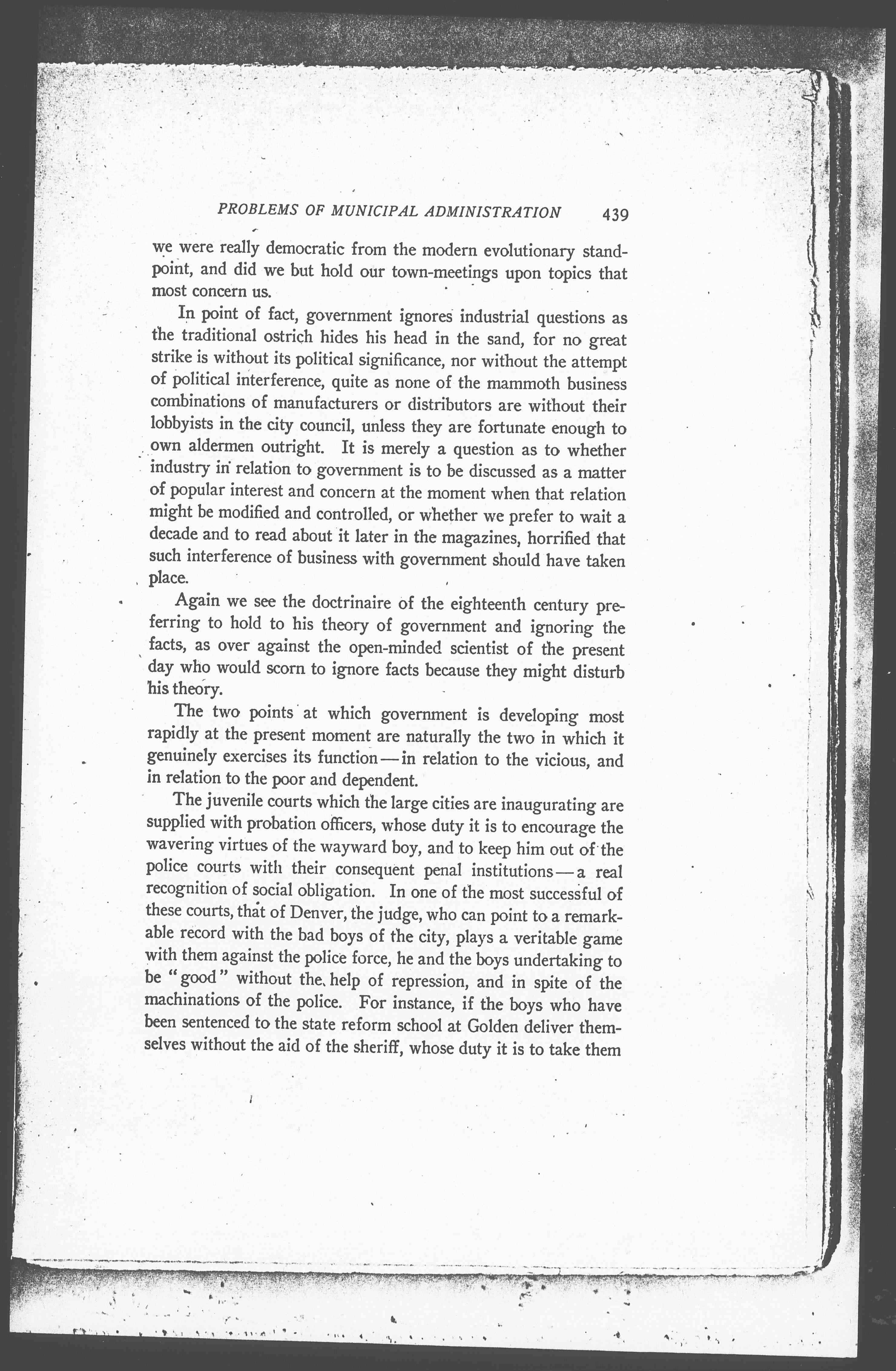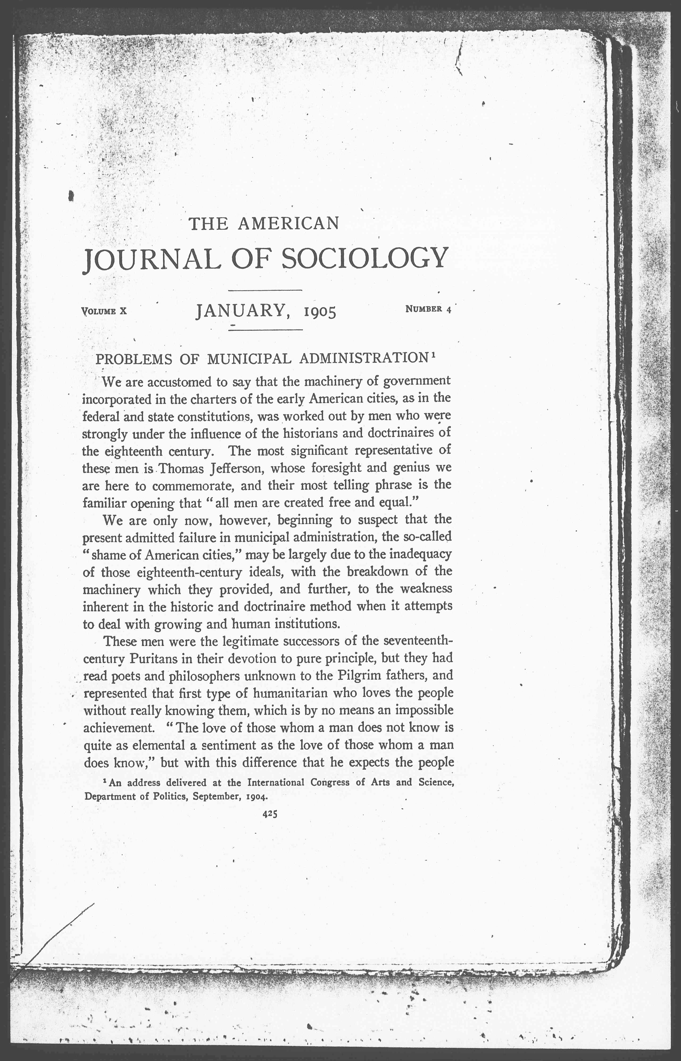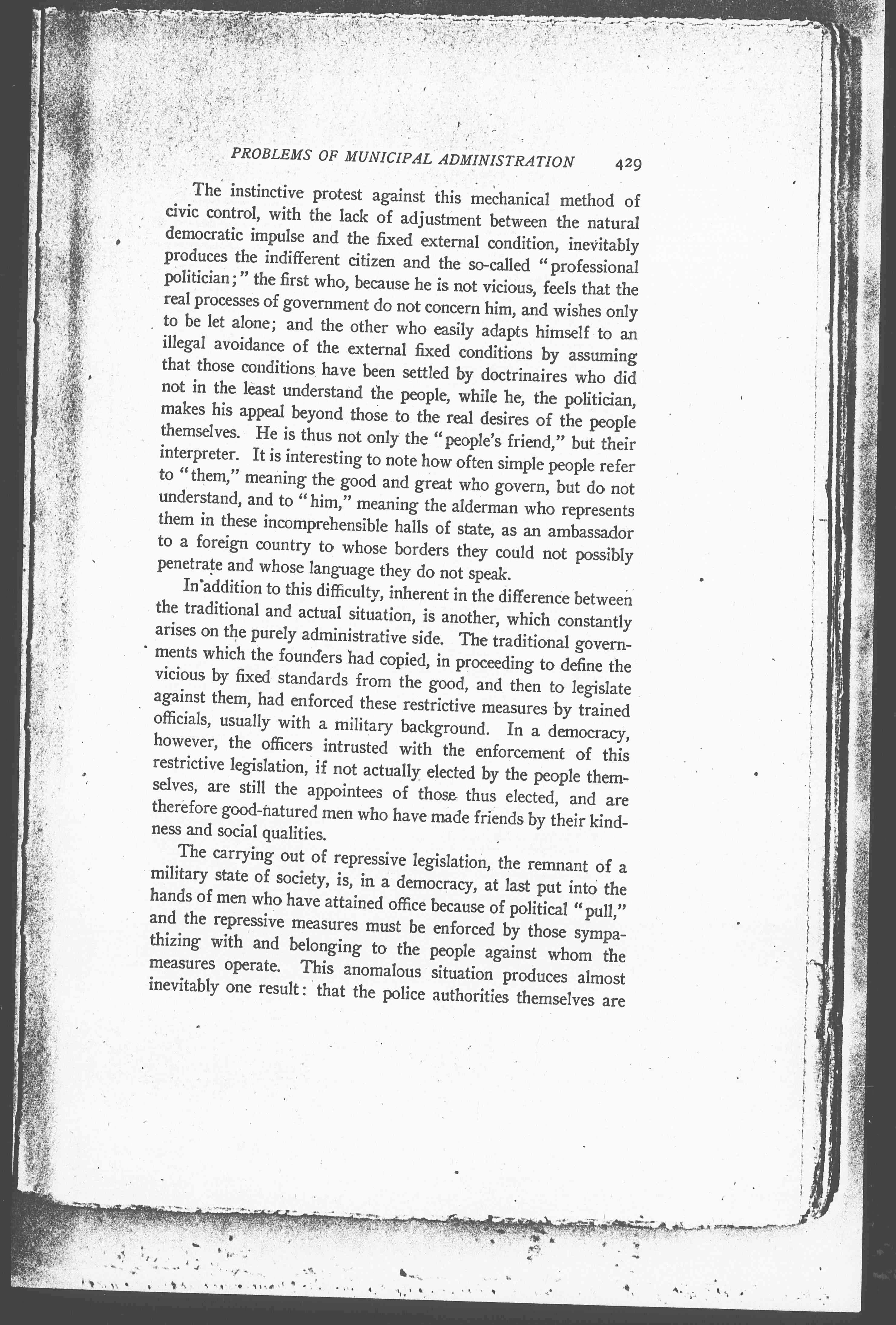 We are only now, however, beginning to suspect that the present admitted failure in municipal administration, the so-called "shame of American cities," may be largely due to the inadequacy of those eighteenth-century ideals, with the breakdown of the machinery which they provided, and further, to the weakness inherent in the historic and doctrinaire method when it attempts to deal with growing and human institutions.