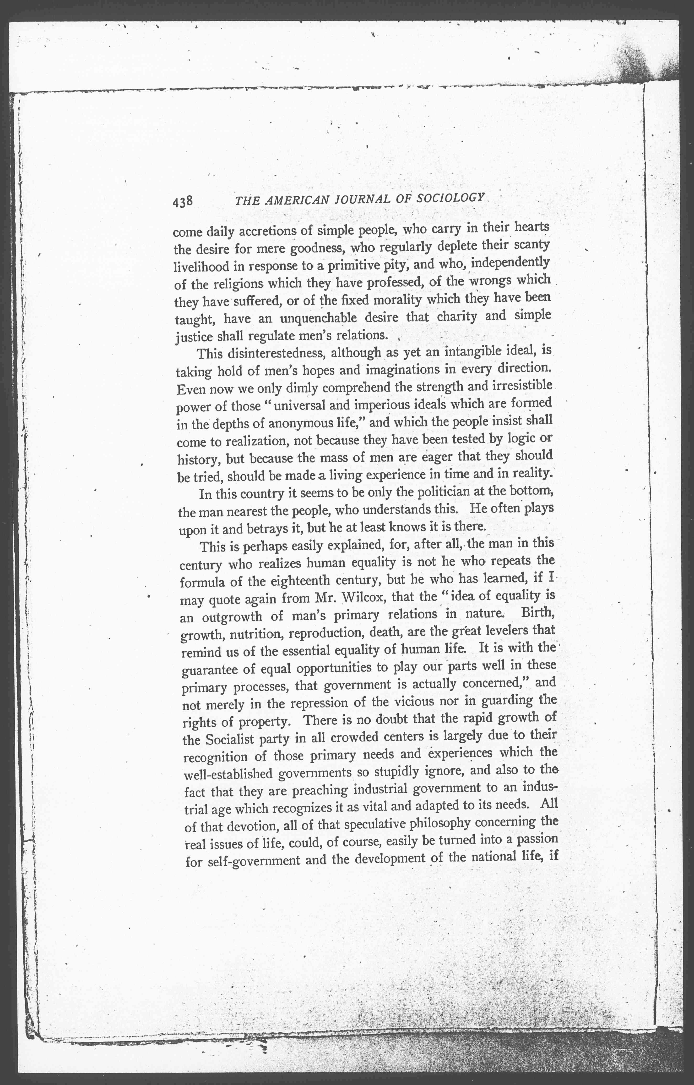 This is perhaps easily explained, for, after all, the man in this century who realizes human equality is not he who repeats the formula of the eighteenth century, but he who has learned, if I may quote again from Mr. Wilcox, that the "idea of equality is an outgrowth of man's primary relations in nature. Birth, growth, nutrition, reproduction, death, are the great levelers that remind us of the essential equality of human life. It is with the guarantee of equal opportunities to play our parts well in these primary processes, that government is actually concerned," and not merely in the repression of the vicious nor in guarding the rights of property. There is no doubt that the rapid growth of the Socialist party in all crowded centers is largely due to their recognition of those primary needs and experiences which the well-established governments so stupidly ignore, and also to the fact that they are preaching industrial government to an industrial age which recognizes it as vital and adapted to its needs. All of that devotion, all of that speculative philosophy concerning the real issues of life, could, of course, easily be turned into a passion for self-government and the development of the national life, if [page 15] we were really democratic from the modern evolutionary standpoint, and did we but hold our town-meetings upon topics that most concern us.