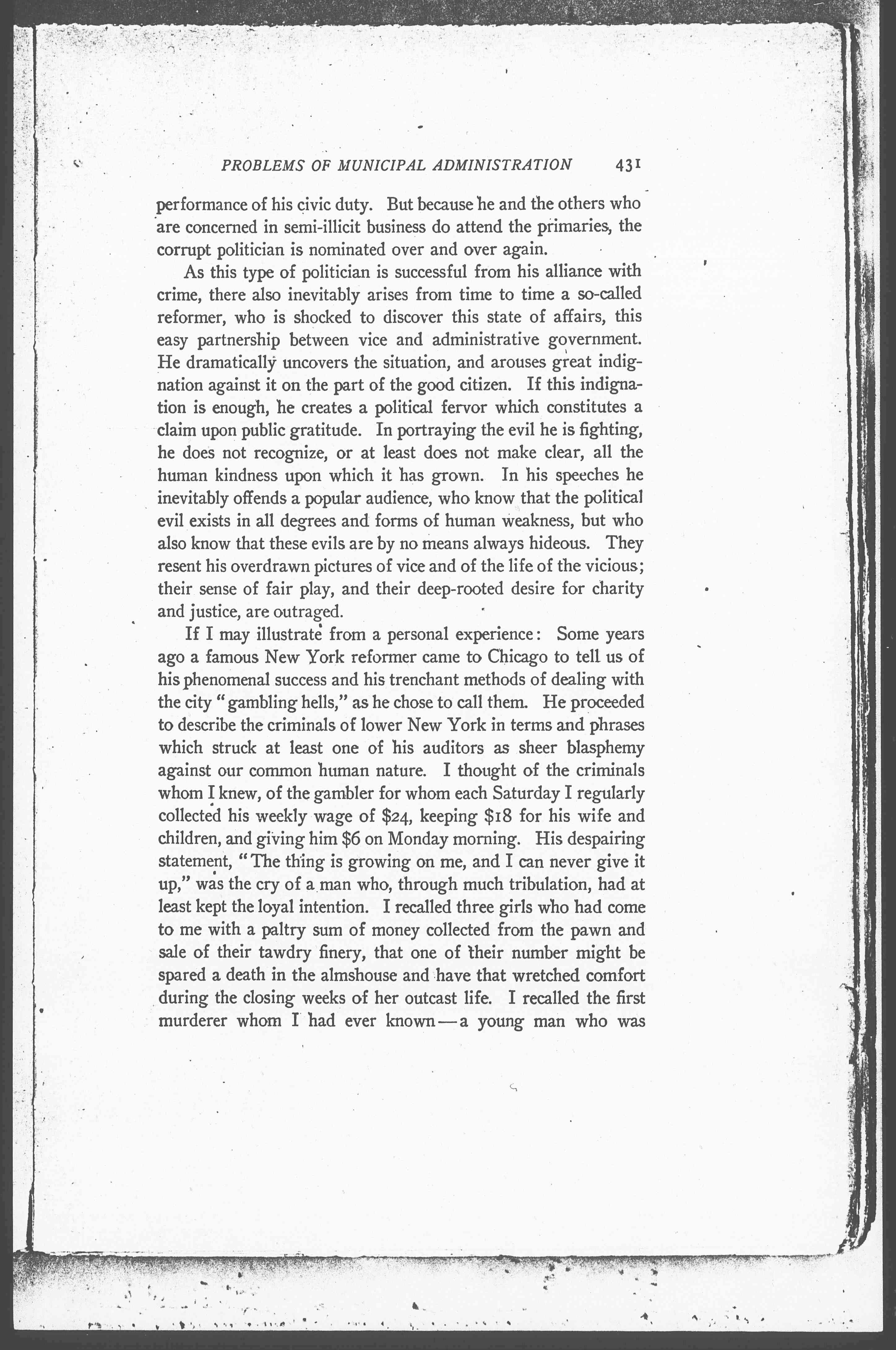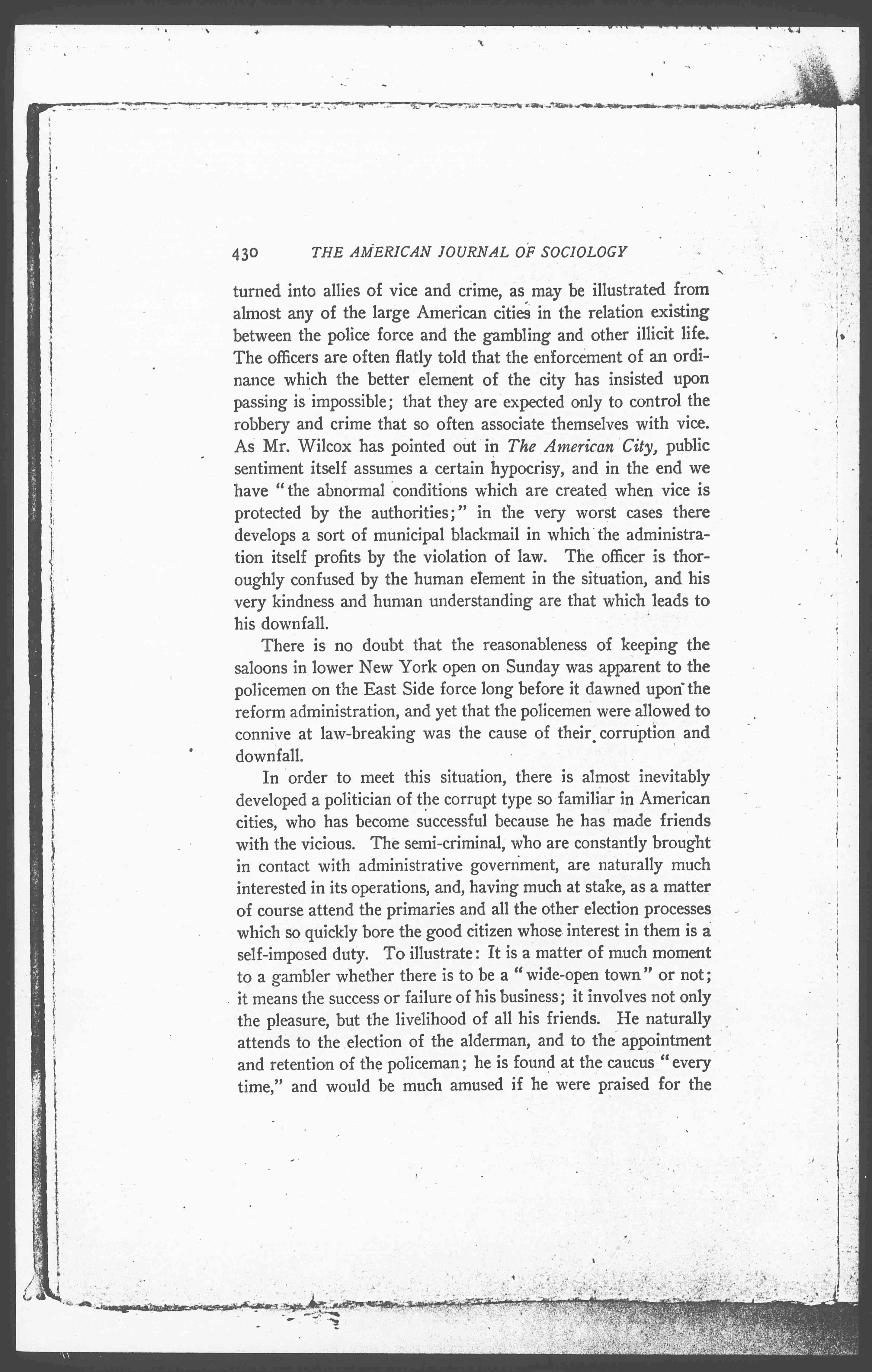 In order to meet this situation, there is almost inevitably developed a politician of the corrupt type so familiar in American cities, who has become successful because he has made friends with the vicious. The semi-criminal, who are constantly brought in contact with administrative government, are naturally much interested in its operations, and, having much at stake, as a matter of course attend the primaries and all the other election processes which so quickly bore the good citizen whose interest in them is a self-imposed duty. To illustrate: It is a matter of much moment to a gambler whether there is to be a "wide-open town" or not; it means the success or failure of his business; it involves not only the pleasure, but the livelihood of all his friends. He naturally attends to the election of the alderman, and to the appointment and retention of the policeman; he is found at the caucus "every time," and would be much amused if he were praised for the [page 7] performance of his civic duty. But because he and the others who are concerned in semi-illicit business do attend the primaries, the corrupt politician is nominated over and over again.