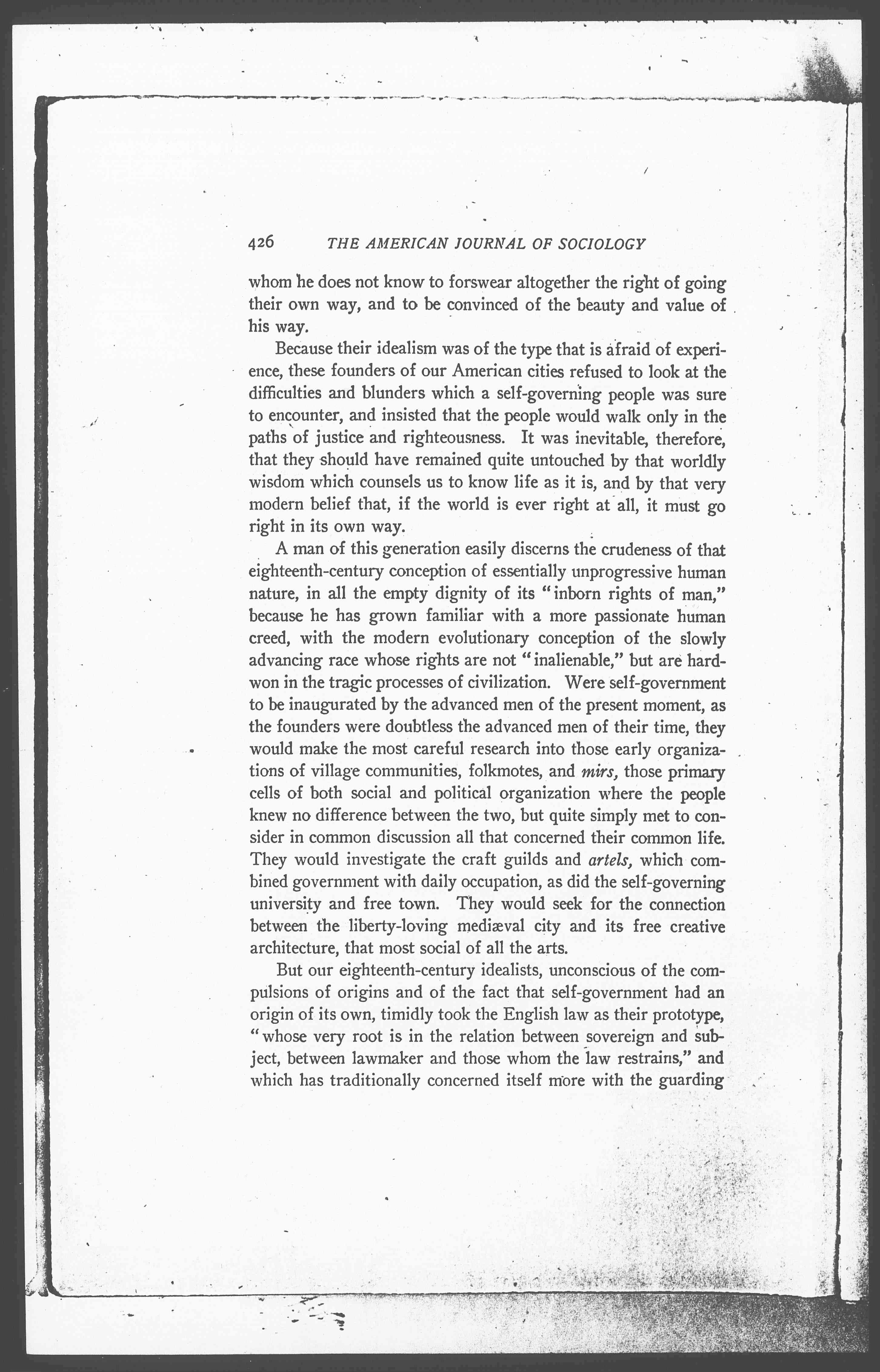 A man of this generation easily discerns the crudeness of that eighteenth-century conception of essentially unprogressive human nature, in all the empty dignity of its "inborn rights of man," because he has grown familiar with a more passionate human creed, with the modern evolutionary conception of the slowly advancing race whose rights are not "inalienable," but are hard-won in the tragic processes of civilization. Were self-government to be inaugurated by the advanced men of the present moment, as the founders were doubtless the advanced men of their time, they would make the most careful research into those early organizations of village communities, folkmotes, and mirs, those primary cells of both social and political organization where the people knew no difference between the two, but quite simply met to consider in common discussion all that concerned their common life. They would investigate the craft guilds and artels, which combined government with daily occupation, as did the self-governing university and free town. They would seek for the connection between the liberty-loving [medieval] city and its free creative architecture, that most social of all the arts.