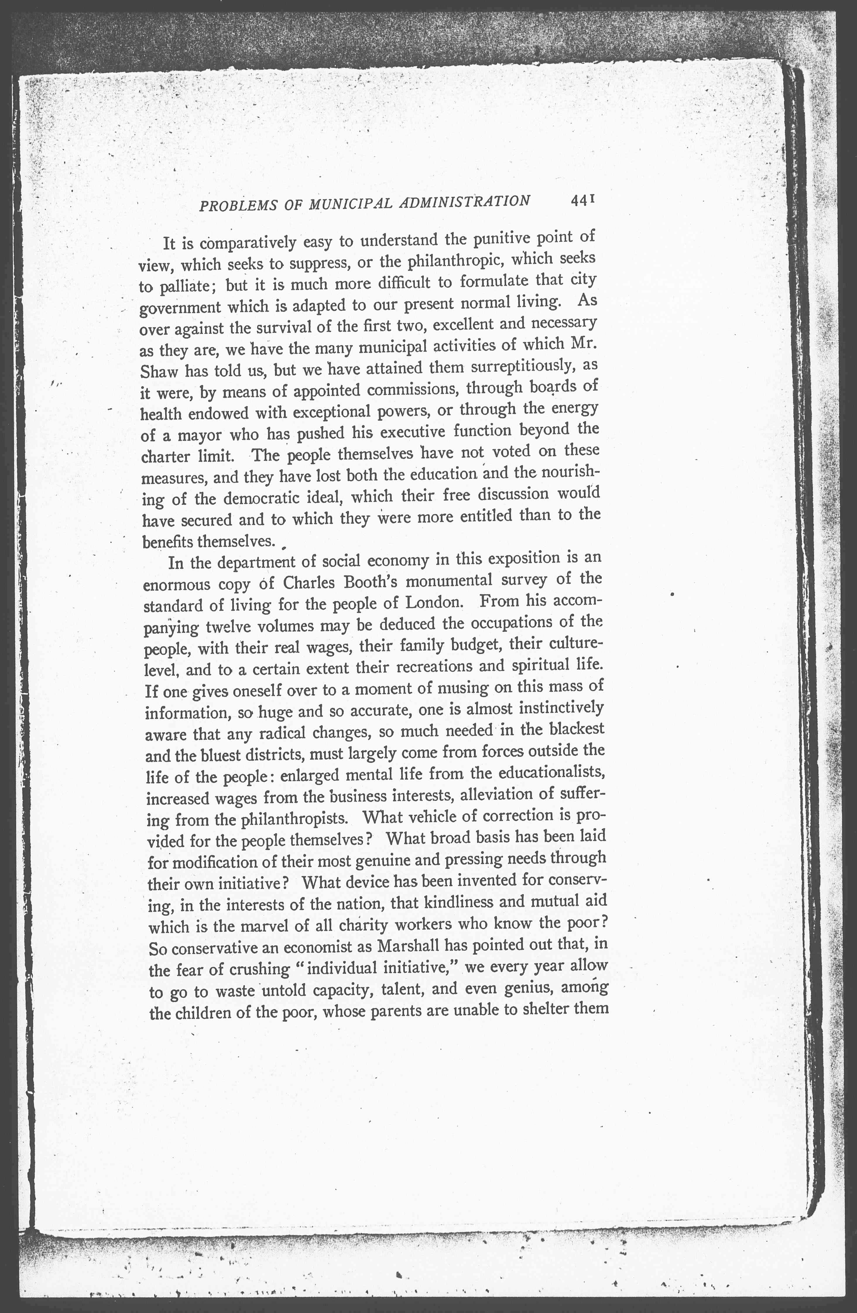 Again, we build enormous city hospitals and almshouses for the defective and dependent, but for that great mass of people just beyond the line from which they are constantly recruited we do practically nothing. We are afraid of the notion of governmental function which would minister to the primitive needs of the mass of people, although we are quite ready to care for him whom misfortunate or disease has made the exception. It is really the rank and file, the average citizen, who is ignored by government, while he works out his real problems through other agencies, and is scolded for staying at home on election day. [page 17]