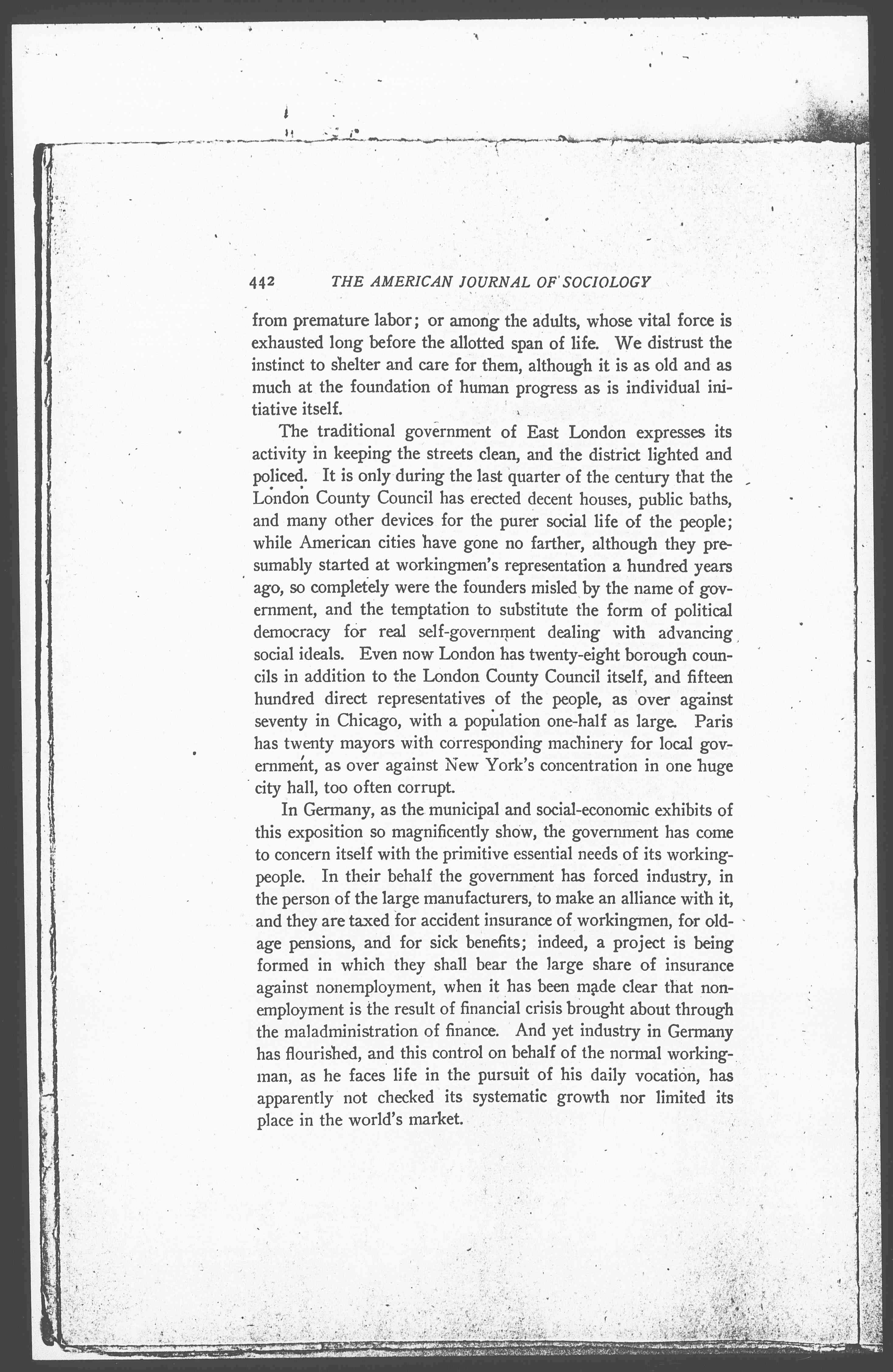 In Germany, as the munincipal and social-economic exhibits of this exposition so magnificently show, the government has come to concern itself with the primitive essential needs of its working-people. In their behalf the government has forced industry, in the person of the large manufacturers, to make an alliance with it, and they are taxed for accident insurance of workingmen, for old age pensions, and for sick benefits; indeed, a project is being formed in which they shall bear the large share of insurance against nonemployment, when it has been made clear that nonemployment is the result of financial crisis brought about through the maladministration of finance. And yet industry in Germany has flourished, and this control on behalf of the normal workingman, as he faces life in the pursuit of his daily vocation, has apparently not checked its systematic growth nor limited its place in the world's market. [page 19]