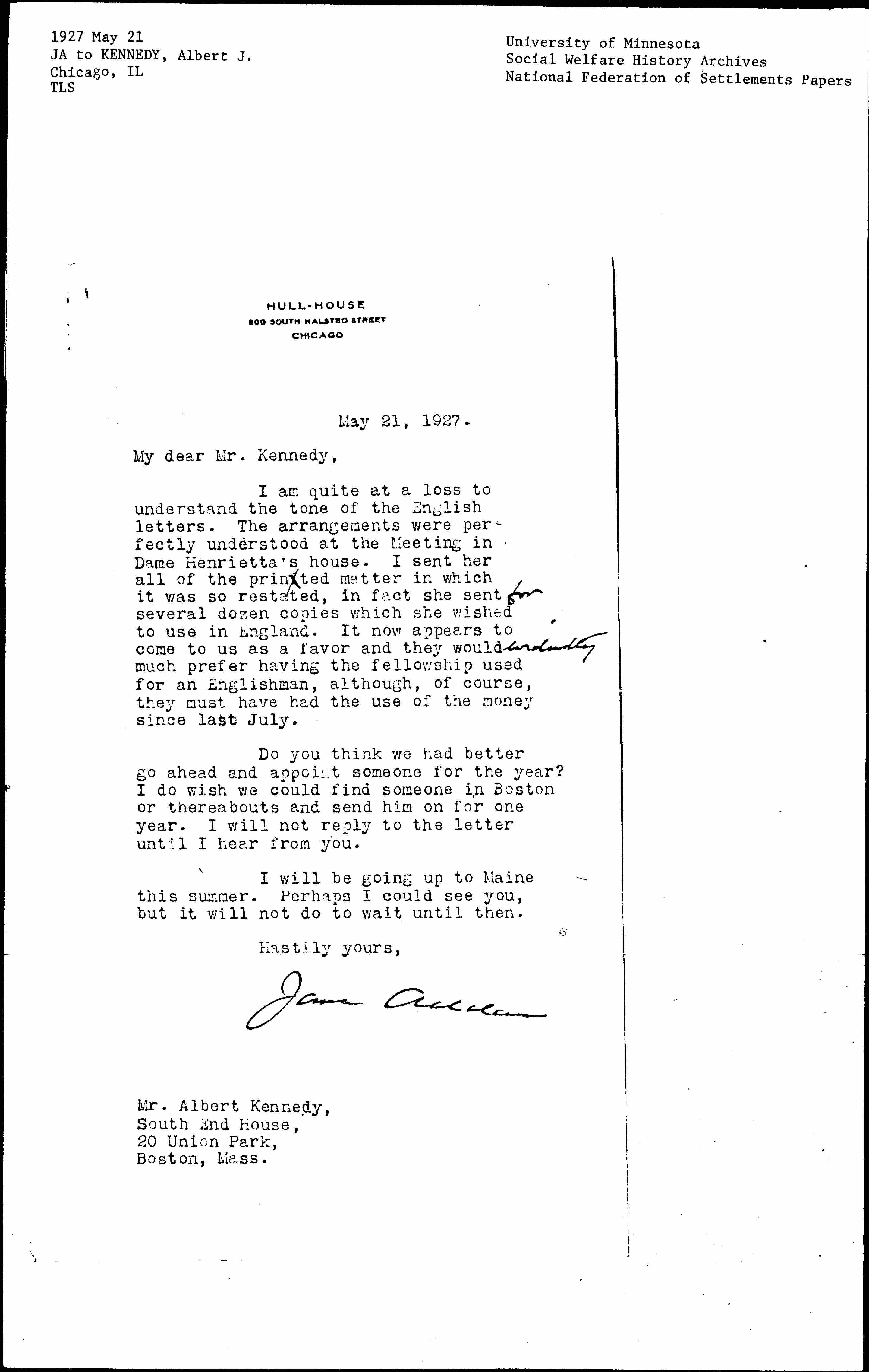 Do you think we had better go ahead and appoint someone for the year? I do wish we could find someone in Boston or thereabouts and send him on for one year. I will not reply to the letter until I hear from you.