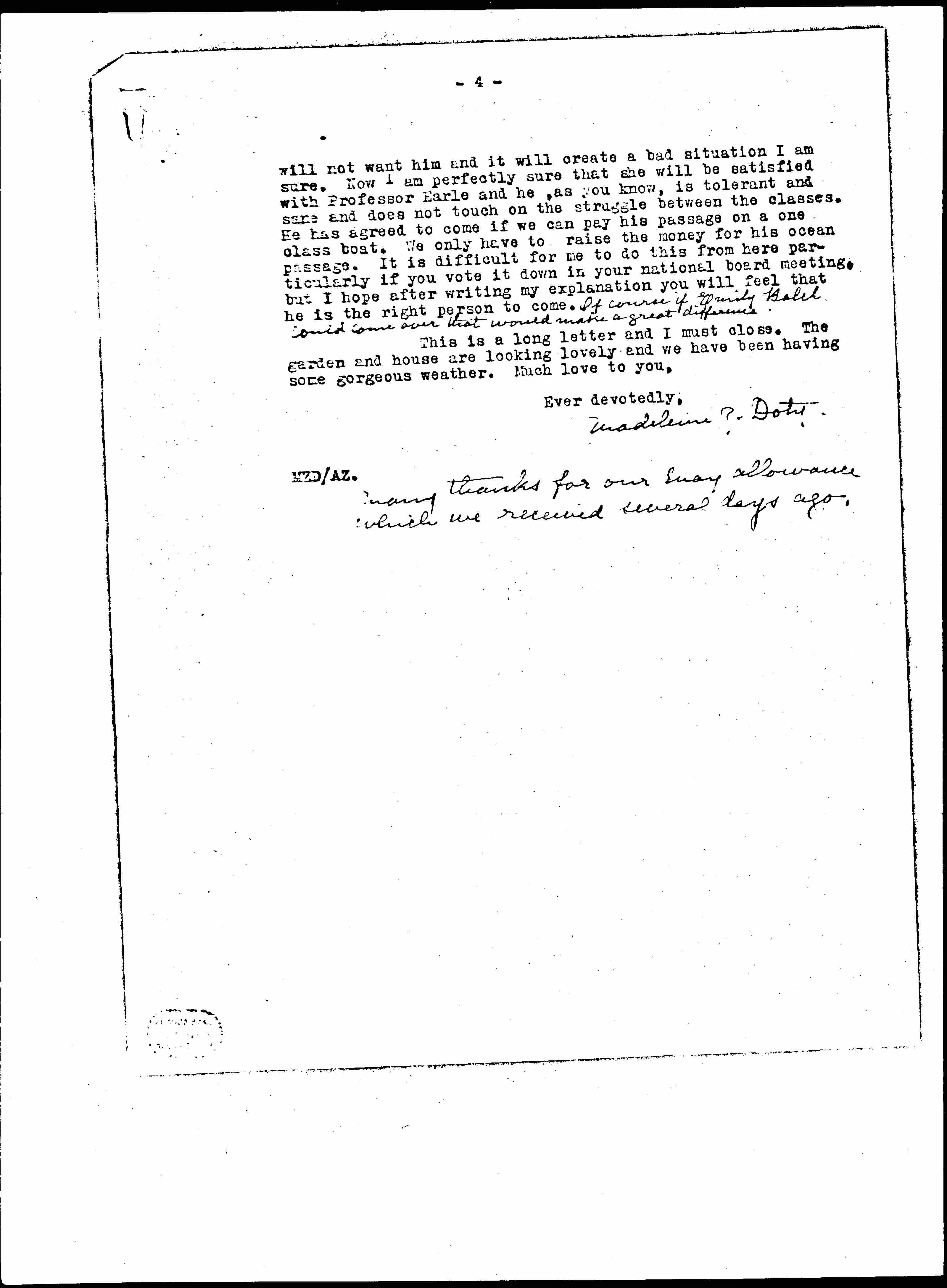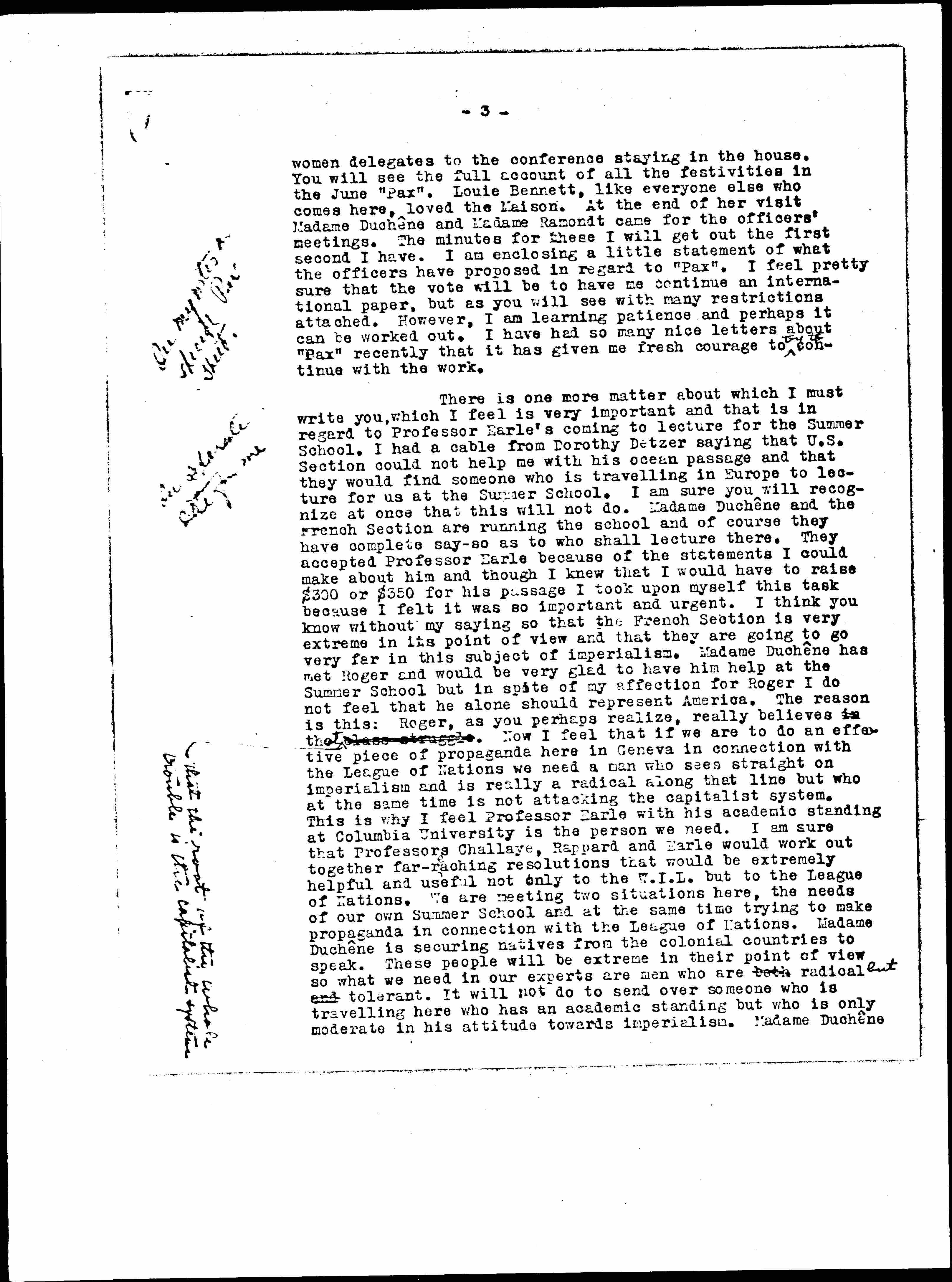 There is one more matter about which I must write you, which I feel is very important and that is in regard to Professor Earle's coming to lecture for the Summer School. I had a cable from Dorothy Detzer saying that U.S. Section could not help me with his ocean passage and that they would find someone who is [traveling] in Europe to lecture for us at the Summer School. I am sure you will recognize at once that this will not do. Madame Duchêne and the French Section are running the school and of course they have complete say-so as to who shall lecture there. They accepted Professor Earle because of the statements I could make about him and though I knew that I would have to raise $300 or $350 for his passage I took upon myself this task because I felt it was so important and urgent. I think you know without my saying so that the French Section is very extreme in its point of view and that they are going to go very far in this subject of imperialism. Madame Duchêne has met Roger and would be very glad to have him help at the Summer School but in spite of my affection for Roger I do not feel that he alone should represent America. The reason is this: Roger, as you perhaps realize, really believes in class struggle that [written in left margin] ↑that the root of the whole trouble is the capitalist system↓. Now I feel that if we are to do an effective piece of propaganda here in Geneva in connection with the League of Nations we need a man who sees straight on imperialism and is really a radical along that line but who at the same time is not attacking the capitalist system. This is why I feel Professor Earle with his academic standing at Columbia University is the person we need. I am sure that Professors Challaye, Rappard and Earle would work out together far-reaching resolutions that would be extremely helpful and useful not only to the W.I.L. but to the League of Nations. We are meeting two situations here, the needs of our own Summer School and at the same time trying to make propaganda in connection with the League of Nations. Madame Duchêne is securing natives from the colonial countries to speak. These people will be extreme in their point of view so what we need in our experts are men who are both radical ↑but↓ and tolerant. It will not do to send over someone who is [traveling] here who has an academic standing but who is only moderate in his attitude toward imperialism. Madame Duchêne [page 4] will not want him and it will create a bad situation I am sure. Now I am perfectly sure that she will be satisfied with Professor Earle and he, as you know, is tolerant and sane and does not touch on the struggle between classes. He has agreed to come if we can pay his passage on a one class boat. We only have to raise the money for his ocean passage. It is difficult for me to do this from here particularly if you vote it down in your national board meeting, but I hope after writing my explanation you will feel that he is the right person to come. ↑Of course if Emily Balch could come over that would make a great difference.↓