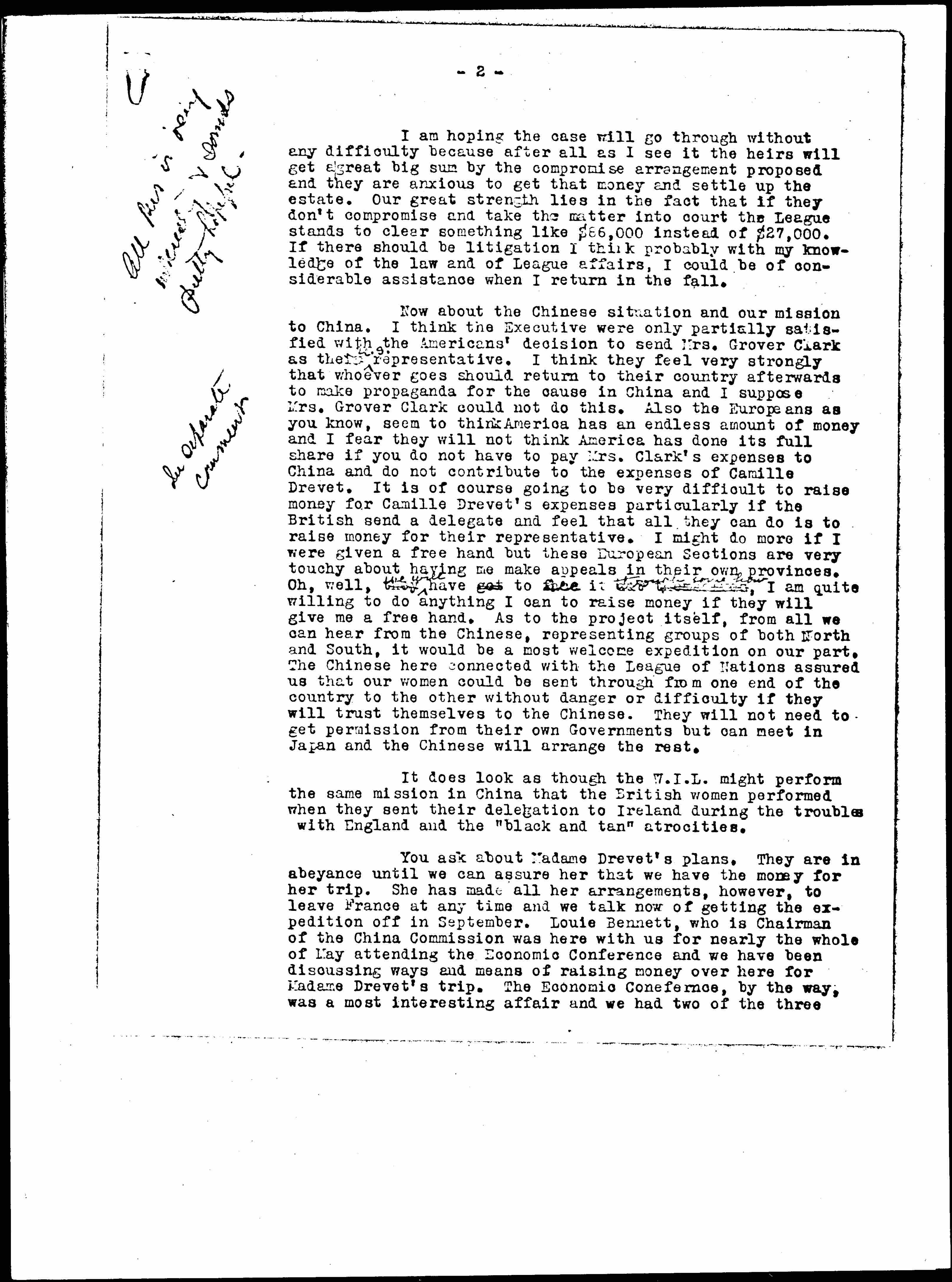 Now about the Chinese situation and our mission to China. I think the Executive were only partially satisfied with the Americans' decision to send Mrs. Grover Clark as their ↑U.S.↓ representative. I think they feel very strongly that whoever goes should return to their country afterwards to make propaganda for the cause in China and I suppose Mrs. Grover Clark could not do this. Also the Europeans as you know, seem to think America has an endless amount of money and I fear they will not think America has done its full share if you do not have to pay Mrs. Clark's expenses to China and do not contribute to the expenses of Camille Drevet. It is of course going to be very difficult to raise money for Camille Drevet's expenses particularly if the British send a delegate and feel that all they can do is to raise money for their representative. I might do more if I were given a free hand but these European Sections are very touchy about having me make appeals in their provinces. Oh, well, they ↑they will↓ have got to [illegible] ↑see↓ it [illegible] ↑through some how↓, I am quite willing to do anything I can to raise money if they will give me a free hand. As to the project itself, from all we can hear from the Chinese, representing groups of both North and South, it would be a most welcome expedition on our part. The Chinese here connected with the League of Nations assured us that our women could be sent through from one end of the country to the other without danger or difficulty if they will trust themselves to the Chinese. They will not need to get permission from their own Governments but can meet in Japan and the Chinese will arrange the rest.