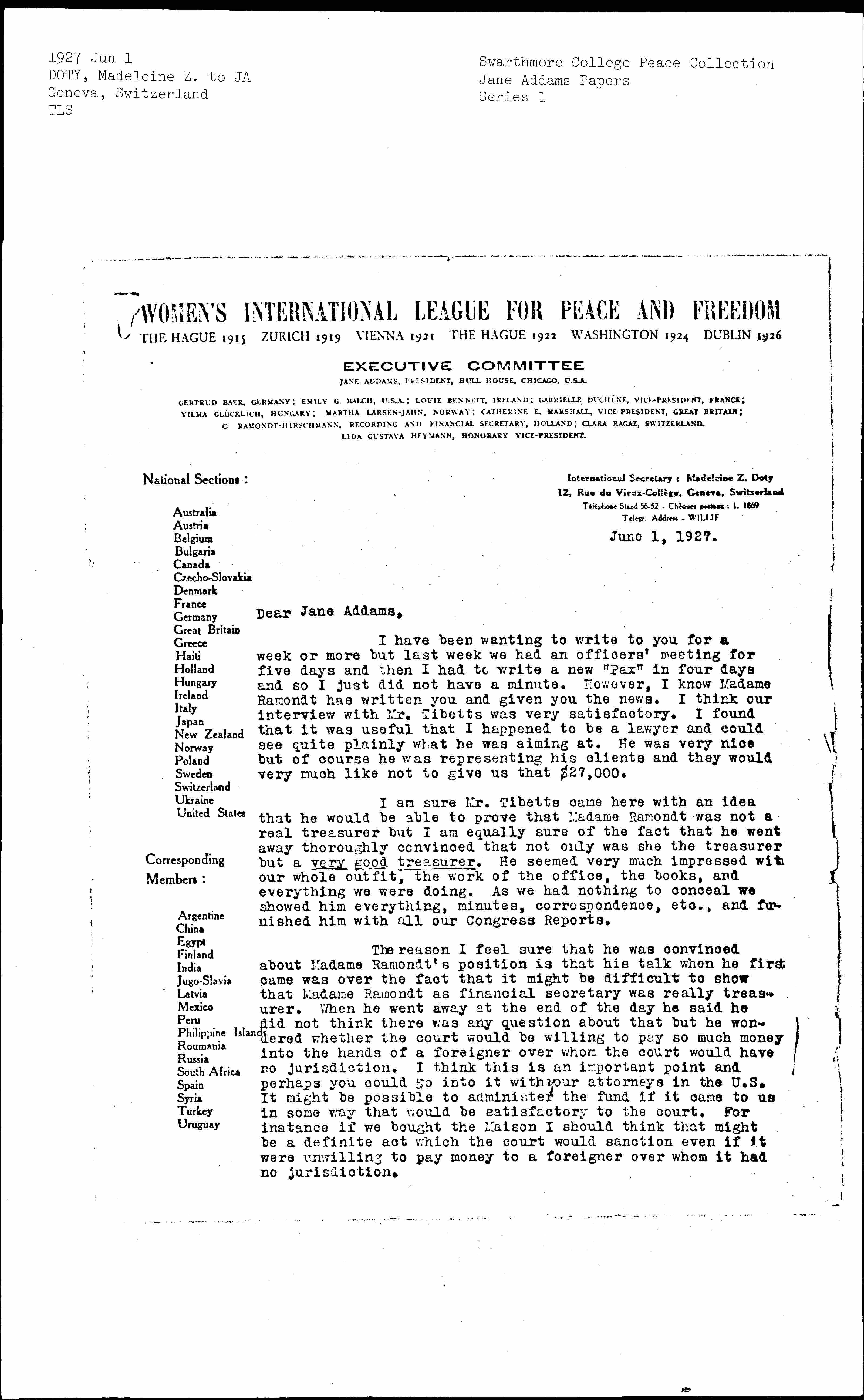 I have been wanting to write to you for a week or more but last week we had an officers' meeting for five days and then I had to write a new "Pax" in four days and so I just did not have a minute. However, I know Madame Ramondt has written you and given you the news. I think our interview with Mr. [Tibbetts] was very satisfactory. I found that it was useful that I happened to be a lawyer and could see quite plainly what he was aiming at. He was very nice but of course he was representing his clients and they would very much like not to give us that $27,000.