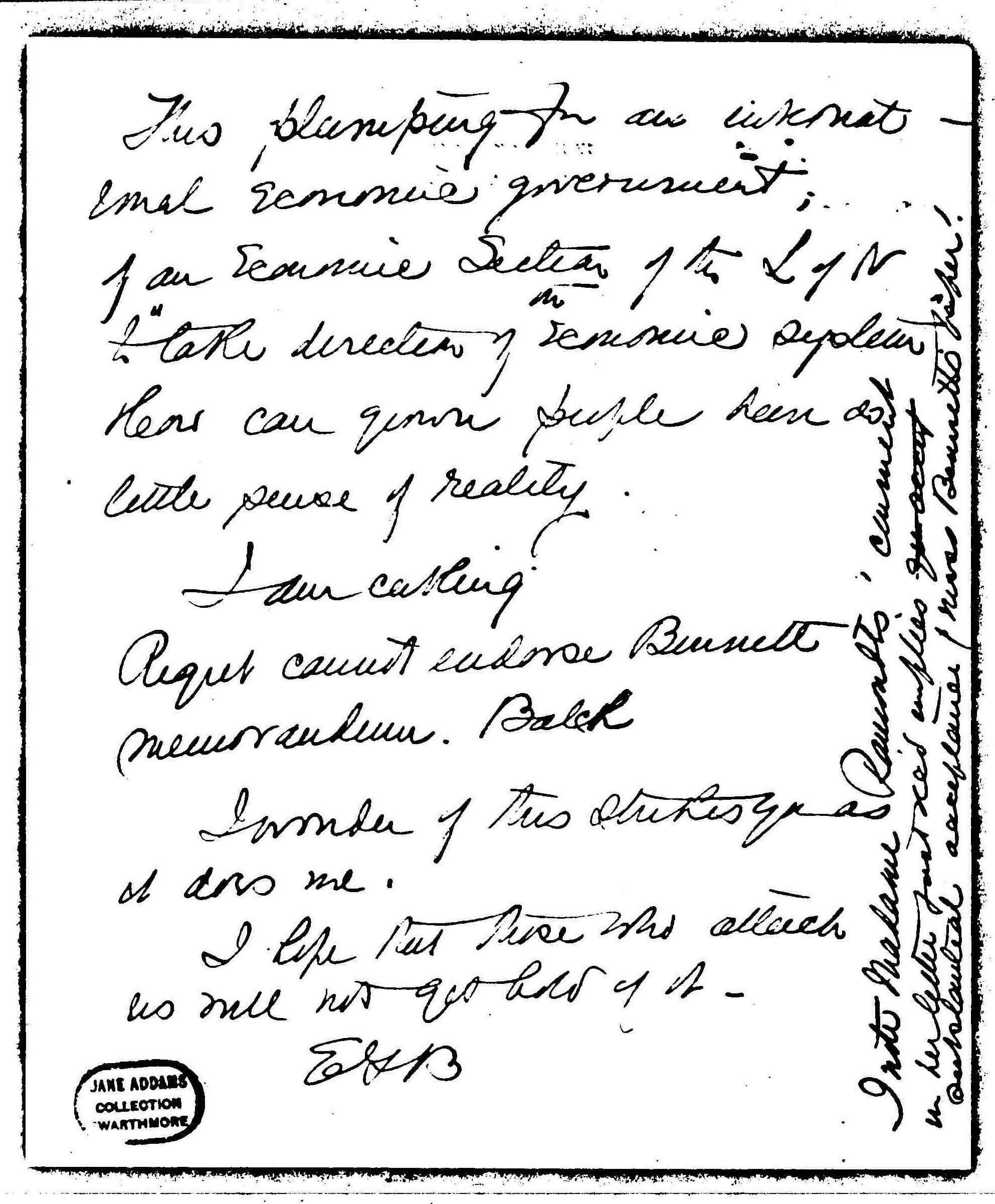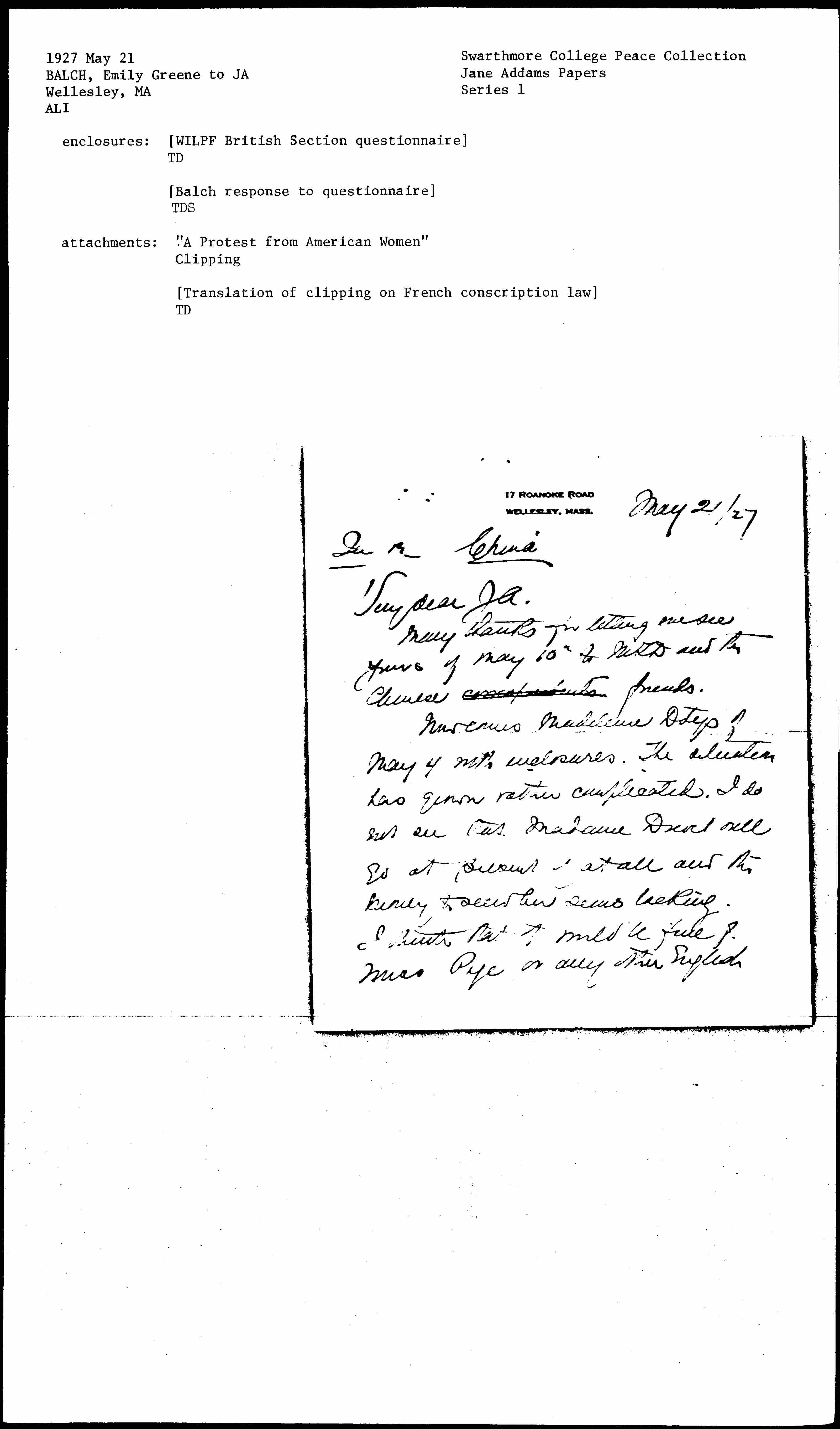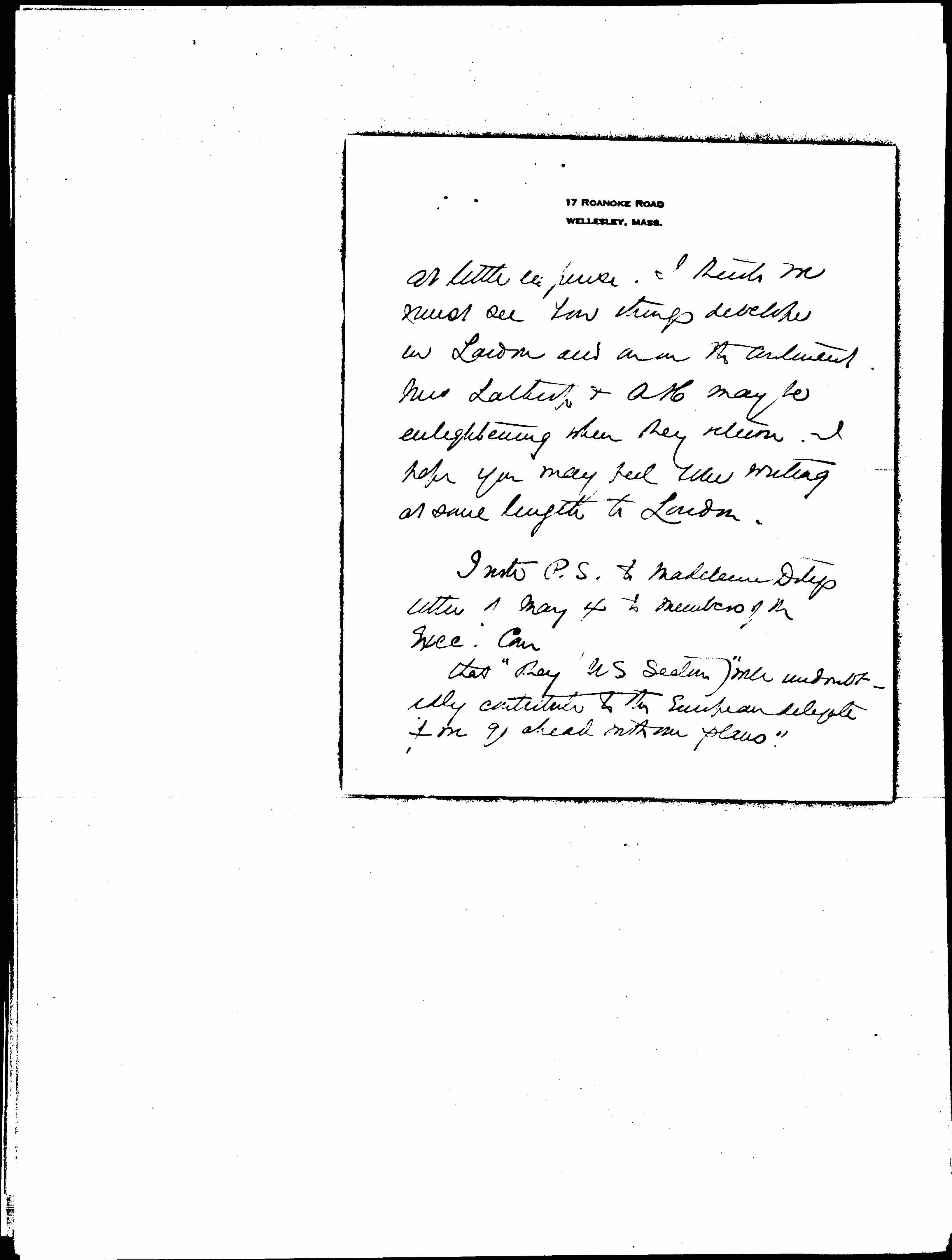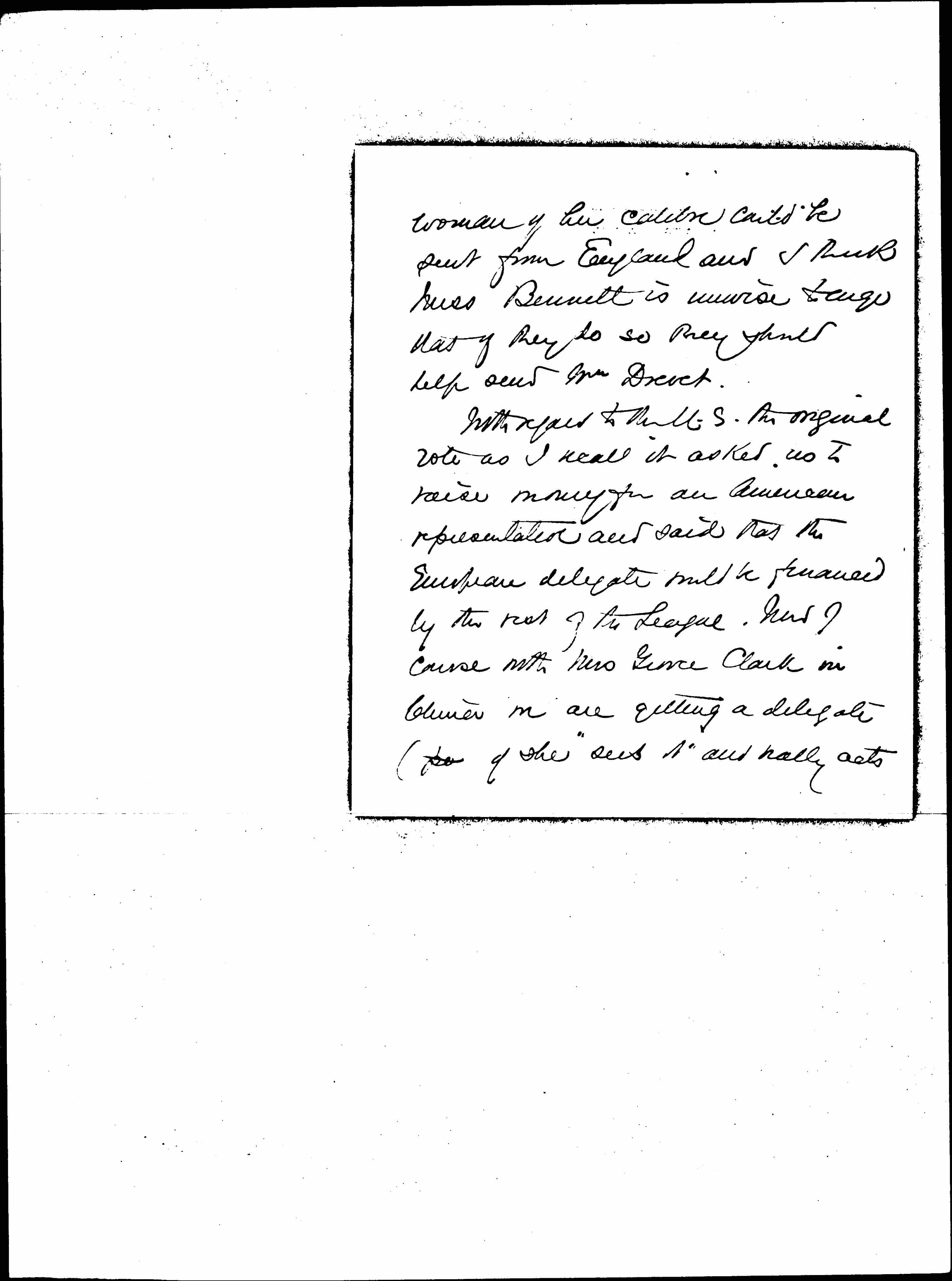 With regard to the U.S. the original vote as I recall it asked us to raise money for an American representative and said that the European delegate would be financed by the rest of the League. Now of course with Mrs Grover Clark in China we are getting a delegate (po if she "sees it" and really acts [page 3] at little expense). I think we must see how things [develop] in London and [on?] the continent. Miss Lathrop & A H may be enlightening when they return. I hope you may feel like writing at some length to London.