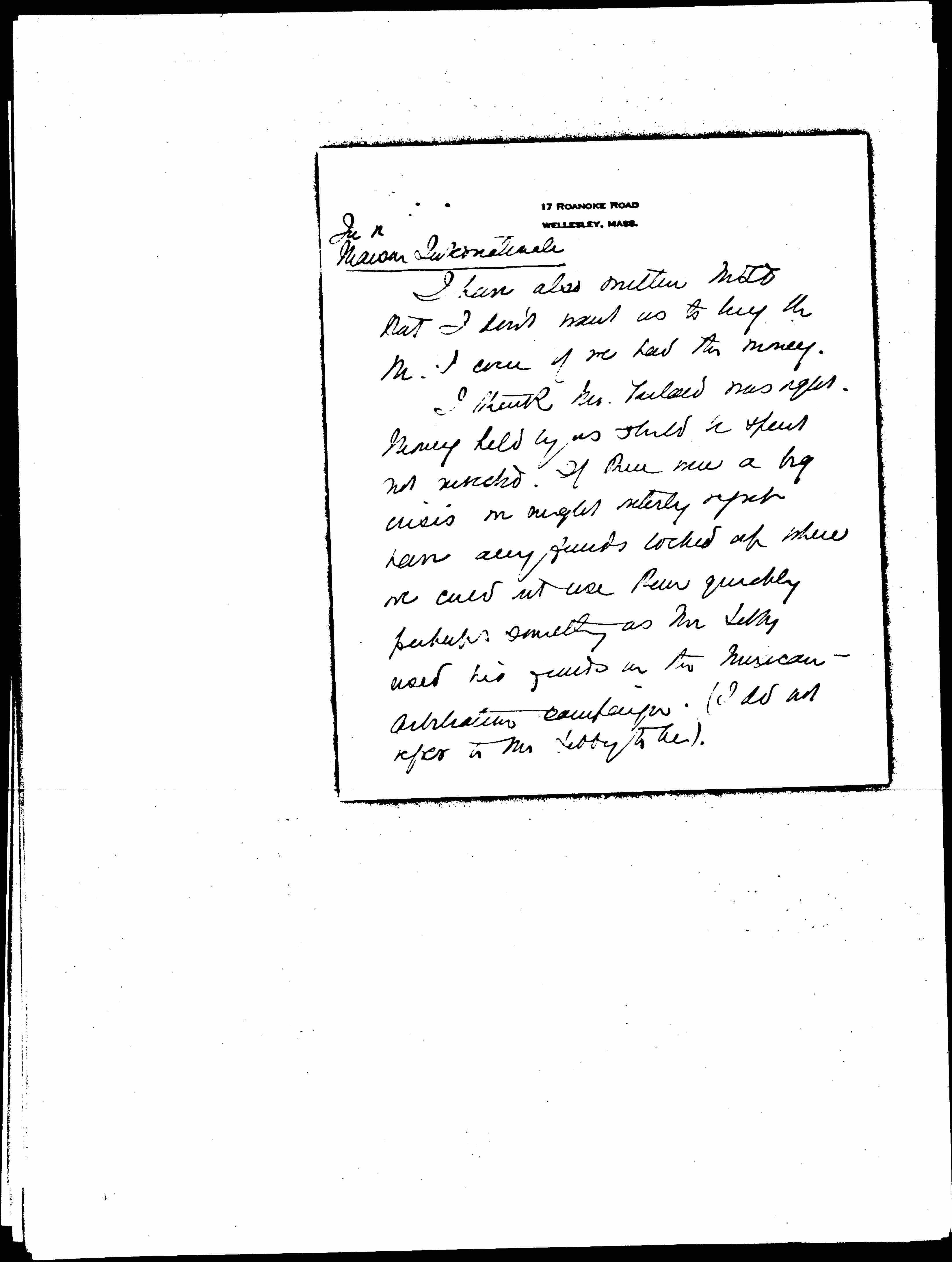 I think Mr. [Tailard?] was right. Money held by us should be spent not [illegible]. If there were a big crisis we might utterly regret have any funds locked up where we could not use them quickly perhaps something as Mr Libby used his funds on the Mexican-Arbitration campaign. (I do not refer to Mr. Libby to be). [page 5]