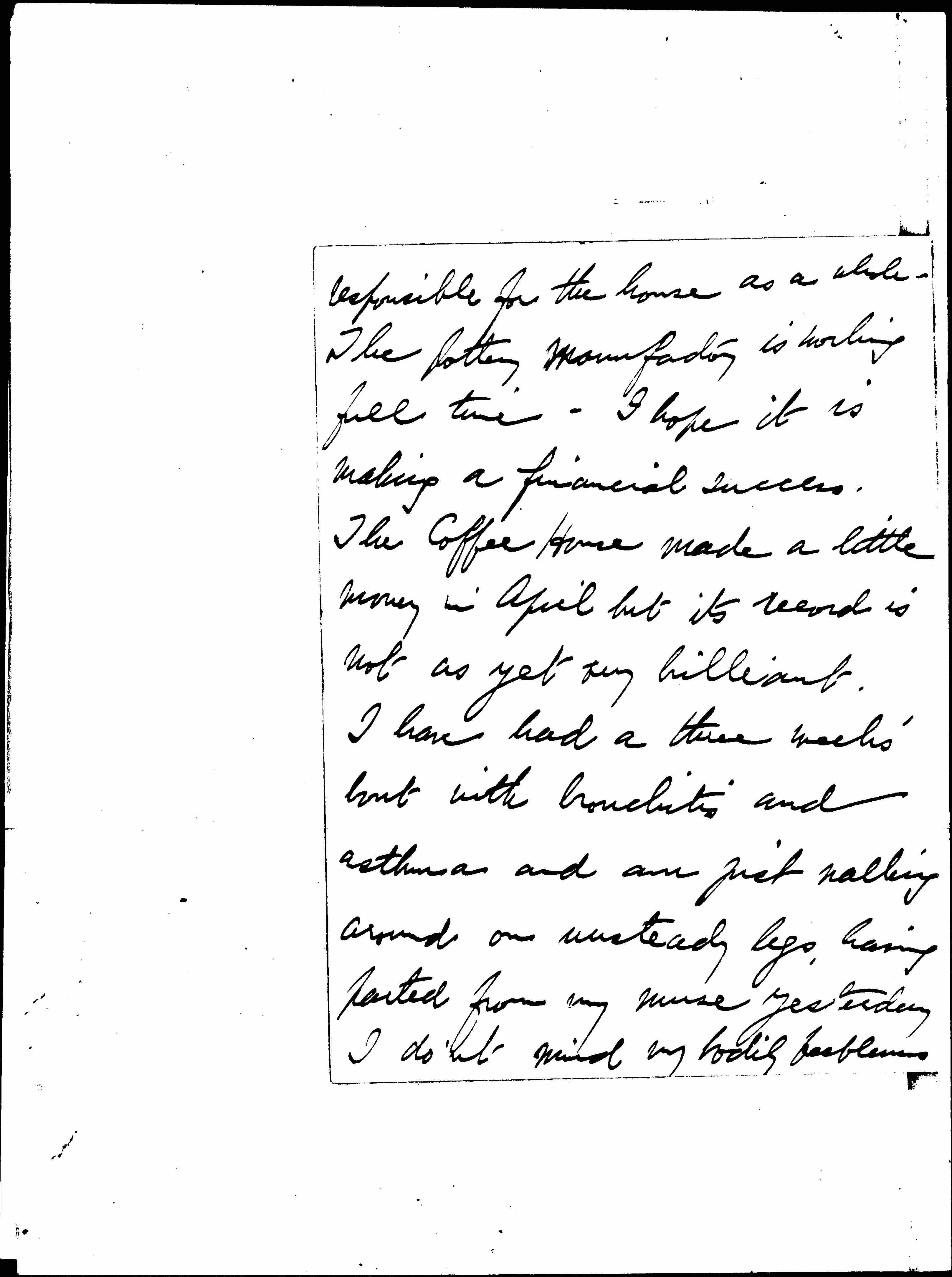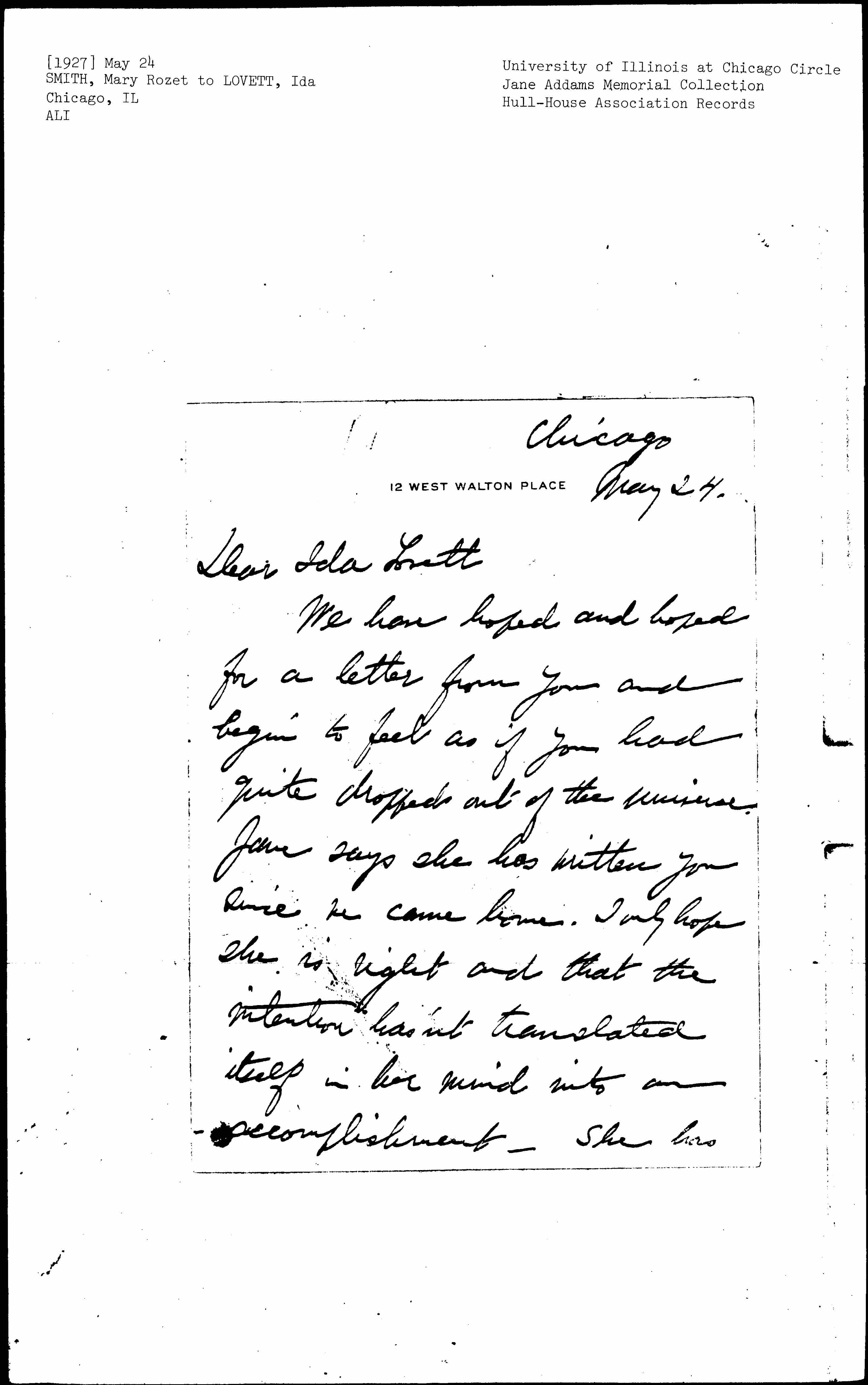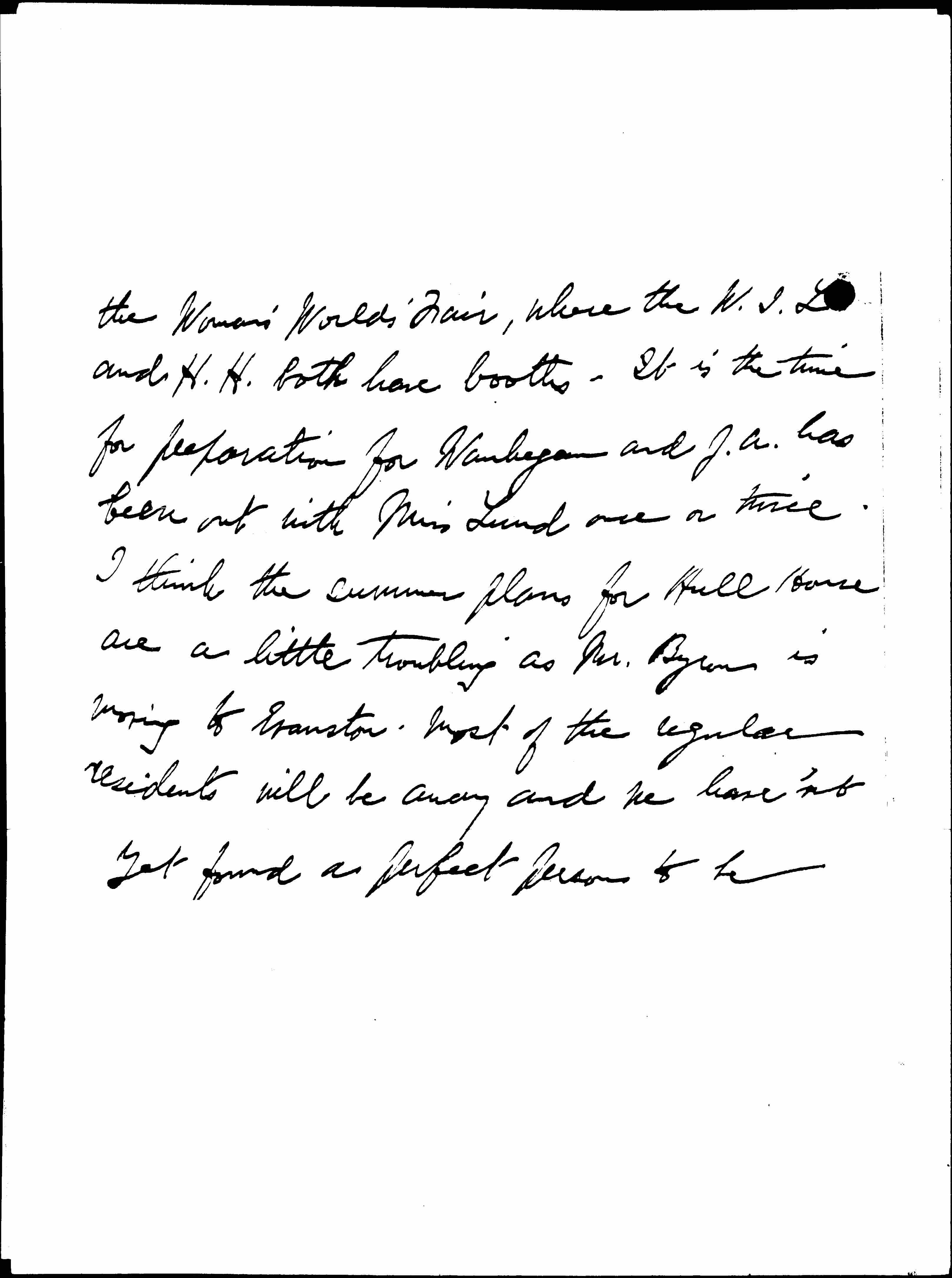 Now she is running to and fro between Hull House and [page 3] the Woman's World's Fair, where the W.I.L. and H.H. both have booths. It is the time for preparation for Waukegan and J. A. has been out with Miss Lund once or twice. I think the summer plans for Hull House are a little troubling as Mr. Byron is moving to Evanston. Most of the regular residents will be away and we haven't yet found a perfect person to be [page 4] responsible for the house as a whole. The pottery manufactory is working full time. I hope it is making a financial success. The Coffee House made a little money in April but its record is not as yet very brilliant.