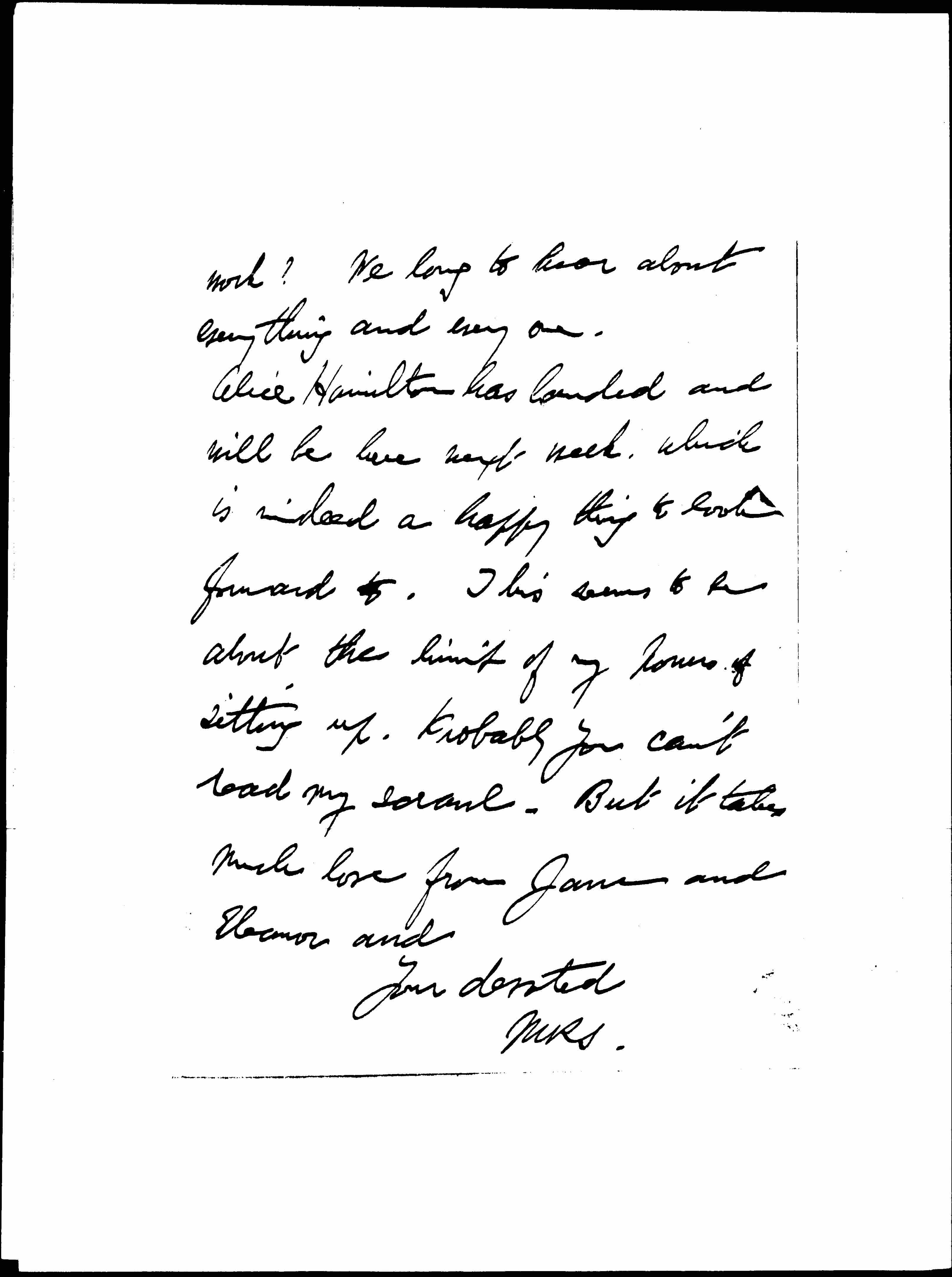 Alice Hamilton has landed and will be here next week, which is indeed a happy thing to look forward to. This seems to be about the limit of my hours of sitting up. Probably you can't read my scrawl. But it takes much love from Jane and Eleanor and