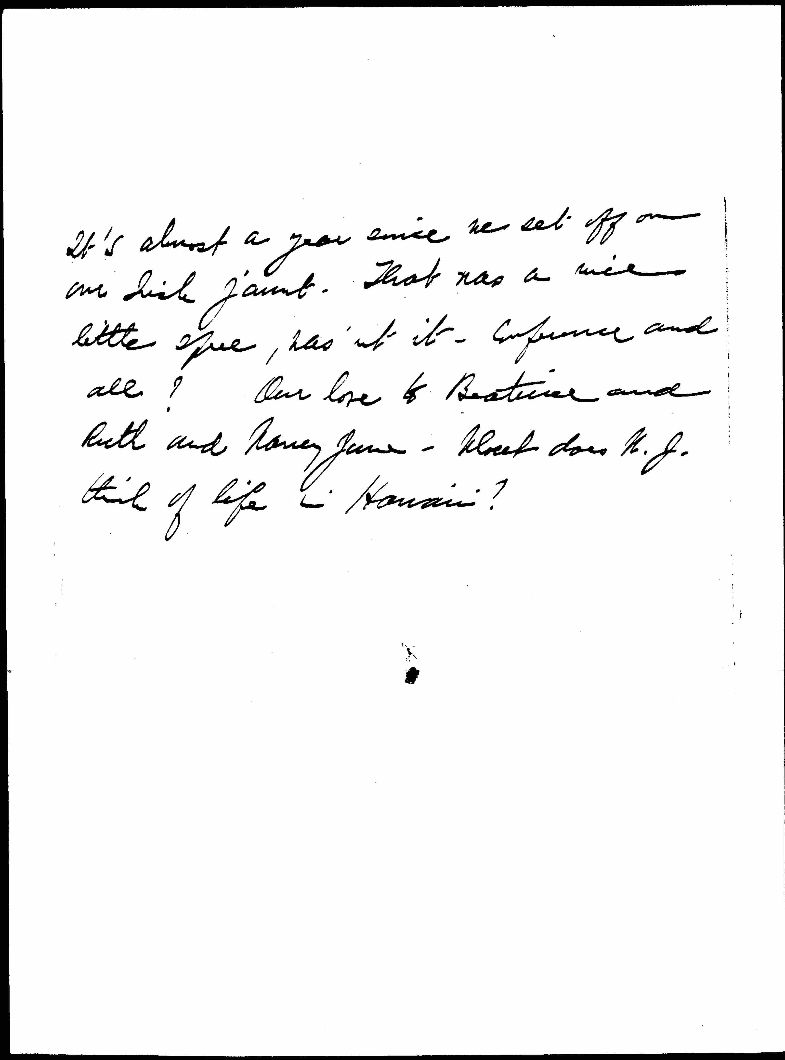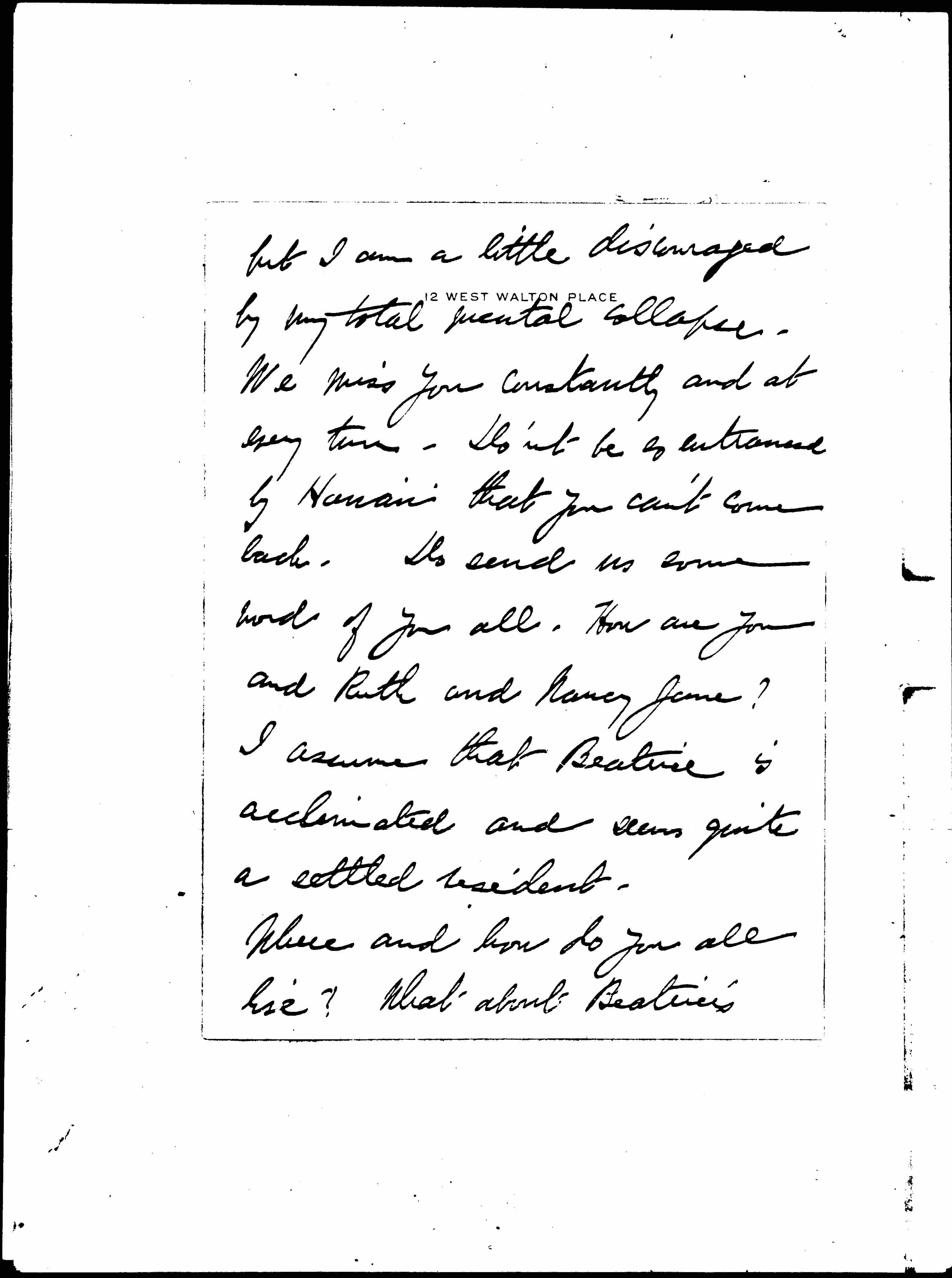 I have had a three weeks' bout with bronchitis and asthma and am just walking around on unsteady legs, having parted from my nurse yesterday. I don't mind my bodily feebleness [page 5] but I am a little discouraged by my total mental collapse. We miss you constantly and at every turn. Don't be so entranced by Hawaii that you can't come back. Do send us some word of you all. How are you and Ruth and Nancy Jane? I assume that Beatrice is acclimated and seems quite a settled resident.