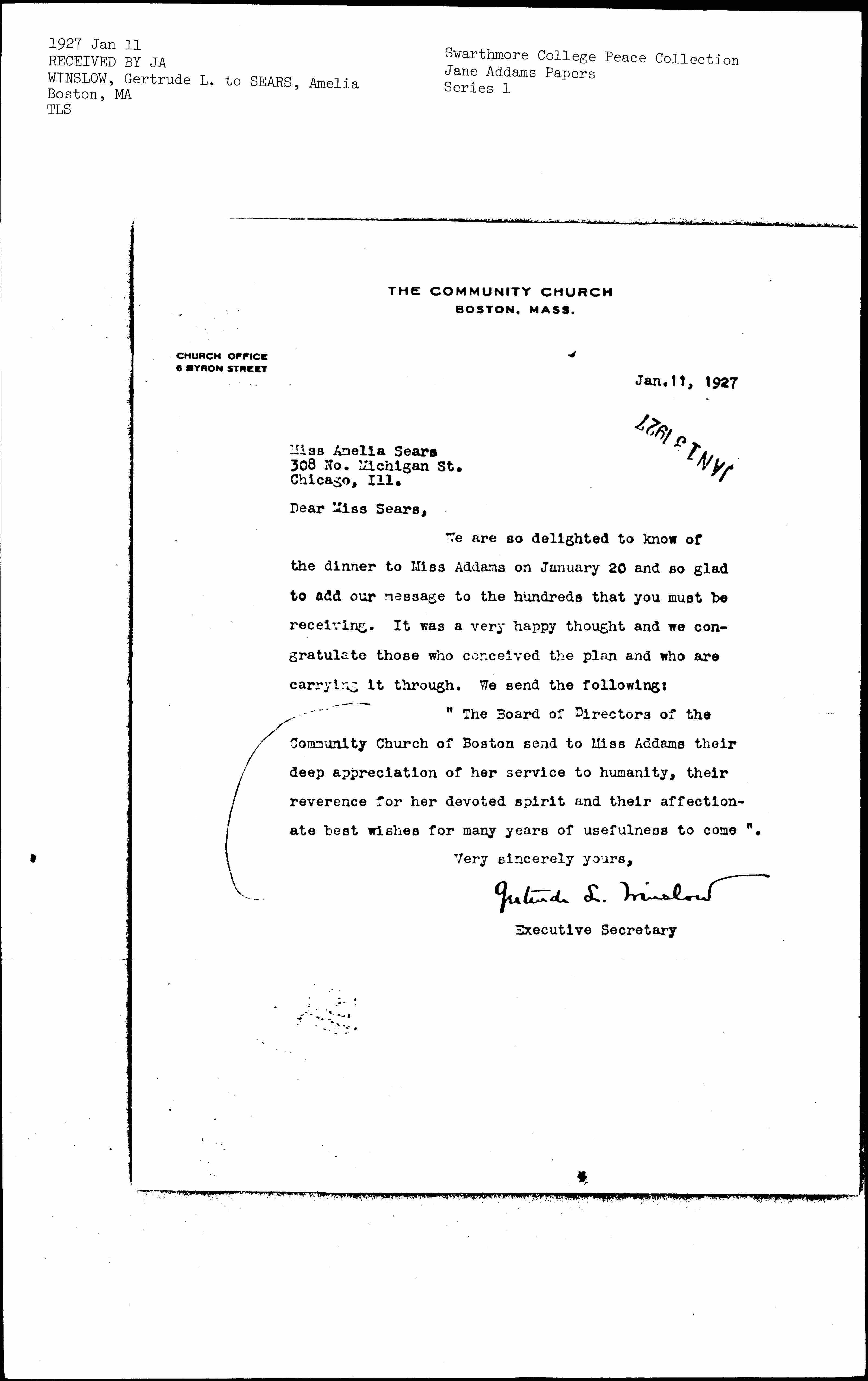 "The Board of Directors of the Community Church of Boston send to Miss Addams their deep appreciation of her service to humanity, their reverence for her devoted spirit and their affectionate best wishes for many years of usefulness to come."