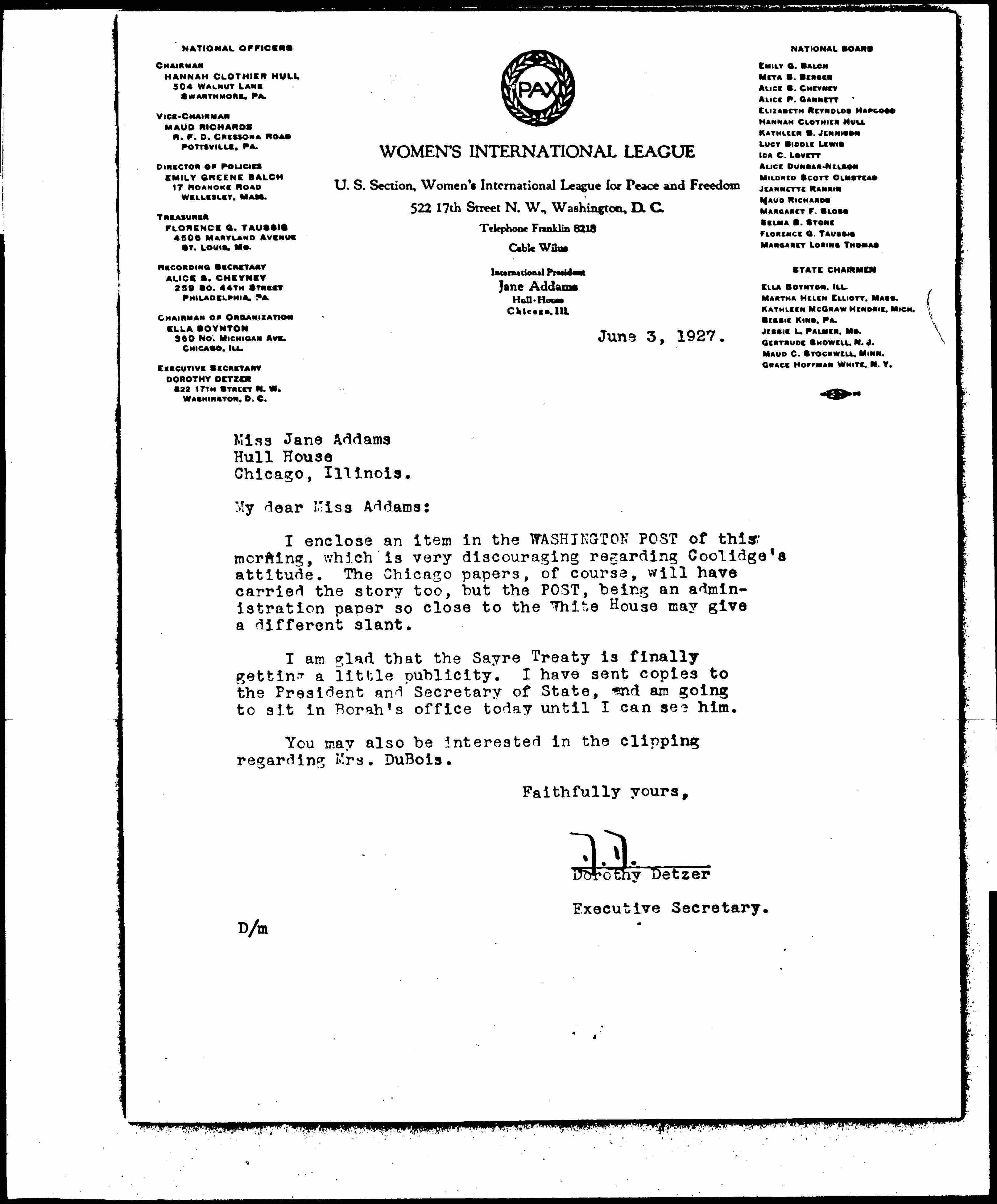 I am glad that the Sayre Treaty is finally getting a little publicity. I have sent copies to the President and Secretary of State, and am going to sit in Borah's office today until I can see him.