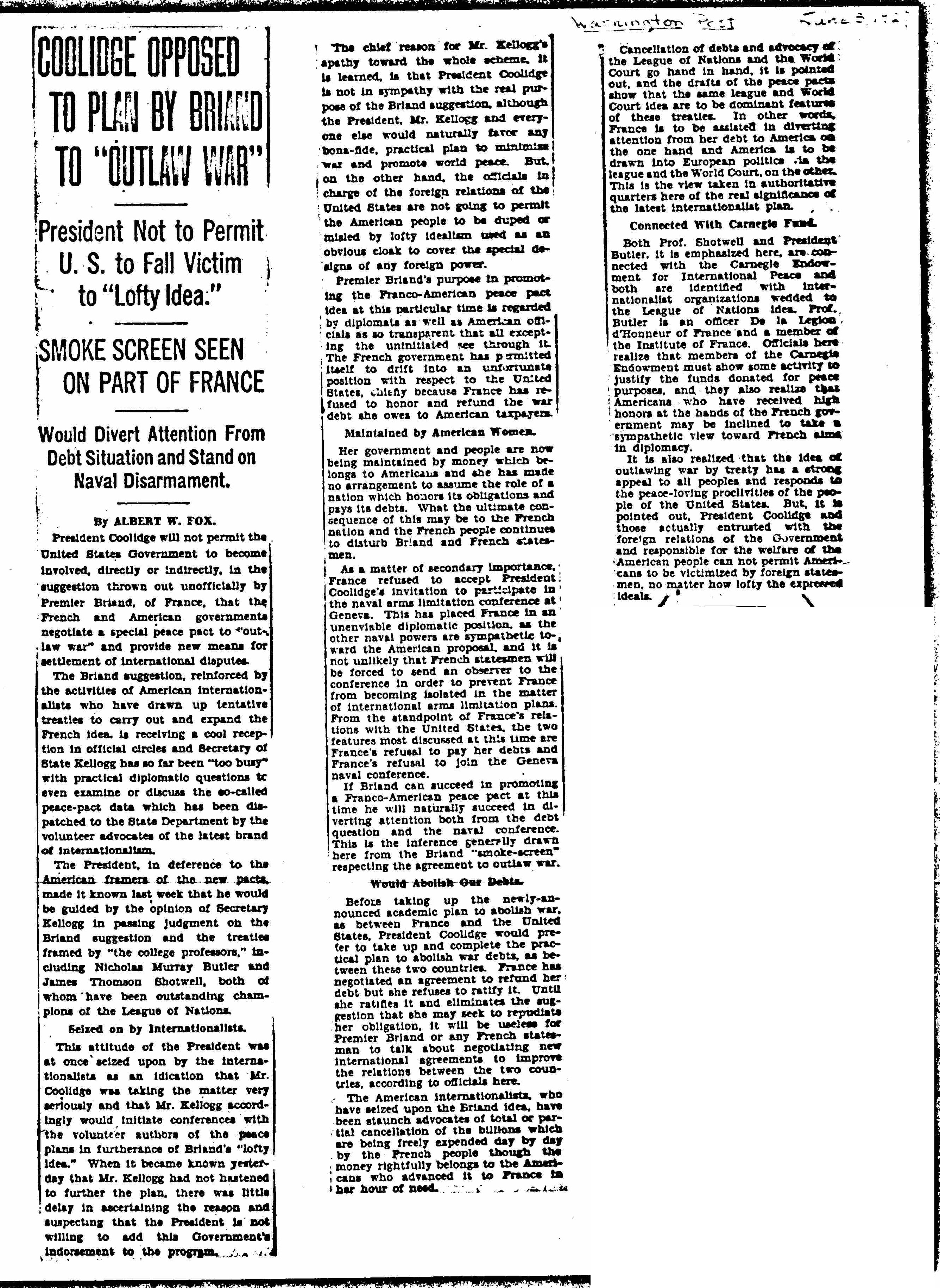 The chief reason for Mr. Kellogg's apathy toward the whole scheme, it is learned, is that President Coolidge is not in sympathy with the real purpose of the Briand suggestion, although the President, Mr. Kellogg and everyone else would naturally favor any bona-fide, practical plan to minimize war and promote world peace. But, on the other hand, the officials in charge of the foreign relations of the United States are not going to permit the American people to be duped or misled by lofty idealism used as an obvious cloak to cover the special designs of any foreign power.