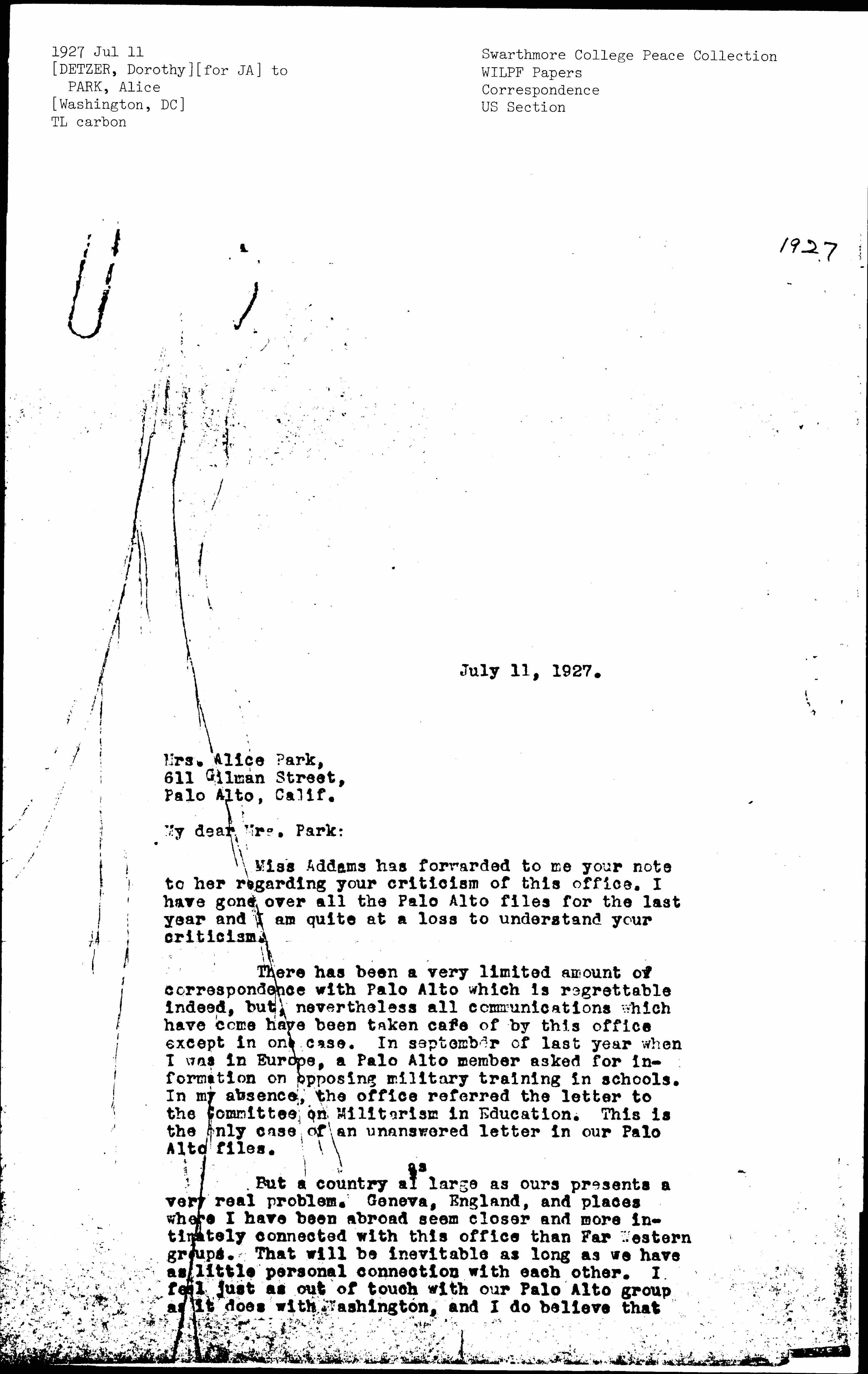 There has been a very limited amount of correspondence with Palo Alto which is regrettable indeed, but, nevertheless all communications which have come have been taken care of by this office except in one case. In September of last year when I was in Europe, a Palo Alto member asked for information on opposing military training in schools. In my absence, the office referred the letter to the Committee on Militarism in Education. This is the only case of an unanswered letter in our Palo Alto files.
