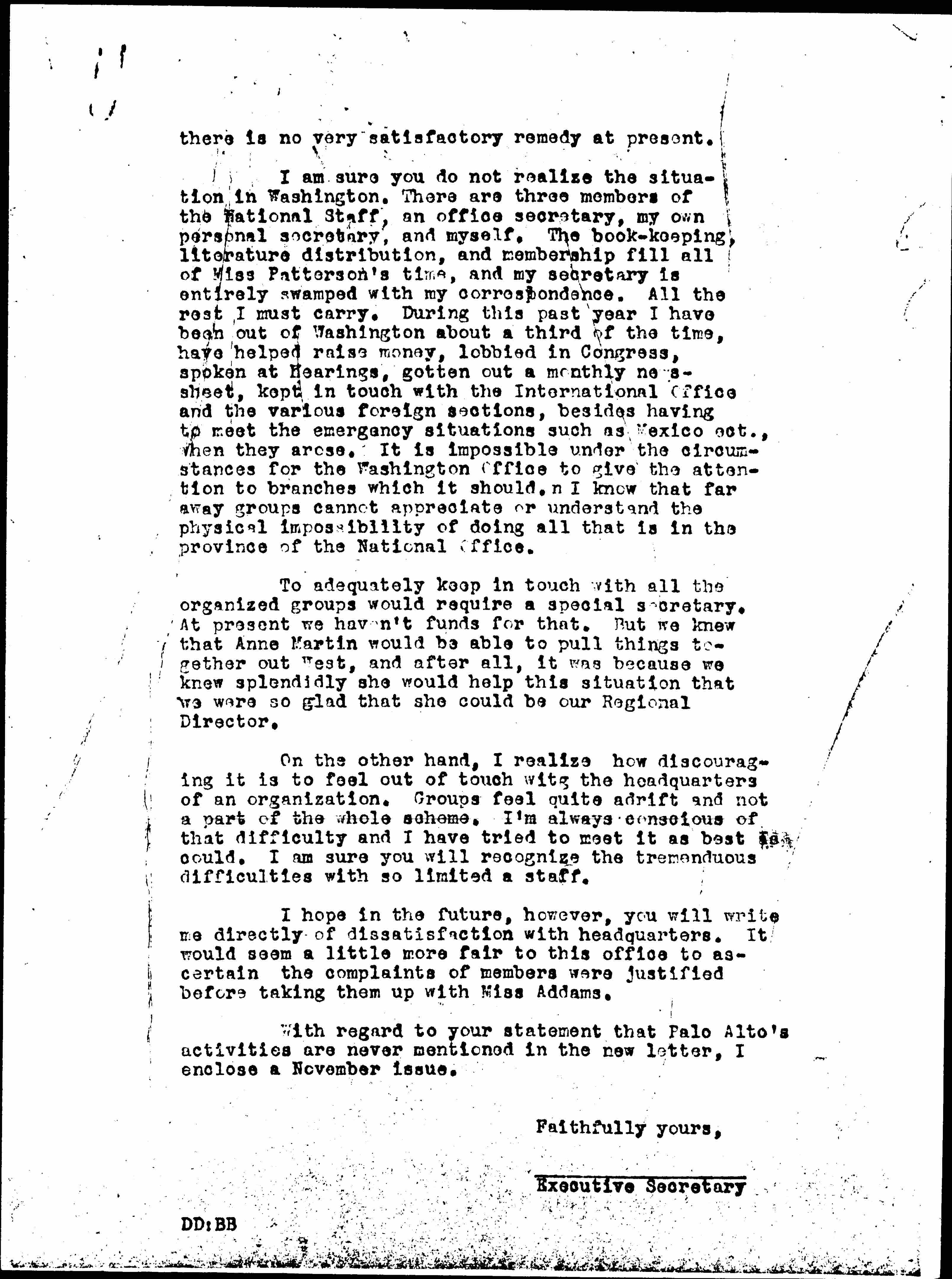 I am sure you do not realize the situation in Washington. There are three members of the National Staff, an office secretary, my own personal secretary, and myself. The book-keeping, literature distribution, and membership fill all of Miss Patterson's time, and my secretary is entirely swamped with my correspondence. All the rest I must carry. During this past year I have been out of Washington about a third of the time, have helped raise money, lobbied in Congress, spoken at hearings, gotten out a monthly newssheet, kept in touch with the International Office and the various foreign sections, besides having to meet the emergency situations such as Mexico etc., when they arose. It is impossible under the circumstances for the Washington Office to give the attention to branches which it should. I know that far away groups cannot appreciate or understand the physical impossibility of doing all that is in the province of the National Office.